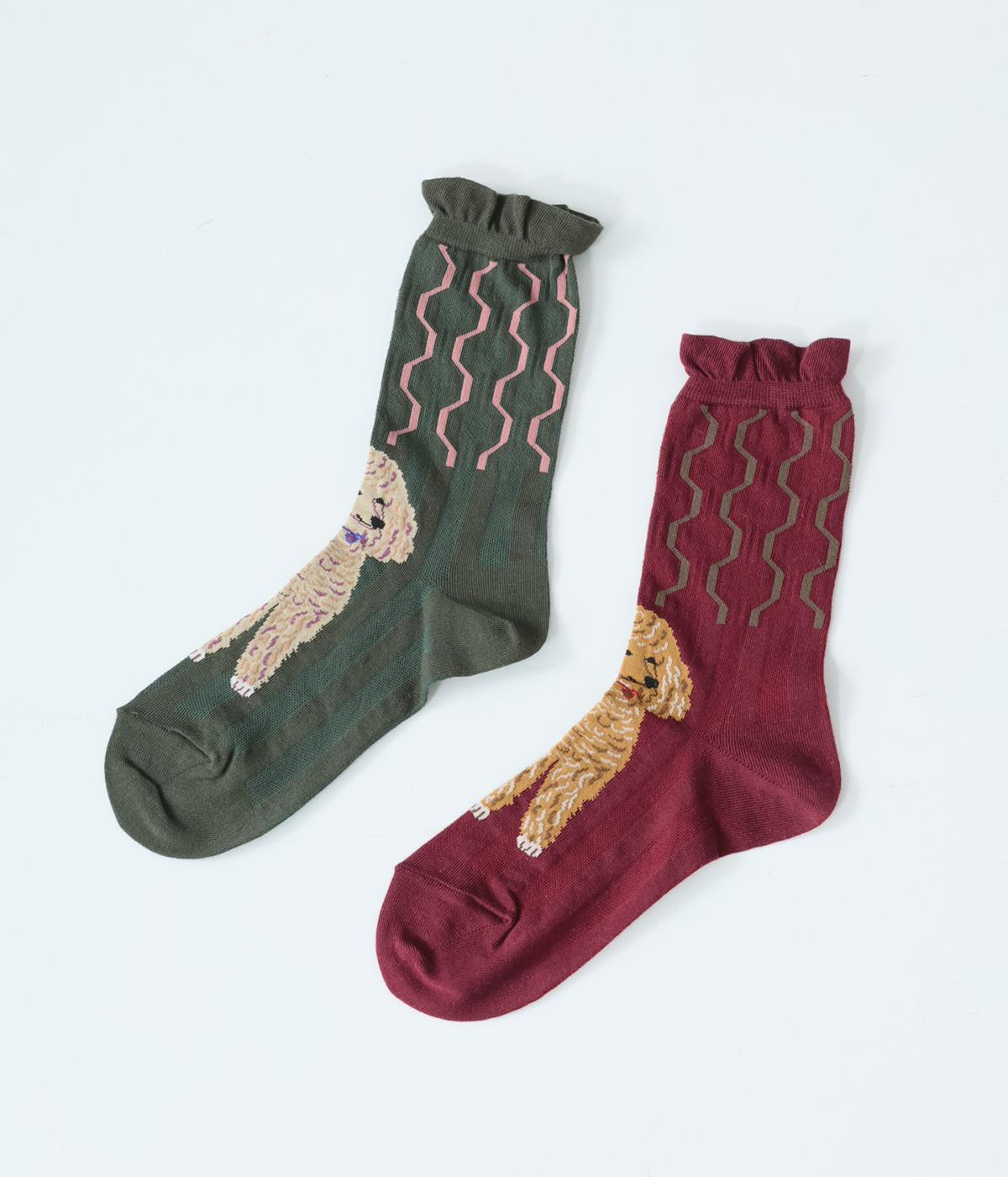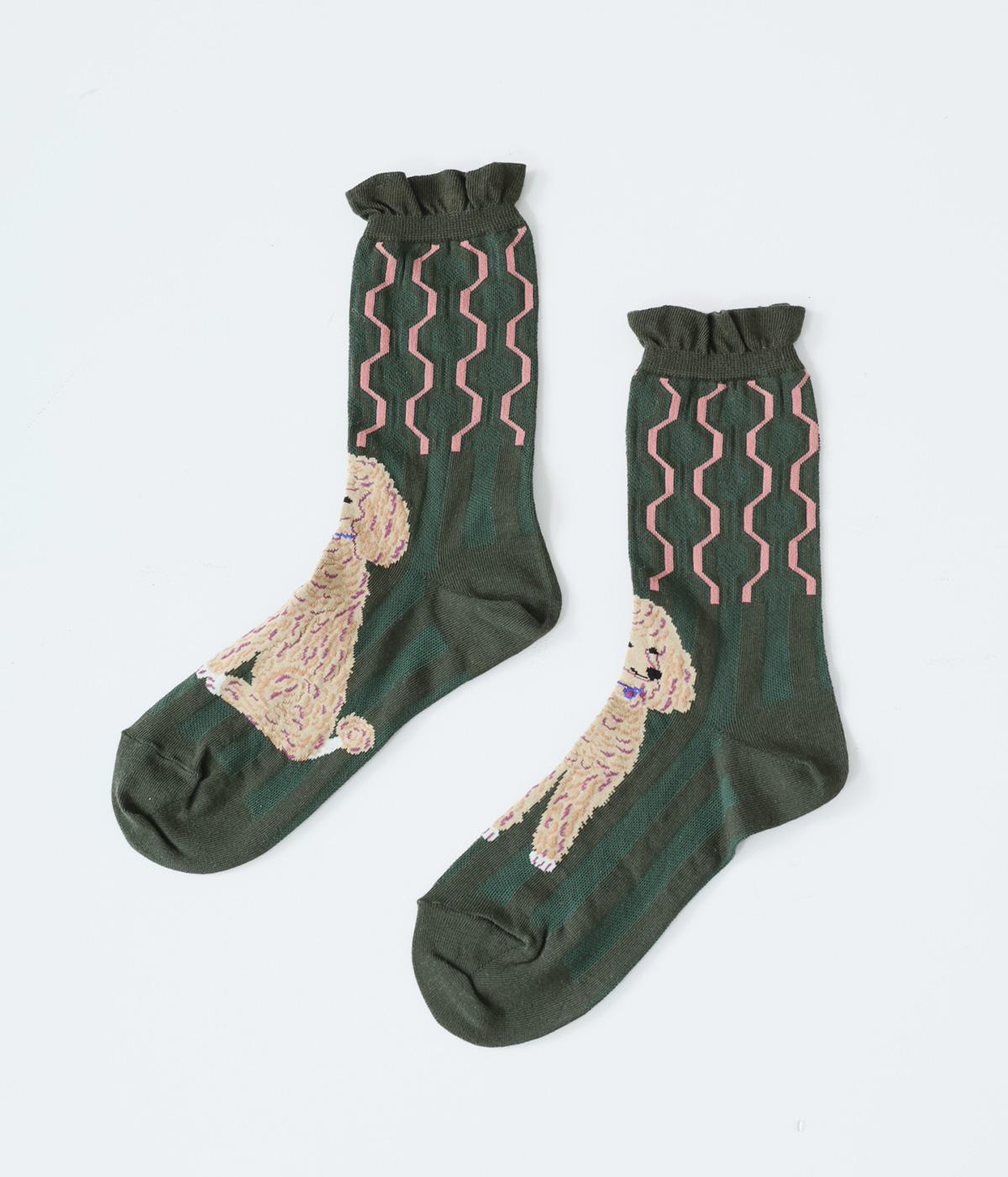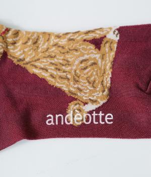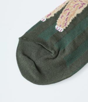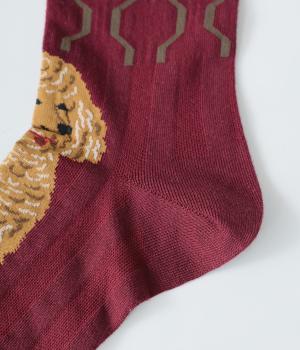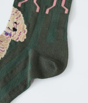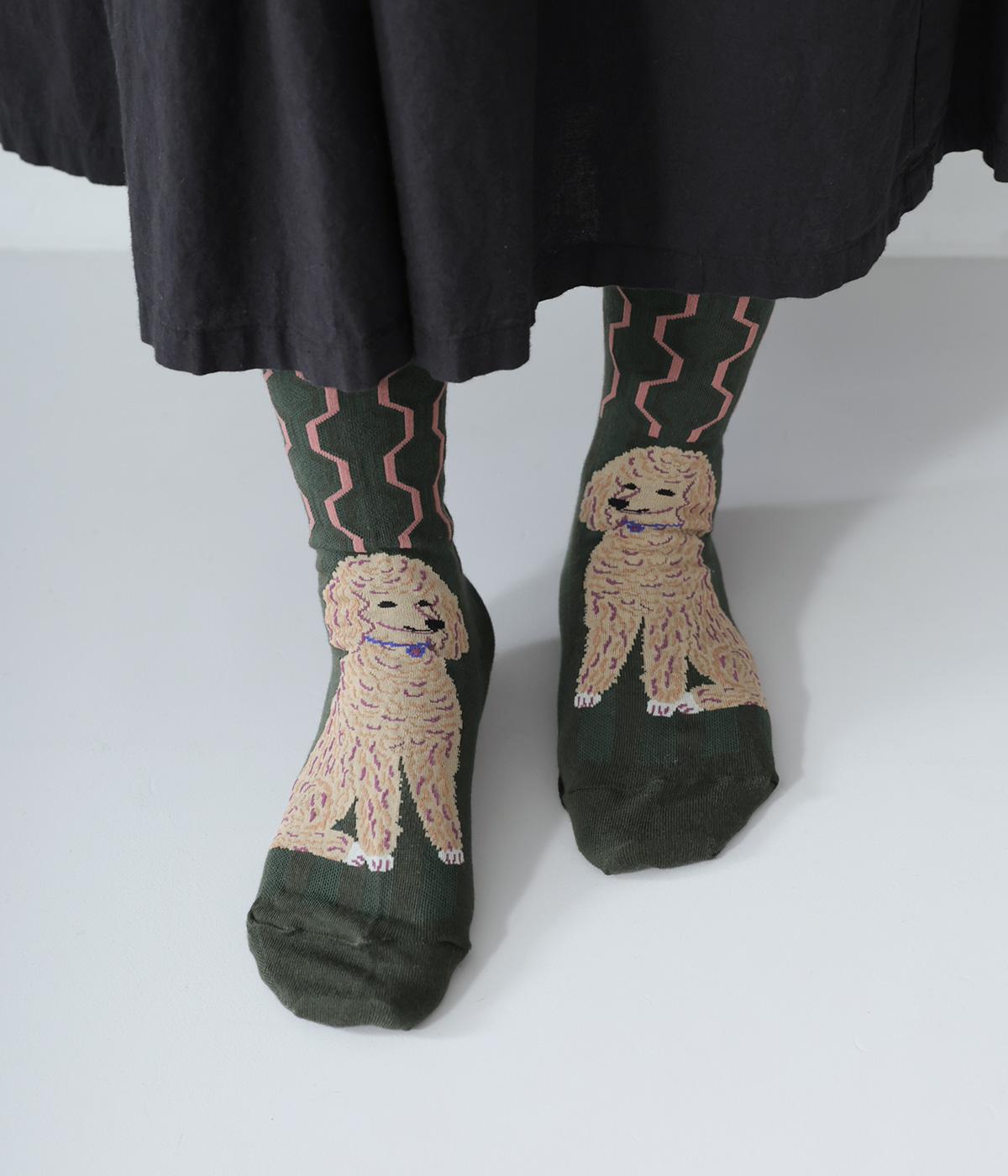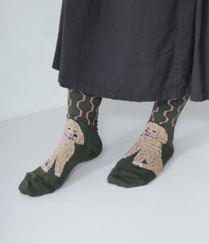 かわいらしい犬を大胆に描いたインパクトたっぷりなソックス。メインのデザインを甲部分にあしらった、新鮮なムードを運ぶ一足です。パンプスなど、甲が開いたシューズと合わせるのがおすすめ。