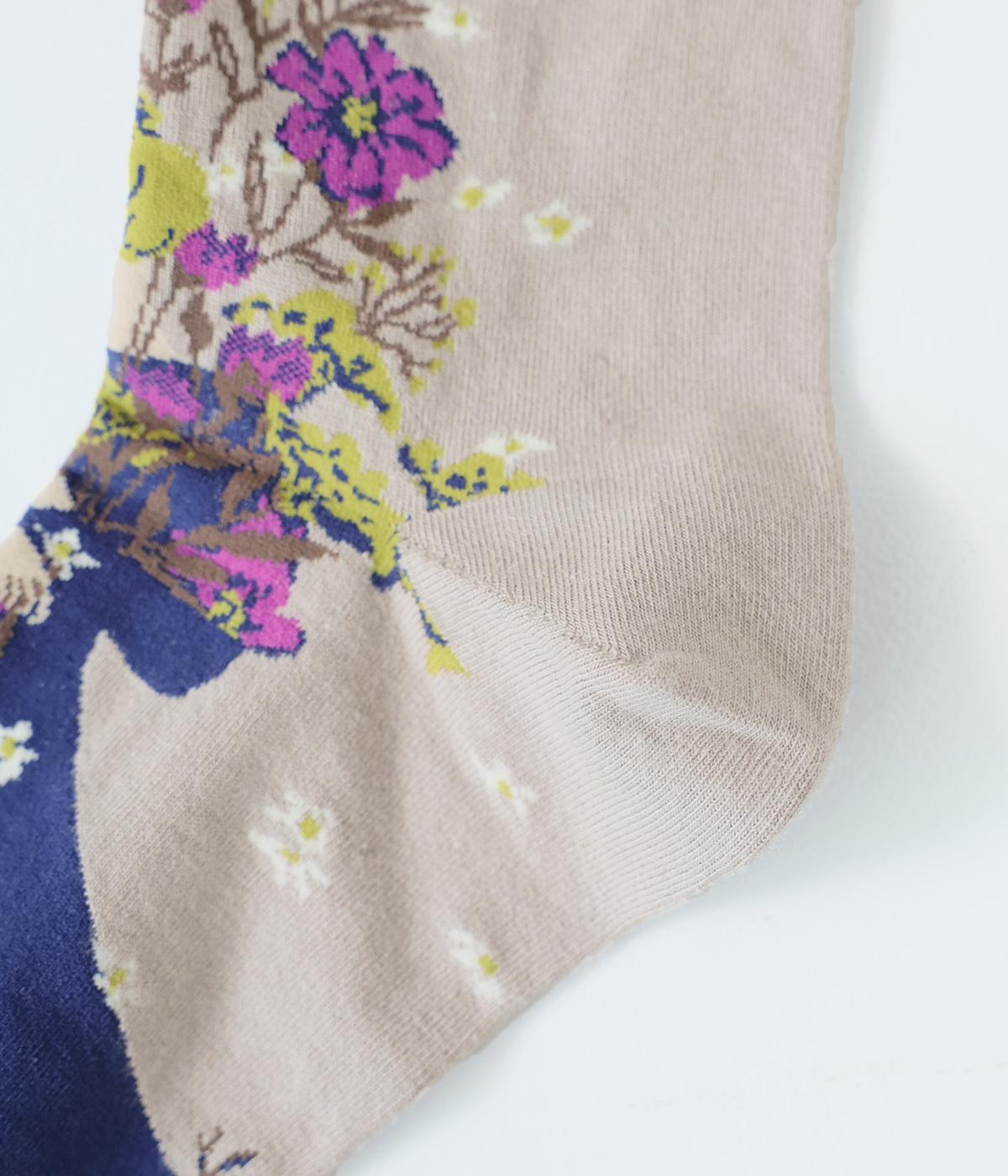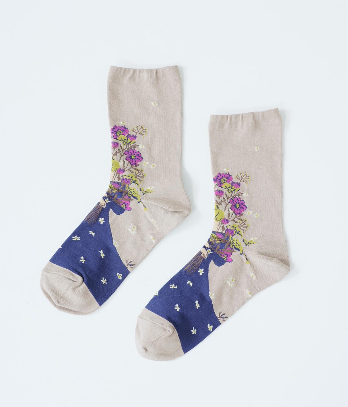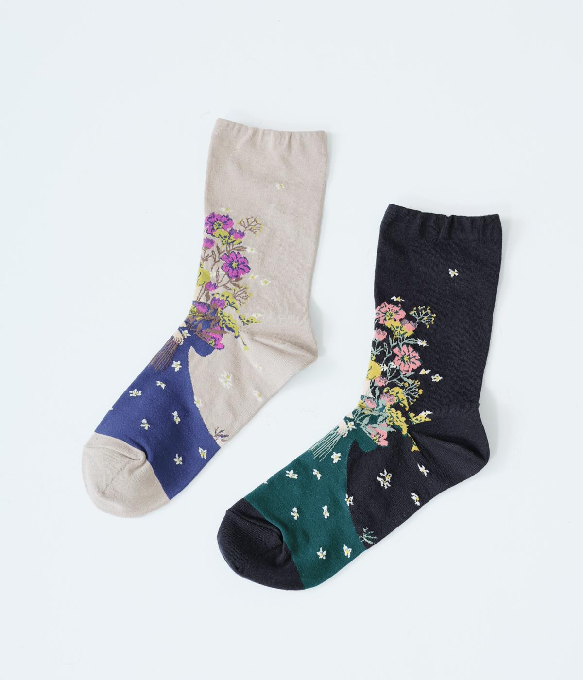 大きな花束を抱える女性が描かれた、幸福感たっぷりのソックスです。華やかながらも大人っぽい配色にまとめているので、きれいめな装いにも合わせやすいのが◎。編み目が細かいからこそできる、繊細な柄の表現に注目です。