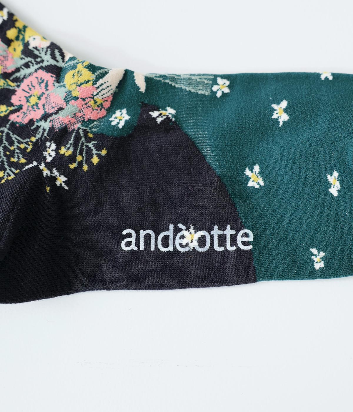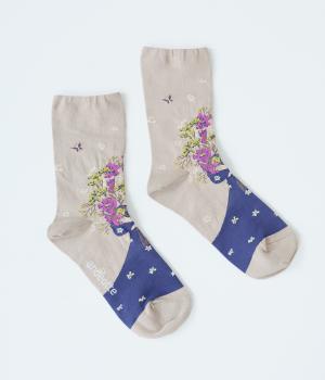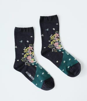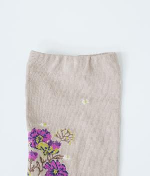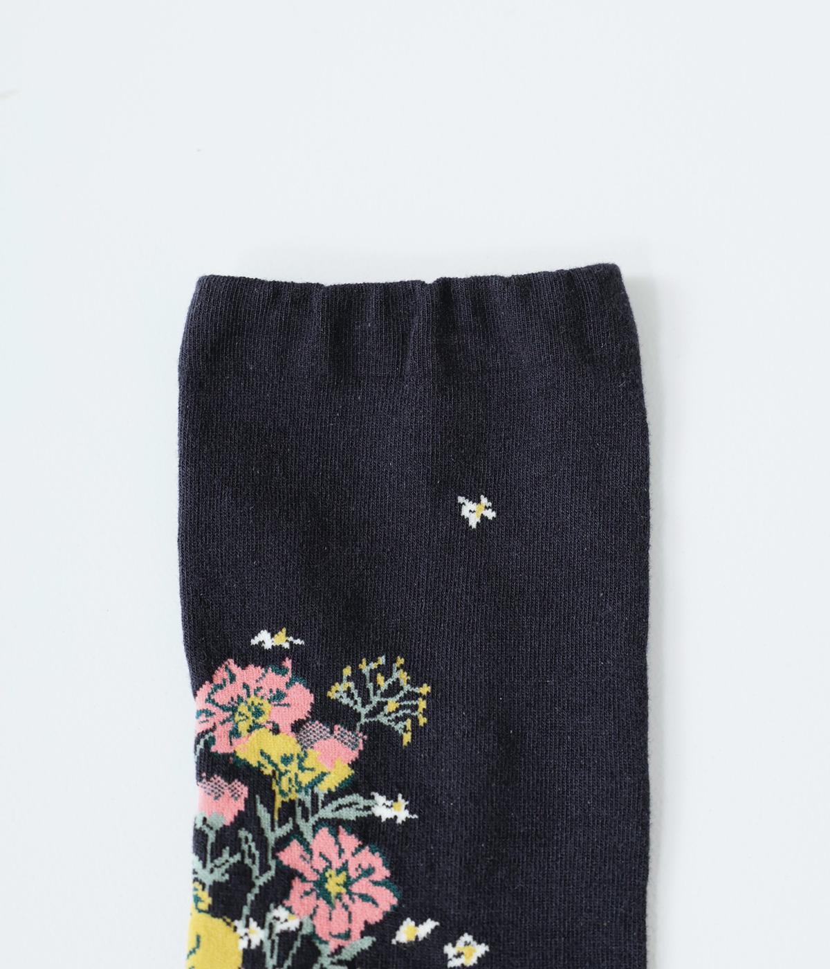 大きな花束を抱える女性が描かれた、幸福感たっぷりのソックスです。華やかながらも大人っぽい配色にまとめているので、きれいめな装いにも合わせやすいのが◎。編み目が細かいからこそできる、繊細な柄の表現に注目です。