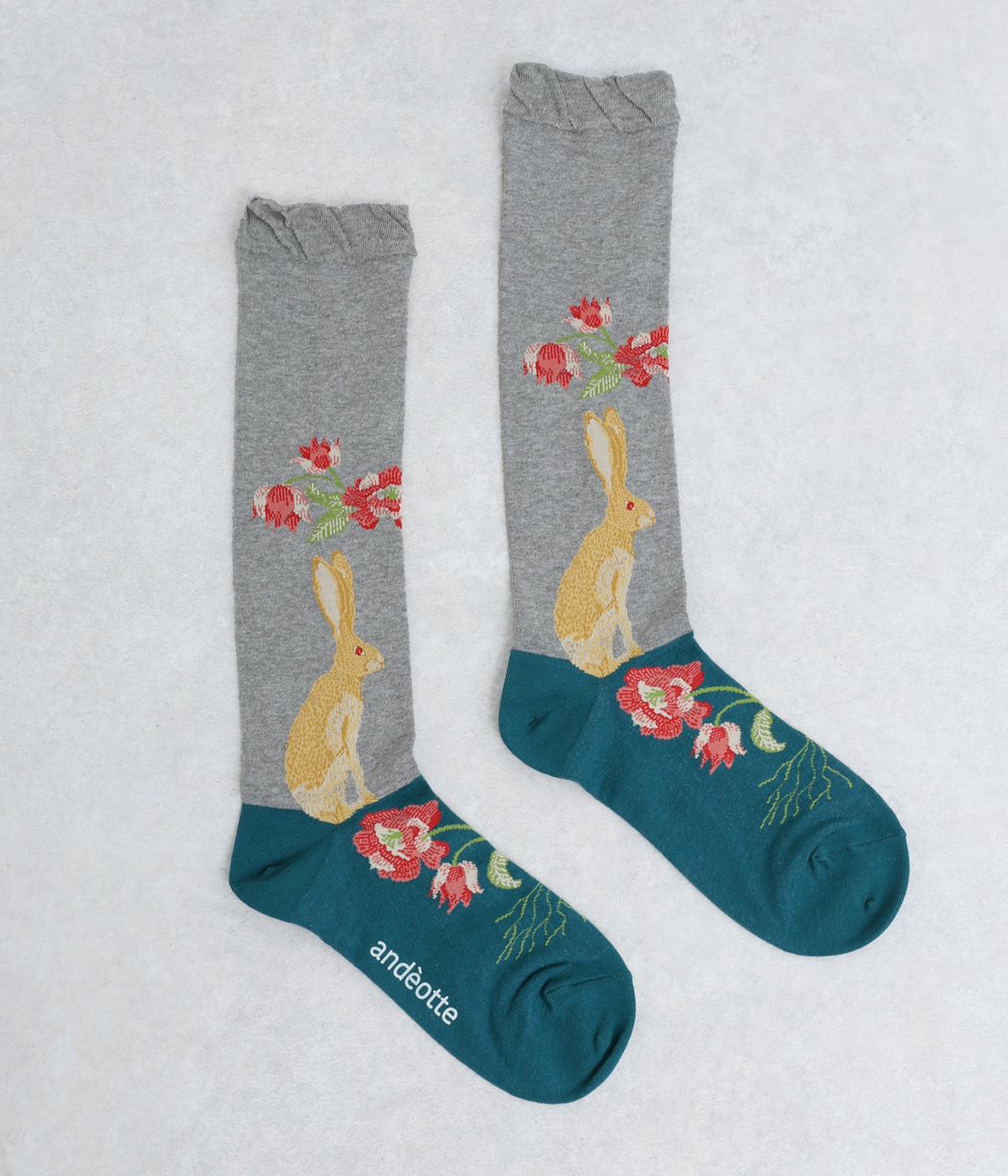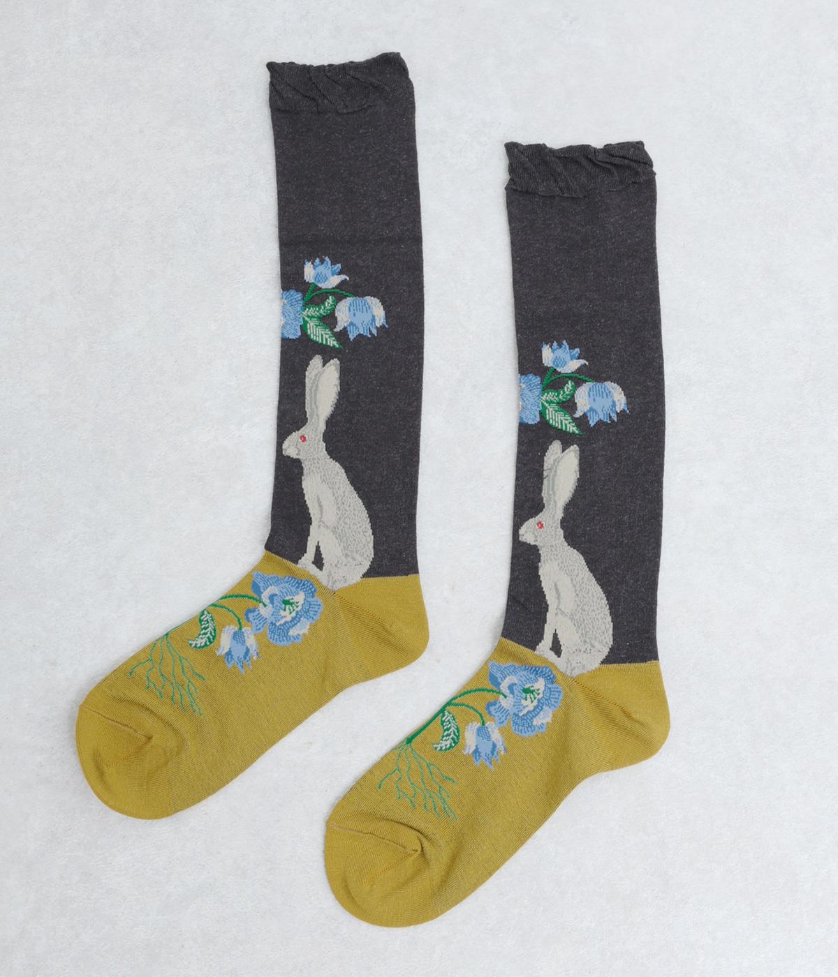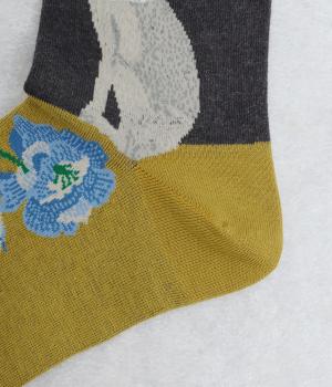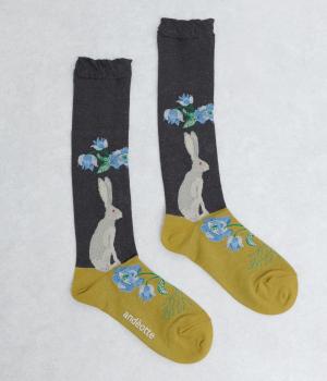 うさぎとお花を描いた、大胆で繊細な柄が目を引くソックス。ベースは落ち着いた配色なので、いつもの装いになじみやすいのが魅力です。足の甲まで華やかなデザインが広がり、シューズを脱いだ瞬間も気分を盛り上げます。