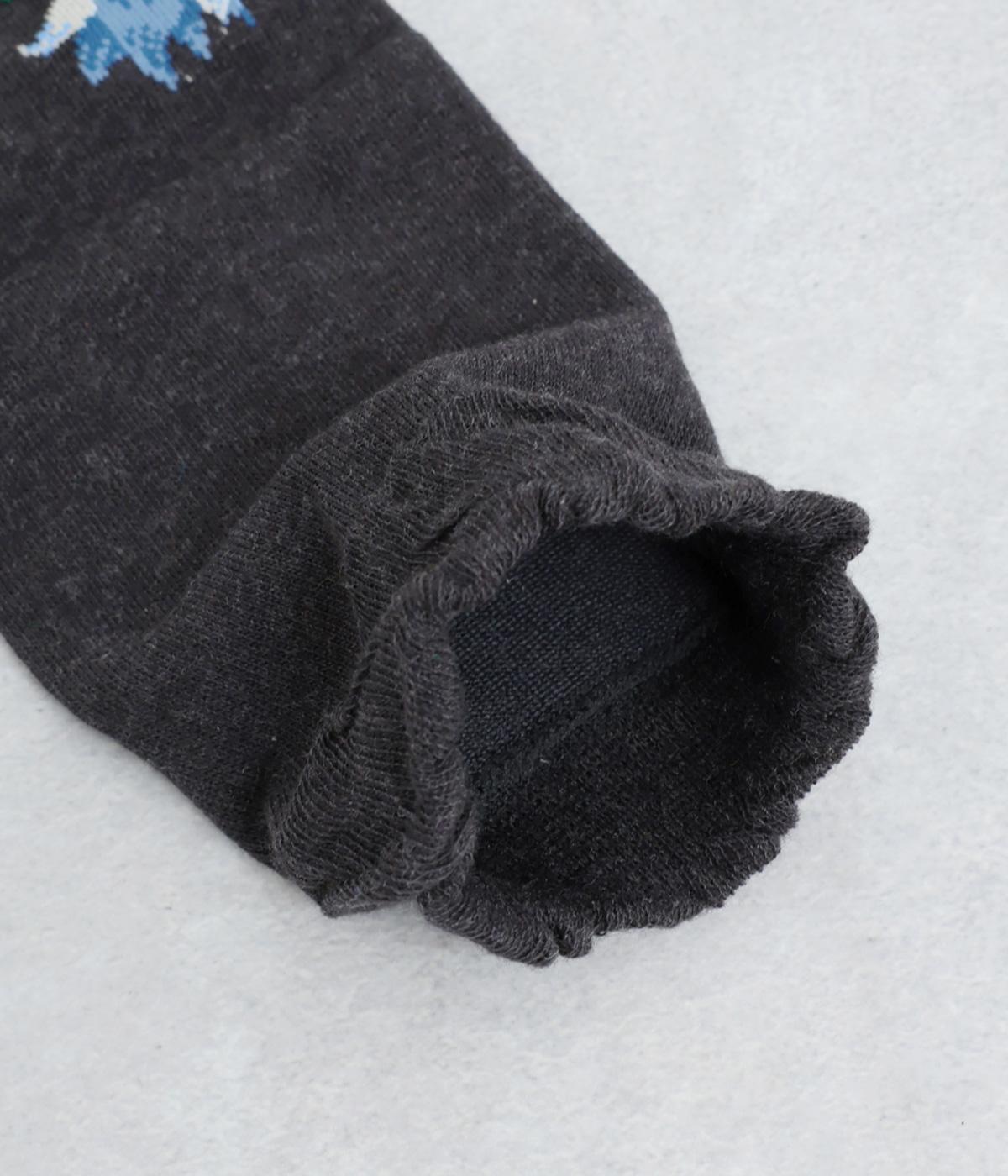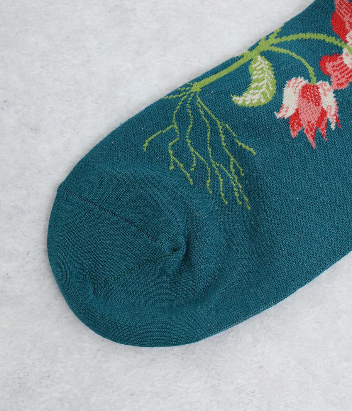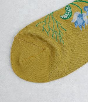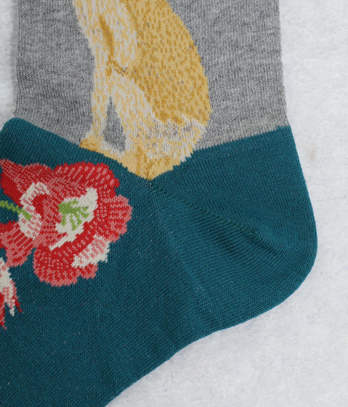 うさぎとお花を描いた、大胆で繊細な柄が目を引くソックス。ベースは落ち着いた配色なので、いつもの装いになじみやすいのが魅力です。足の甲まで華やかなデザインが広がり、シューズを脱いだ瞬間も気分を盛り上げます。