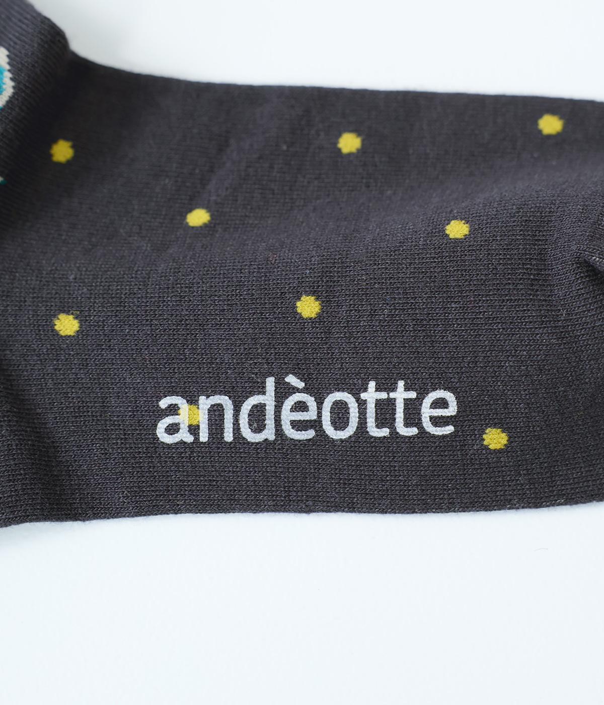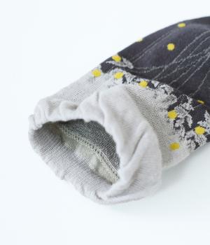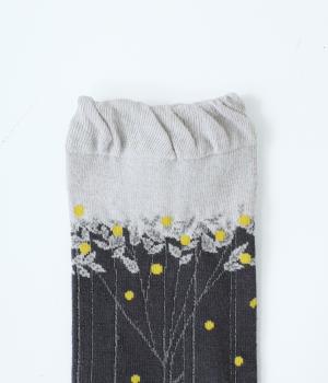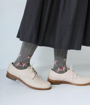 馬に乗り果物狩りをたのしむ人々を表現した、繊細な柄が目を引くソックスです。ドット柄のように見える鮮やかな果物がアクセントに。ひざ下まで心地よく包み込むハイソックスタイプで、脚のラインをきれいに見せてくれます。