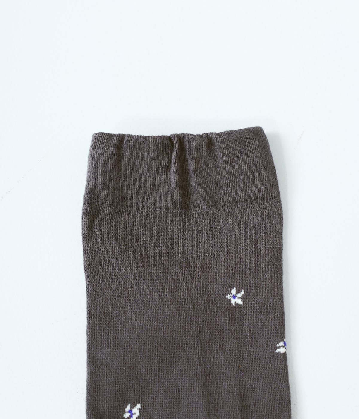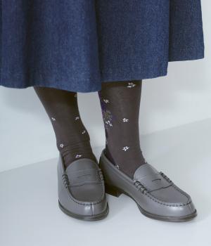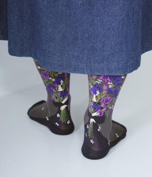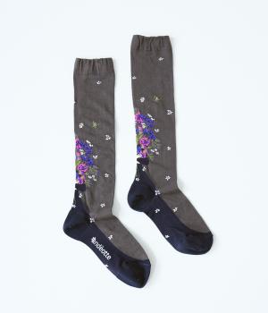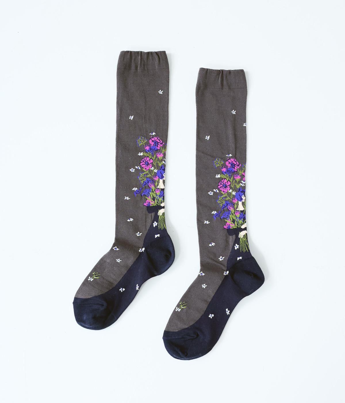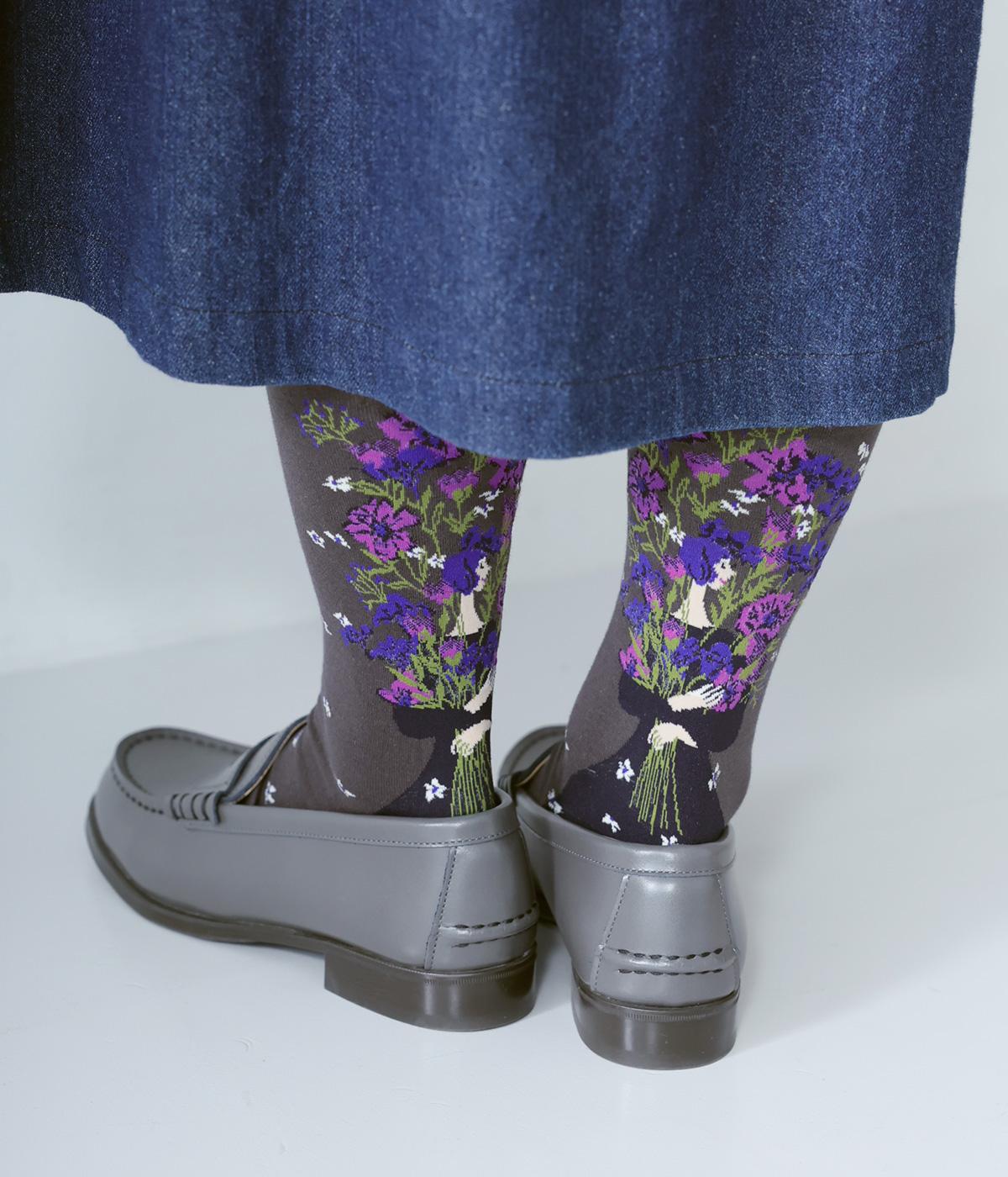 体よりも大きな花束を抱える女性が描かれた、幸福感あふれるハイソックスです。背面を中心にほどこされたデザインが、後ろ姿の華やかさをアップ。全体に散りばめられた小さなお花も愛らしいポイントです。