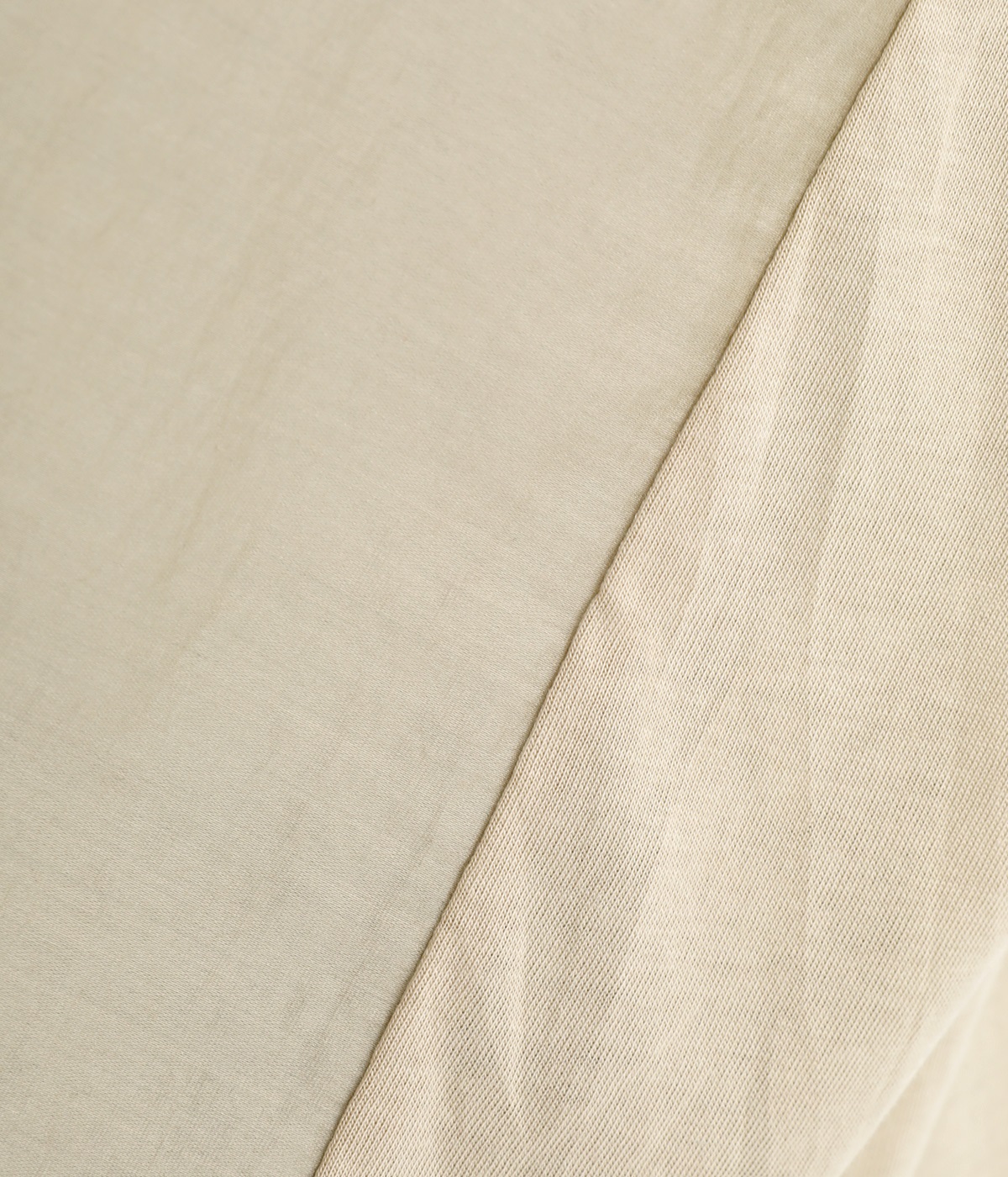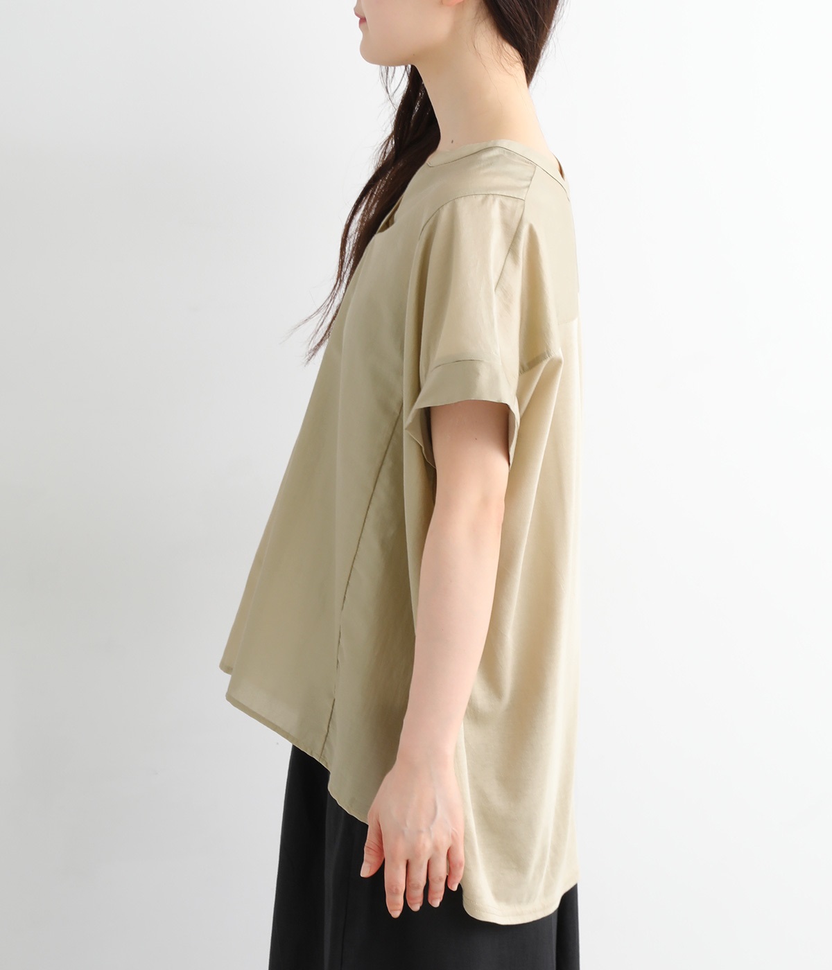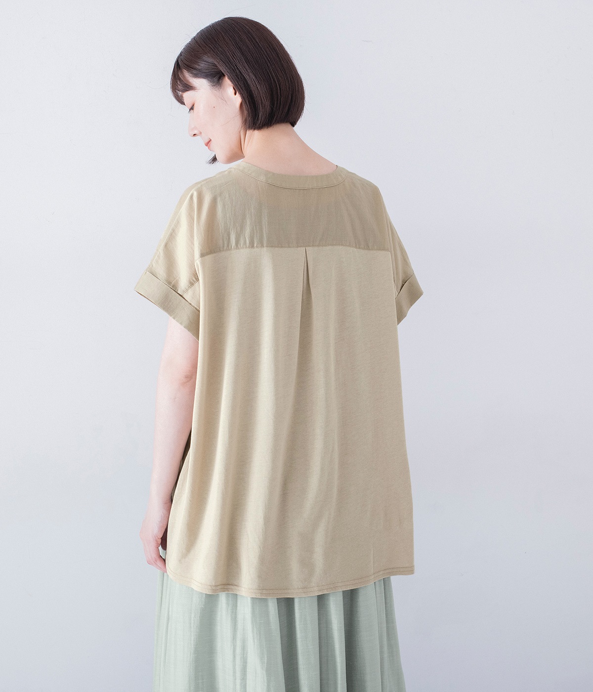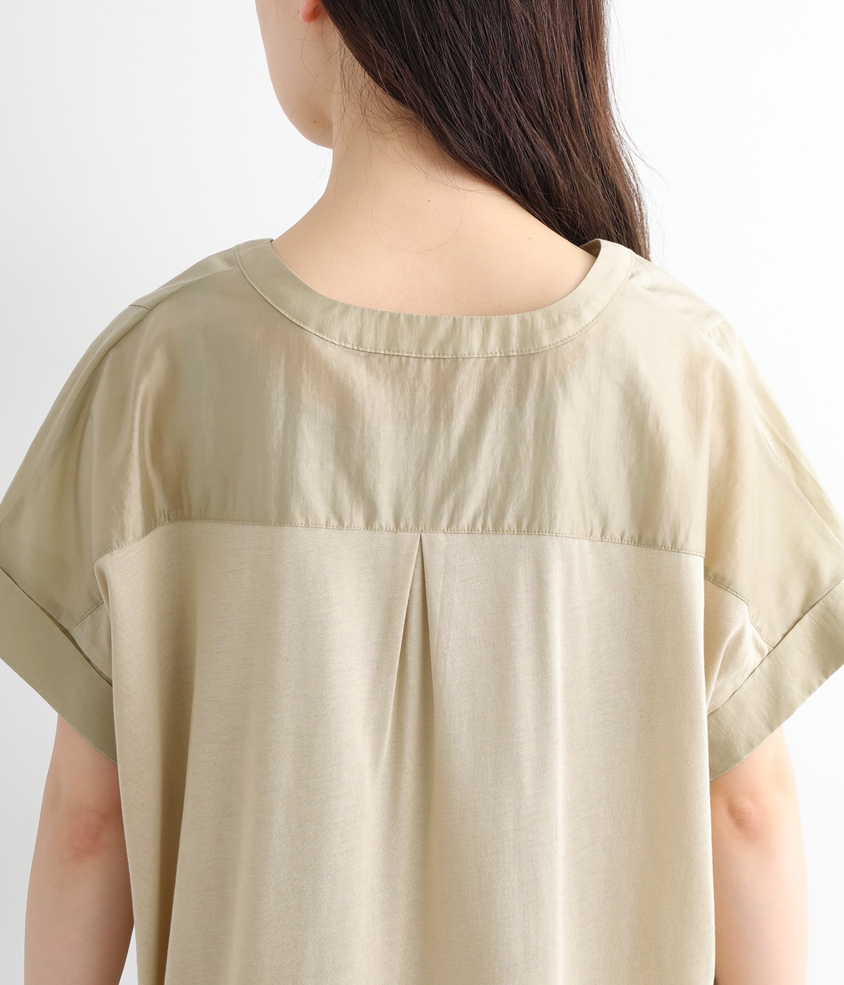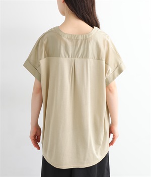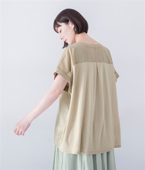 後ろはモダールのヨーク切り替えに、大きなタックを入れてアクセントに。前身頃とは異なるシルクのような滑らかな肌触りと、吸湿性の高いカットソー素材です。