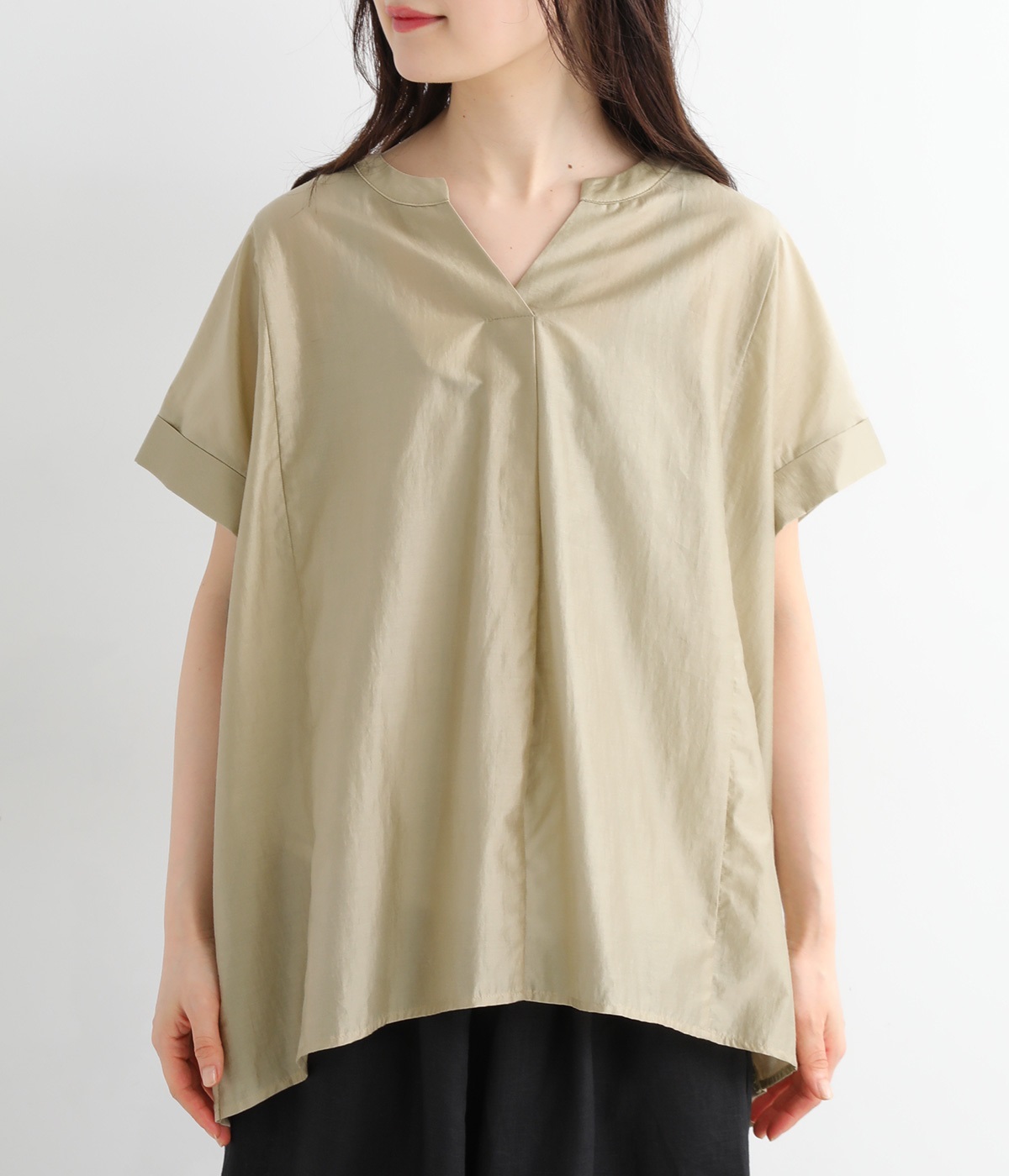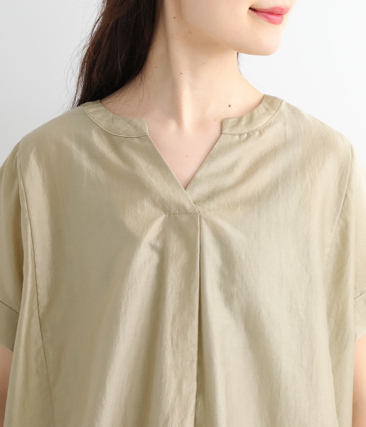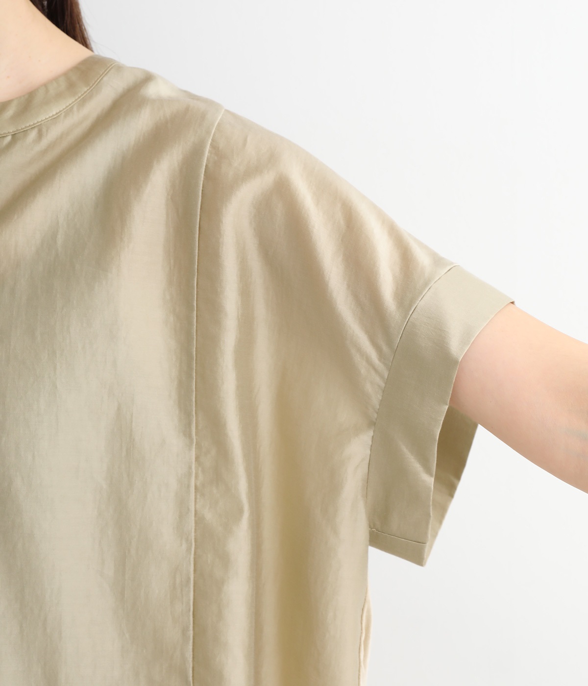 程よい開きのVネックと、風通しのよい袖口がポイントです。サイドに切り替えを入れることで縦ラインが強調されてすっきり。