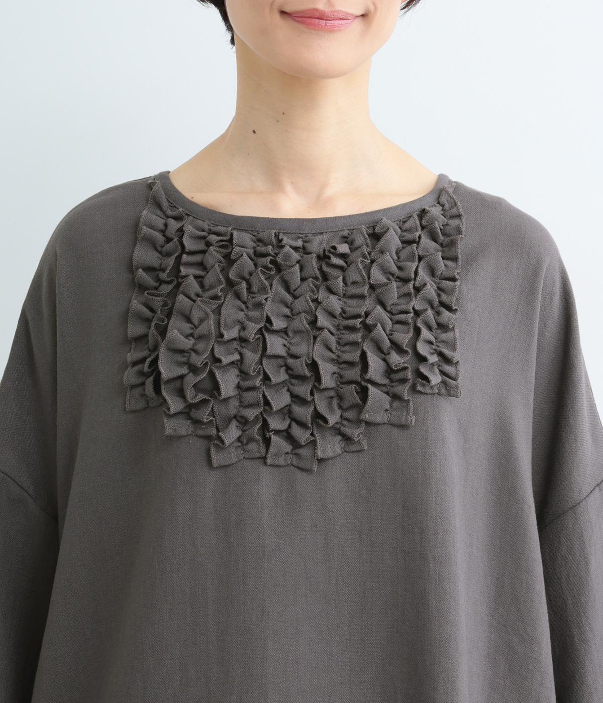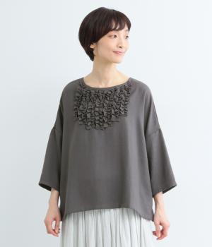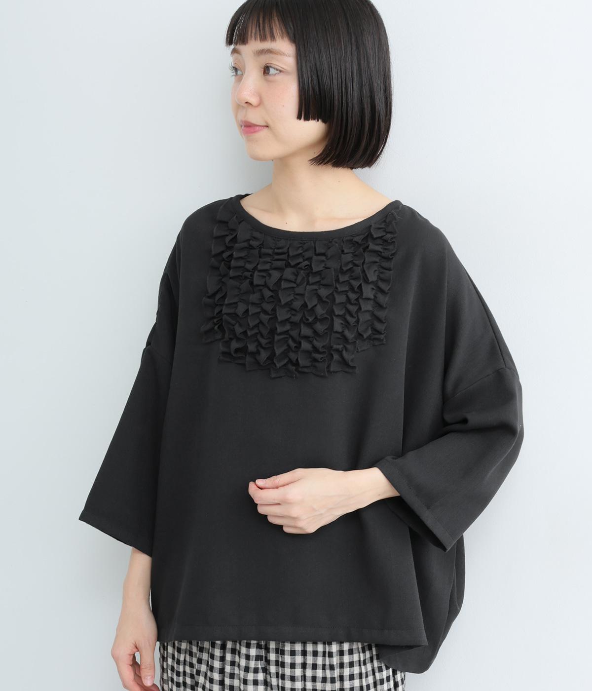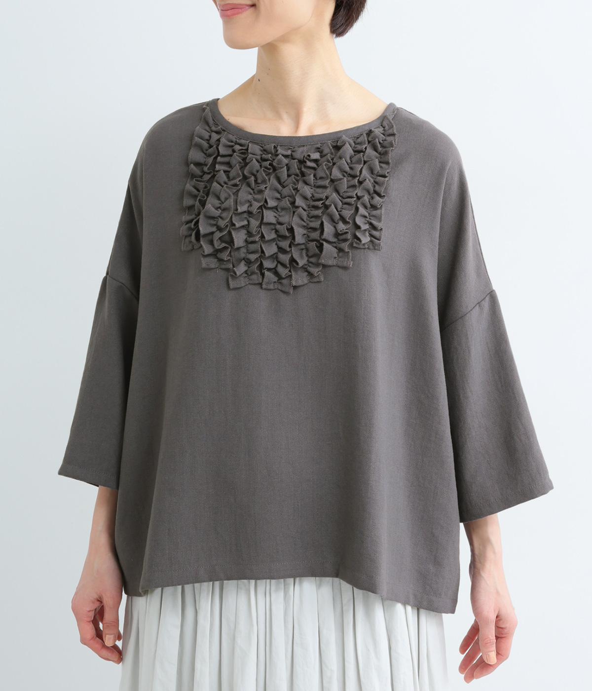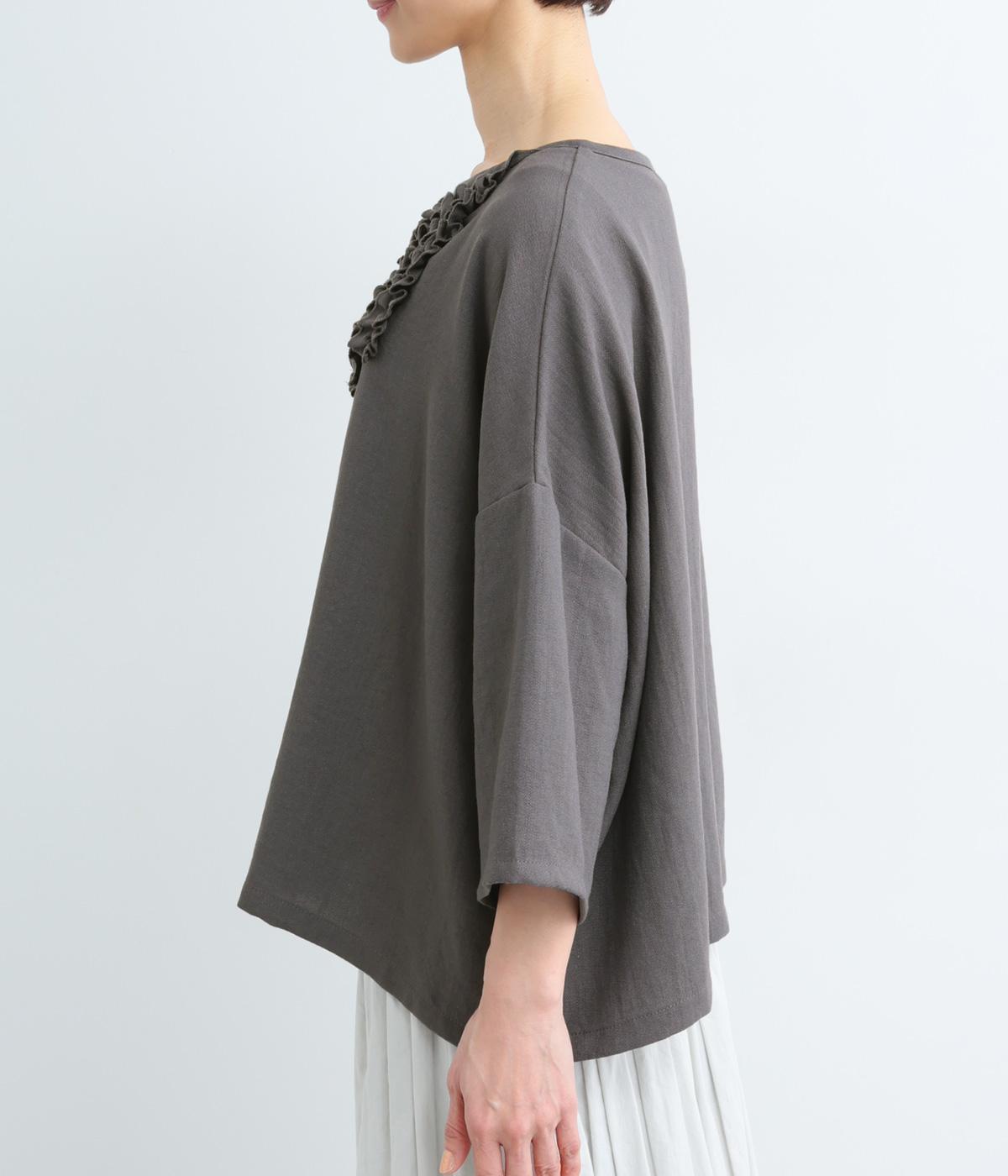 胸元にあしらった立体的なフリルが、アクセサリーをまとったような華やかさを添えるブラウスです。ドロップショルダーとゆとりのある身幅で、リラックスした着心地に。うしろの涙あきデザインがアクセントとなり、さりげないかわいらしさを添えています。