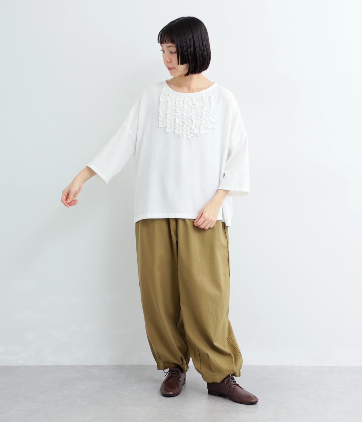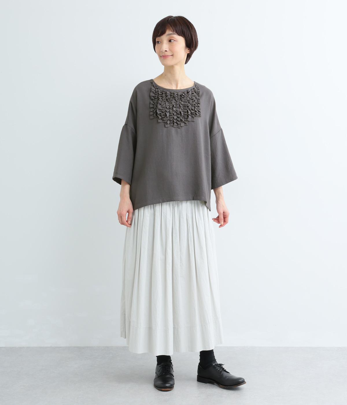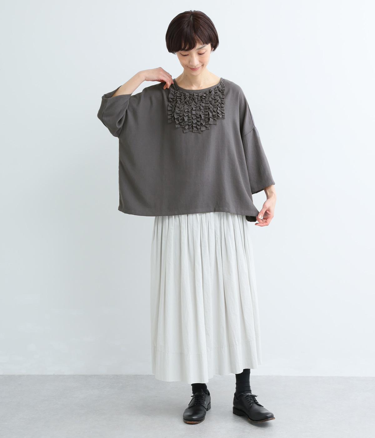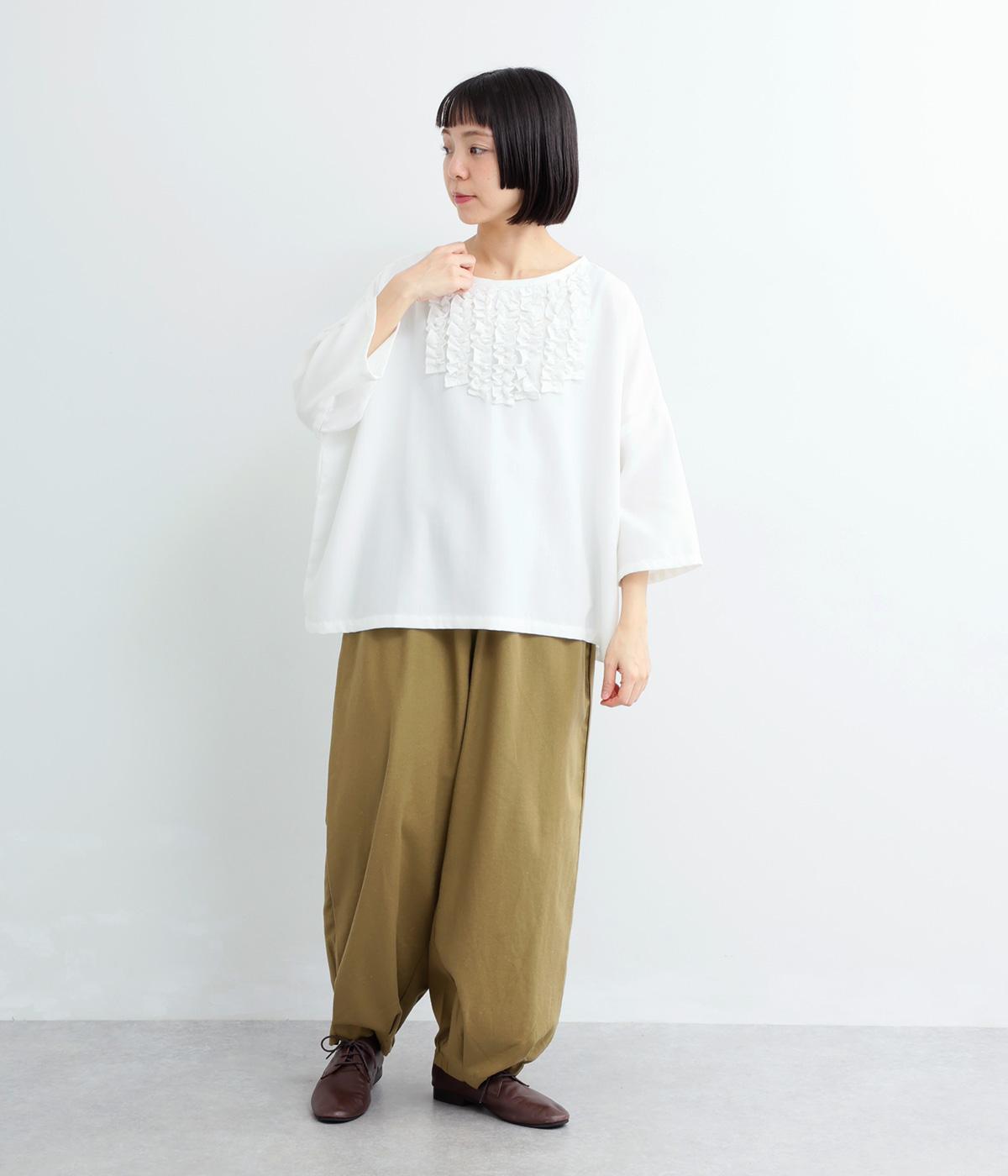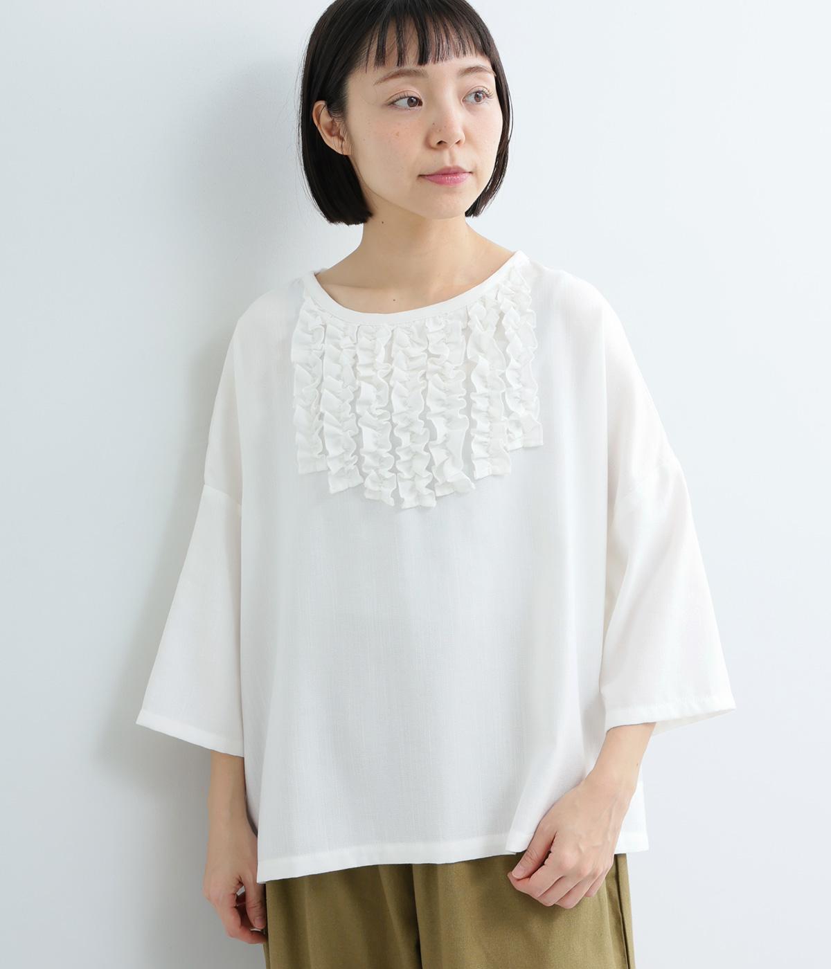 胸元にあしらった立体的なフリルが、アクセサリーをまとったような華やかさを添えるブラウスです。ドロップショルダーとゆとりのある身幅で、リラックスした着心地に。うしろの涙あきデザインがアクセントとなり、さりげないかわいらしさを添えています。