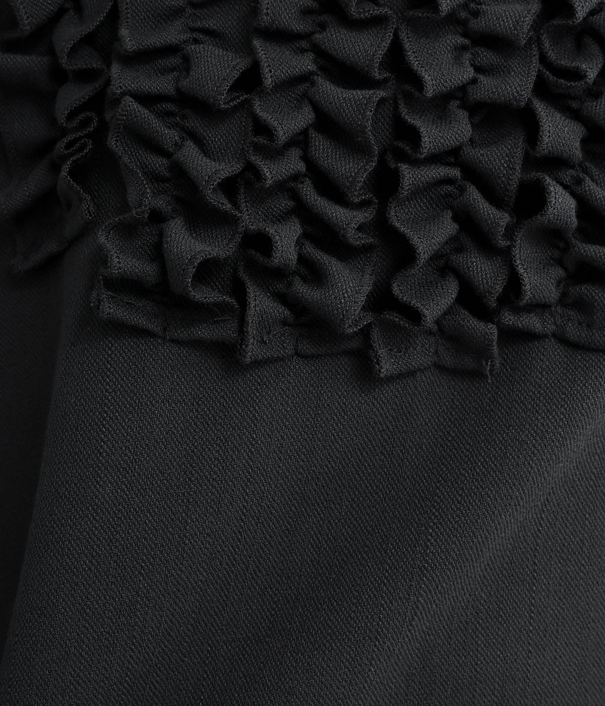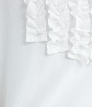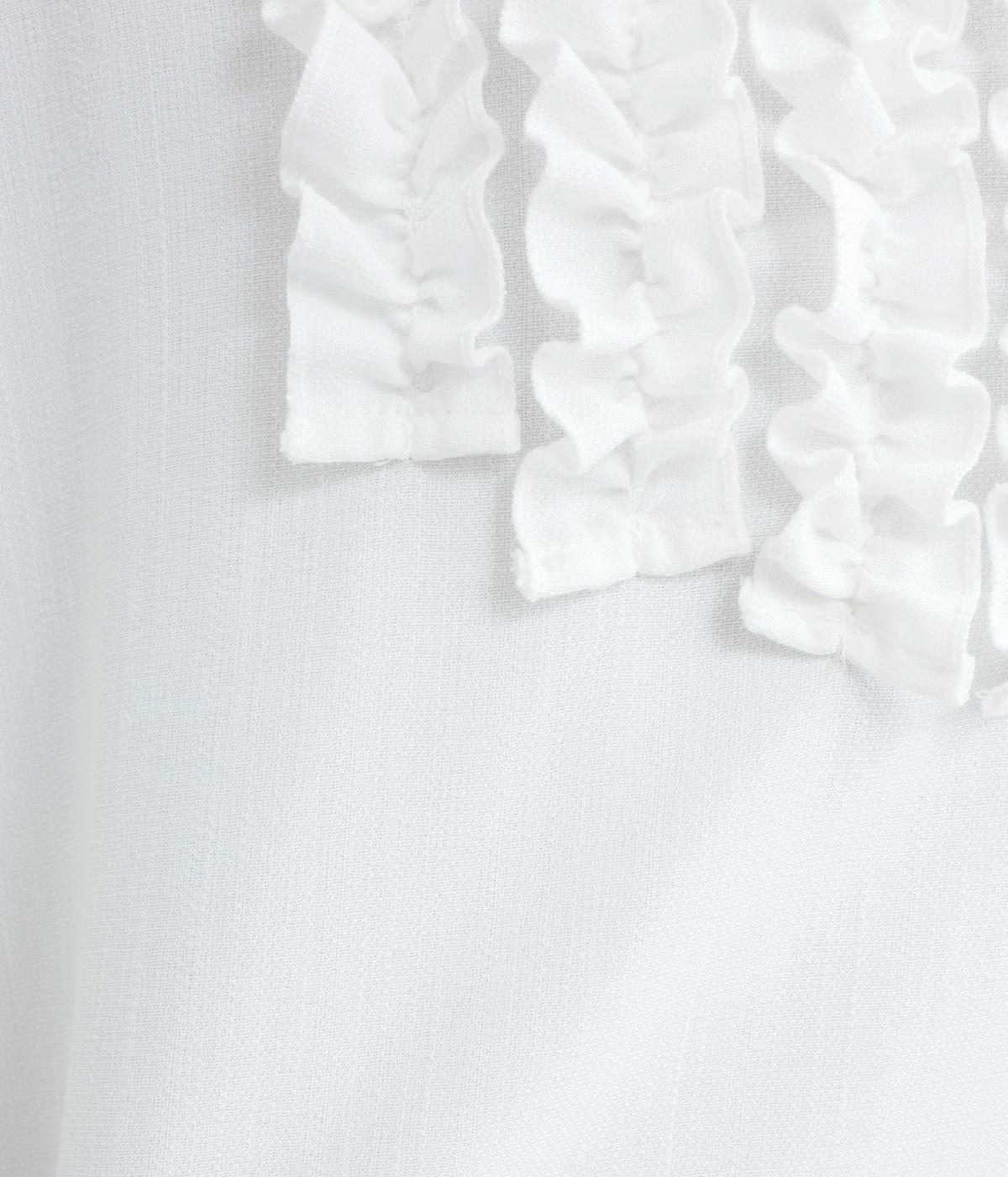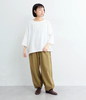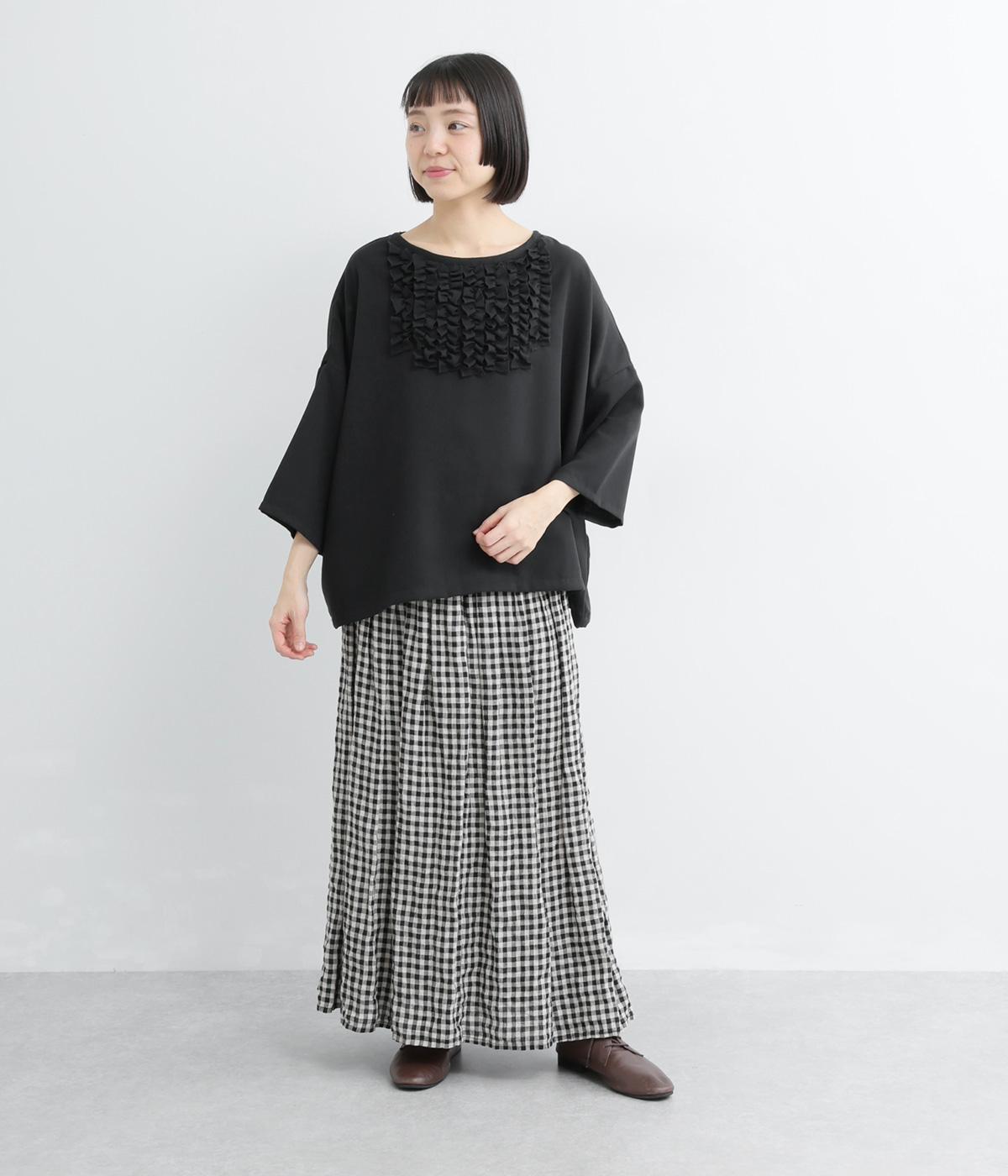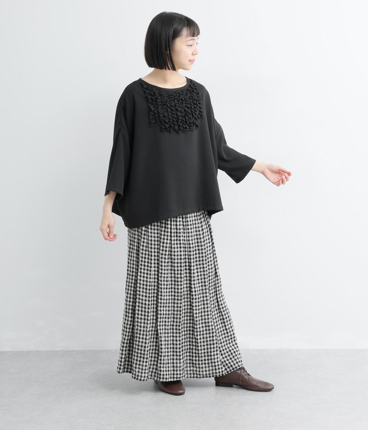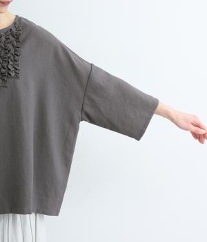 胸元にあしらった立体的なフリルが、アクセサリーをまとったような華やかさを添えるブラウスです。ドロップショルダーとゆとりのある身幅で、リラックスした着心地に。うしろの涙あきデザインがアクセントとなり、さりげないかわいらしさを添えています。