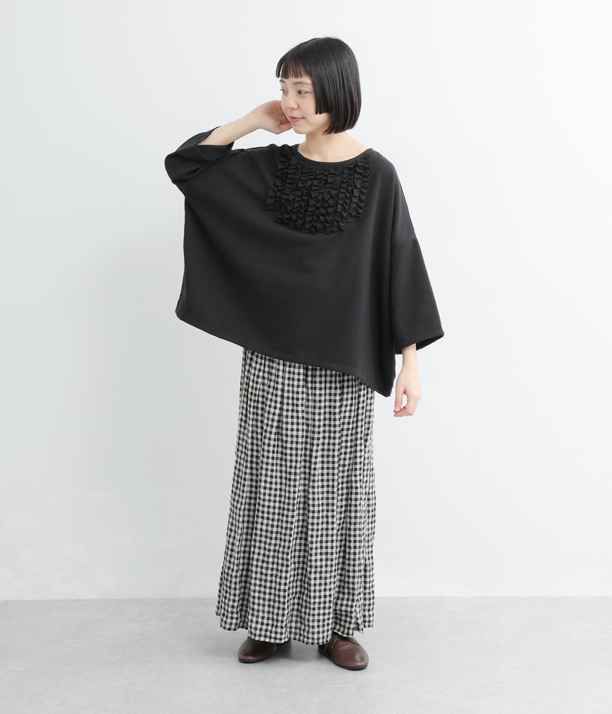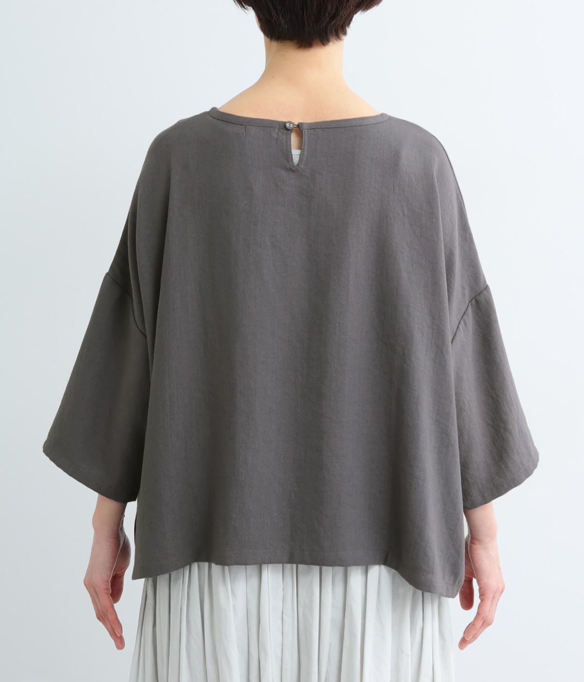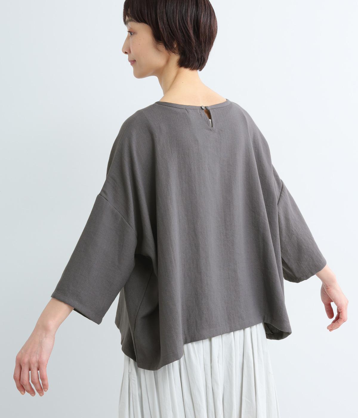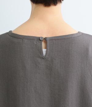 凸凹としたスラブ感のある、ポリエステルとレーヨンを混紡したTR素材で仕立てたました。やや薄手でしなやかさがあり、身体のラインを拾いにくい生地感なのがうれしいポイントです。