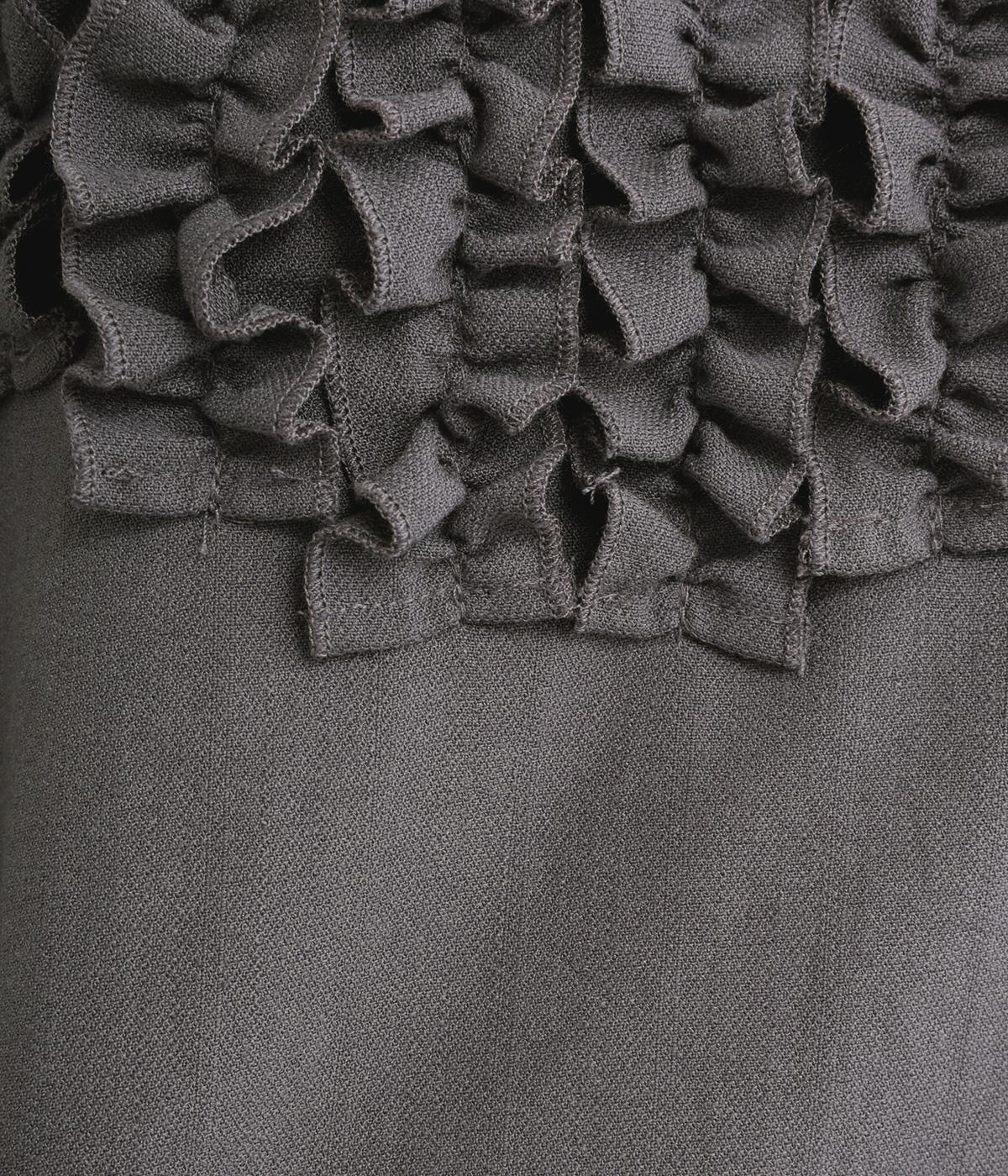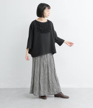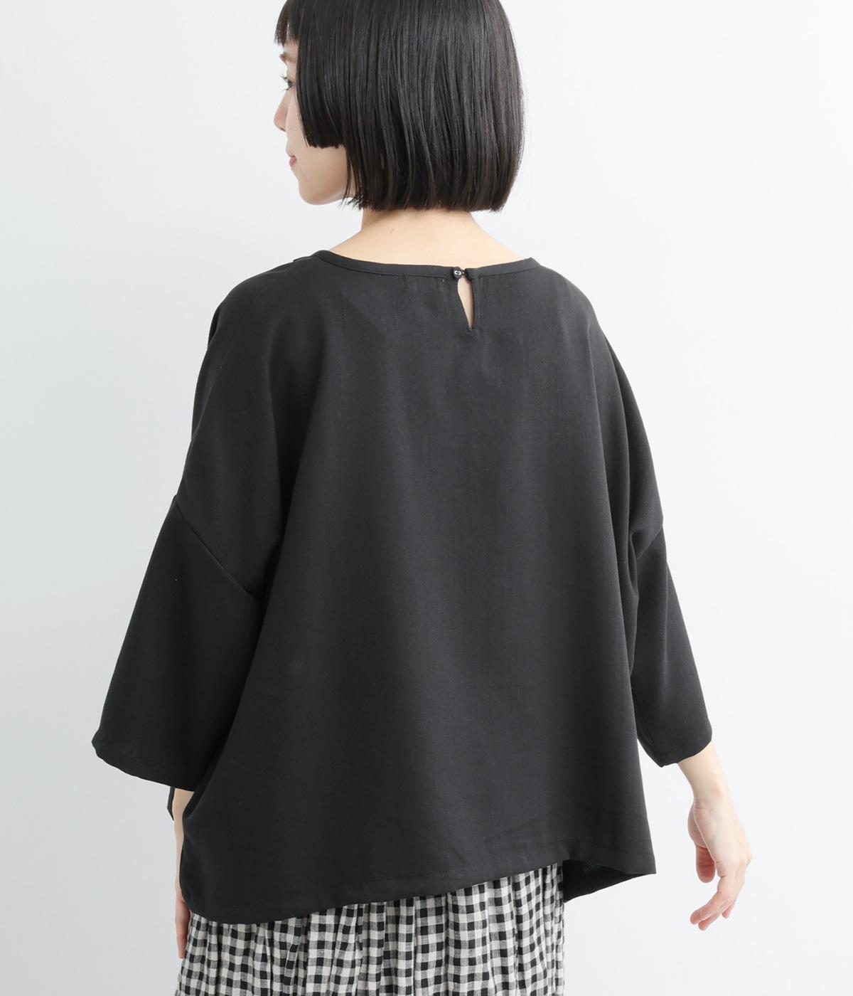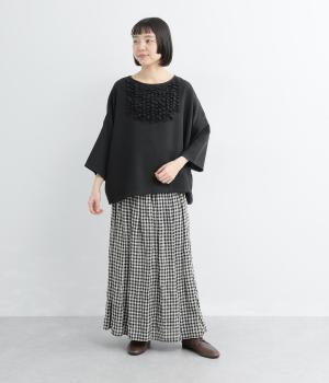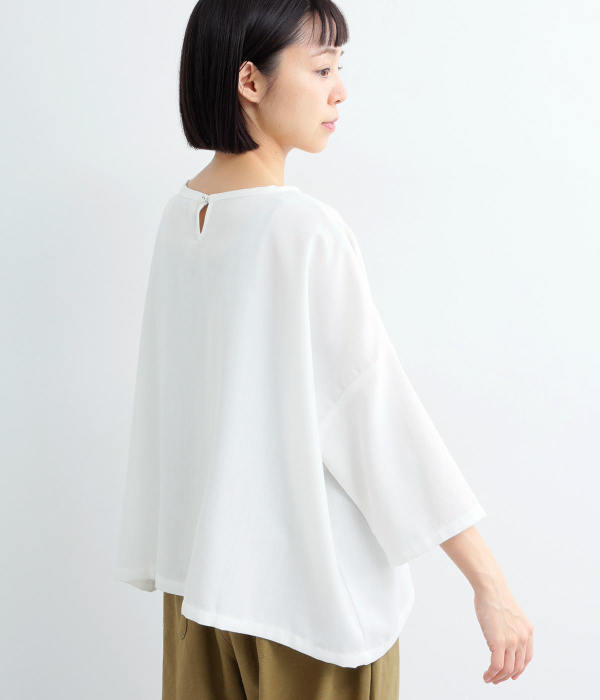 凸凹としたスラブ感のある、ポリエステルとレーヨンを混紡したTR素材で仕立てたました。やや薄手でしなやかさがあり、身体のラインを拾いにくい生地感なのがうれしいポイントです。