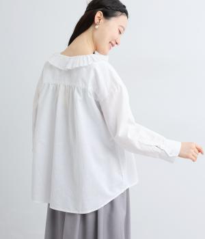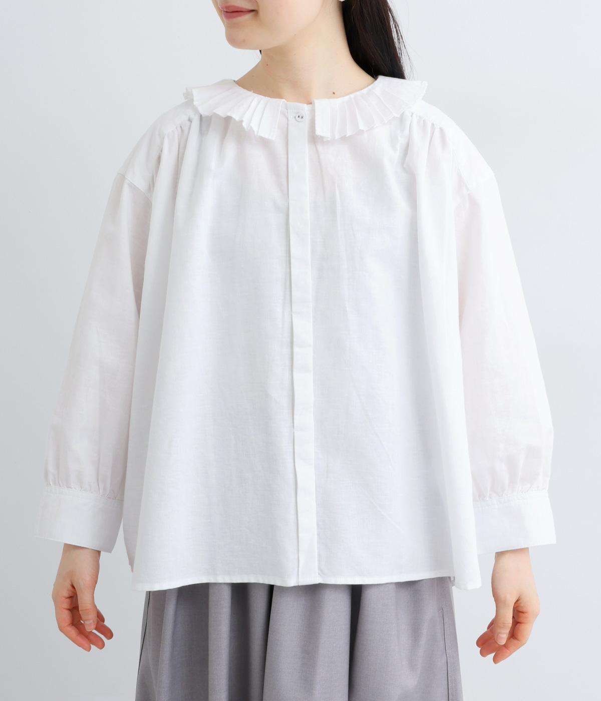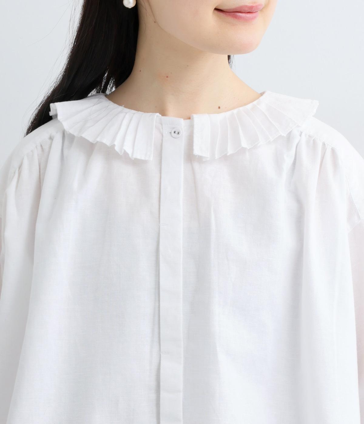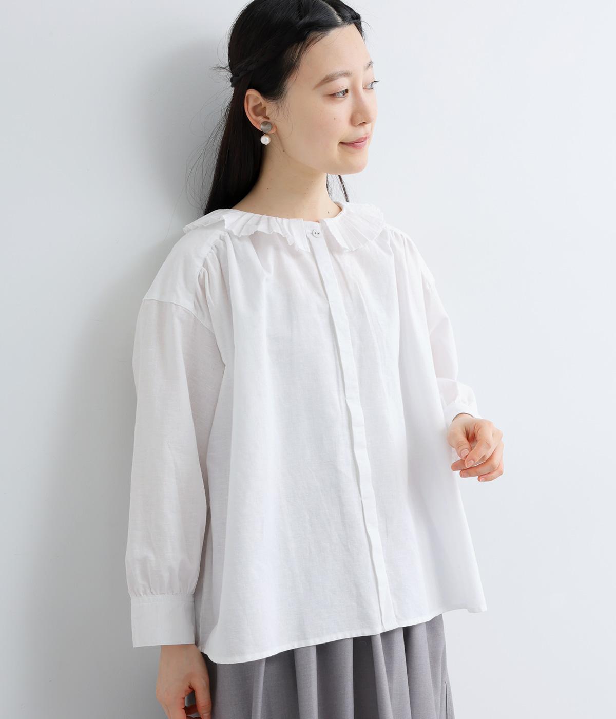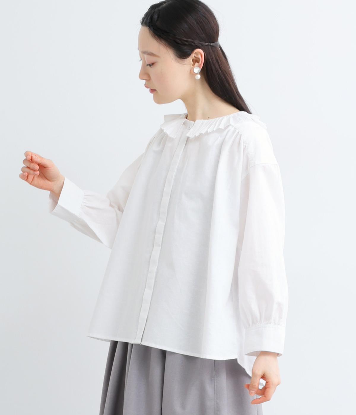 大きくあしらったタック襟が、顔まわりに上品さとやさしい華やかさをプラスします。フロントは比翼ボタンですっきりと仕上げ、甘すぎない仕上がりに。背面にはギャザーを施し、身幅にゆとりを持たせました。存在感があるので、およばれシーンでも活躍する主役級の一枚です。