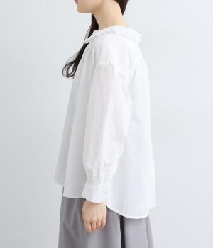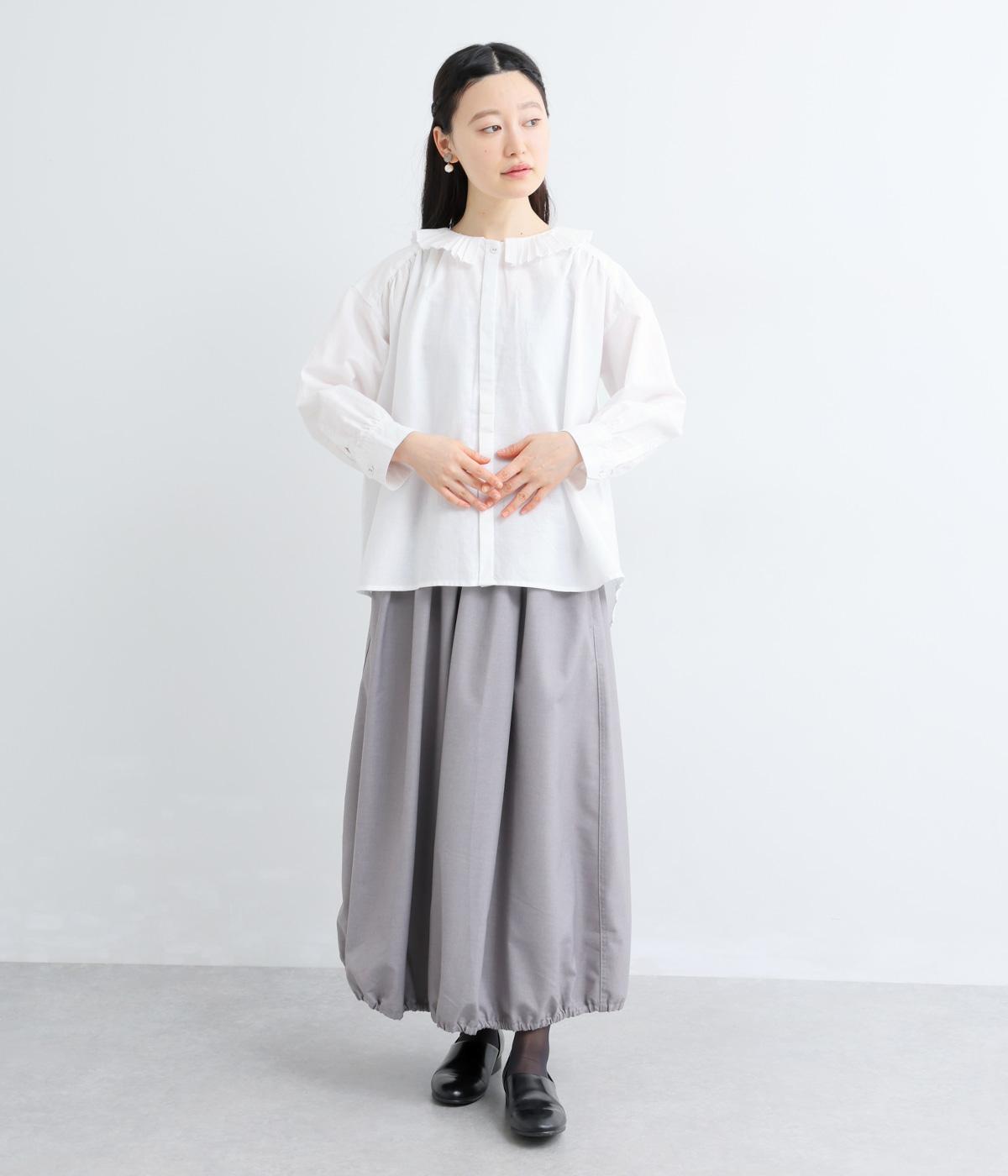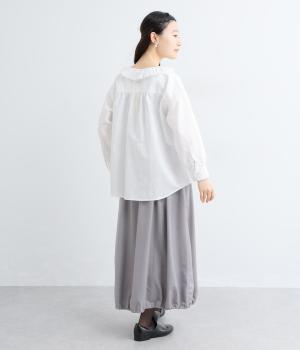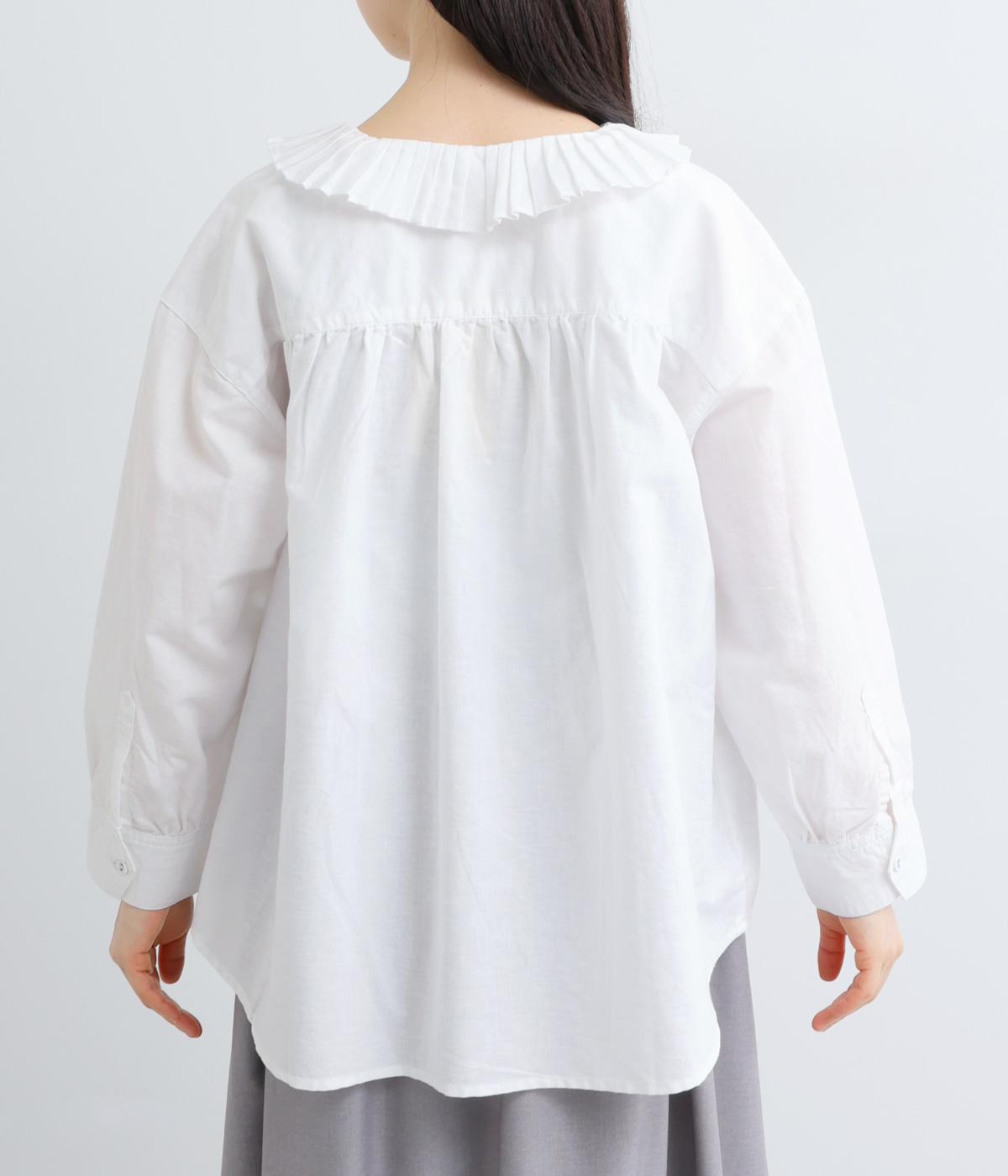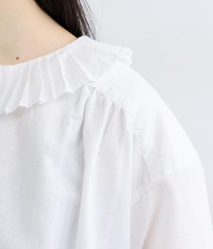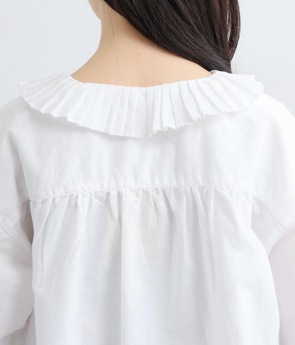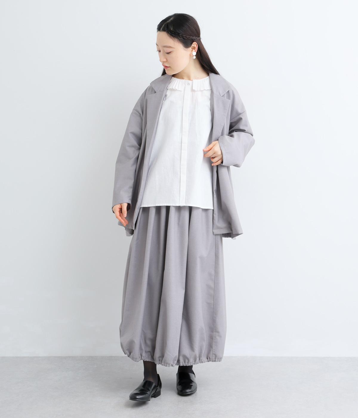 大きくあしらったタック襟が、顔まわりに上品さとやさしい華やかさをプラスします。フロントは比翼ボタンですっきりと仕上げ、甘すぎない仕上がりに。背面にはギャザーを施し、身幅にゆとりを持たせました。存在感があるので、およばれシーンでも活躍する主役級の一枚です。