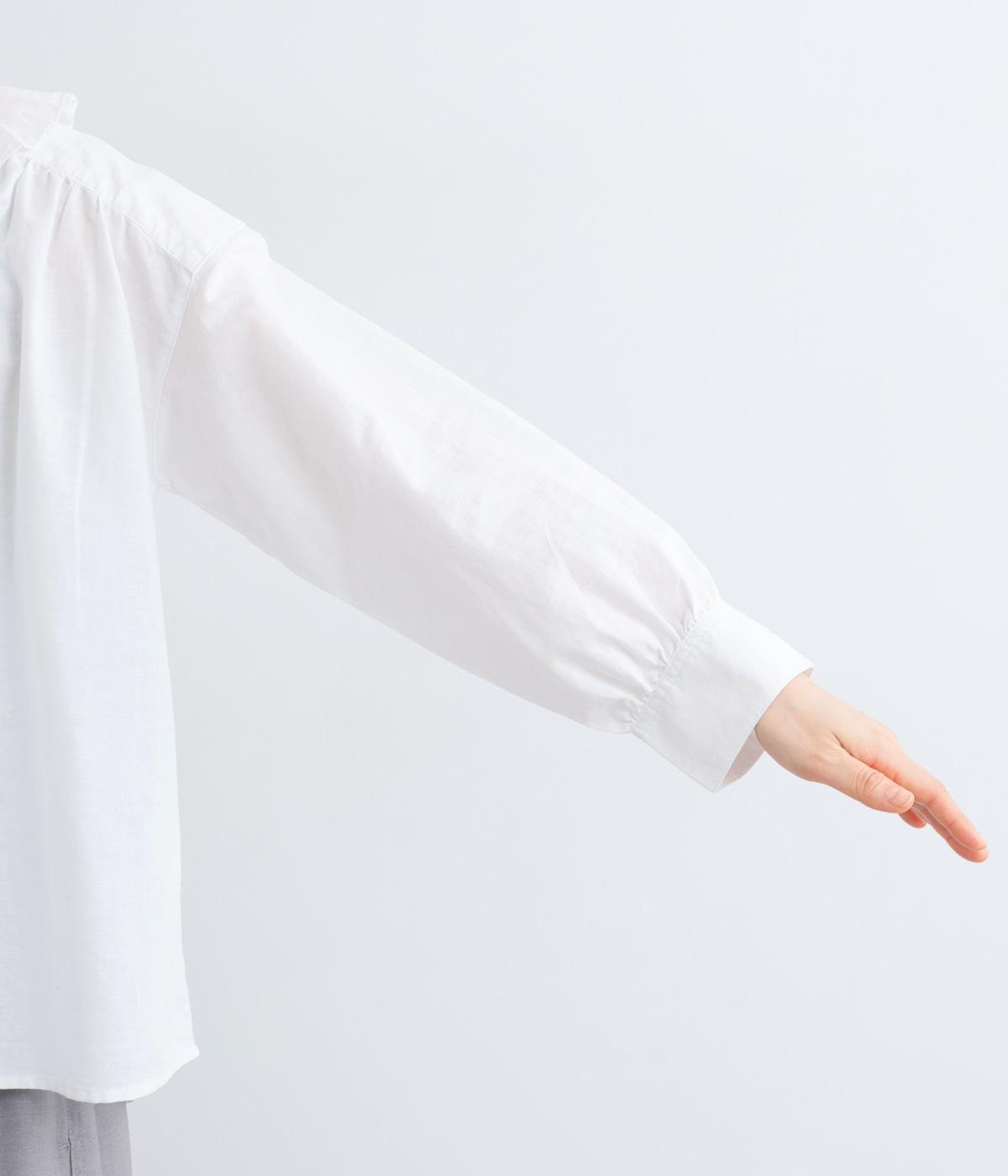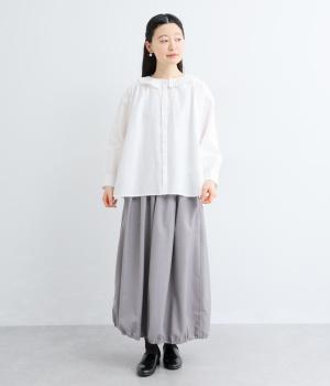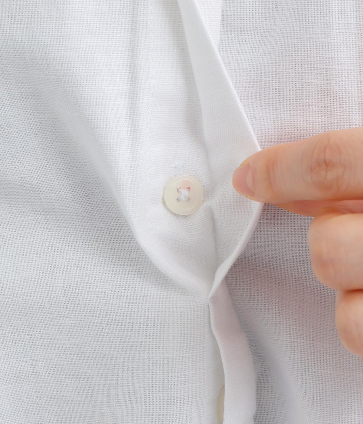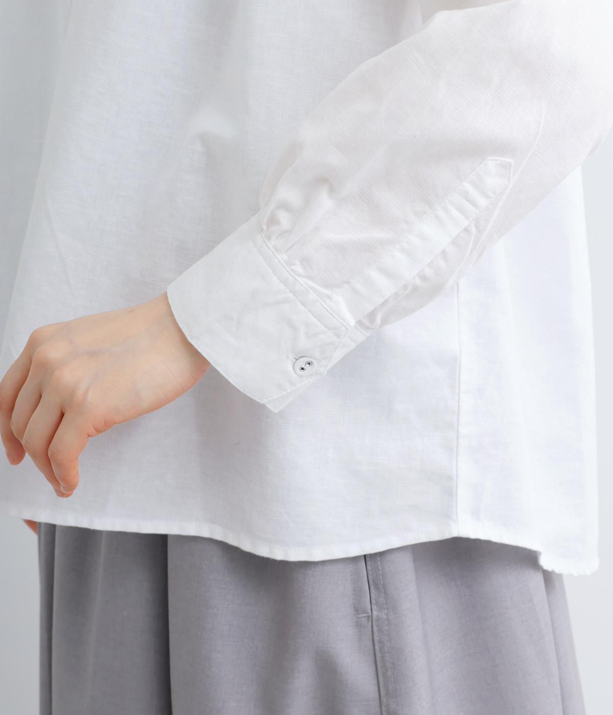ほどよく目の詰まった、オックス織りならではのハリ感があり、シルエットをきれいに保つ素材です。リネンコットンのやわらかさと、さらりとした肌ざわりで、ロングシーズン心地よく着まわせます。