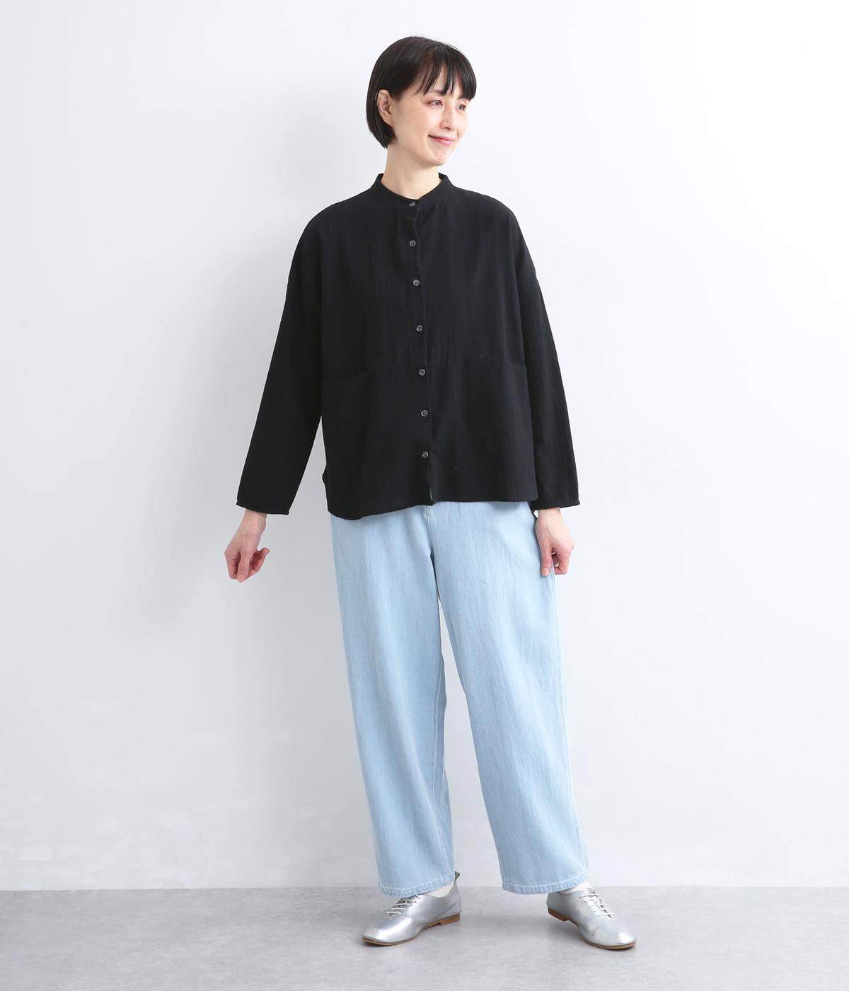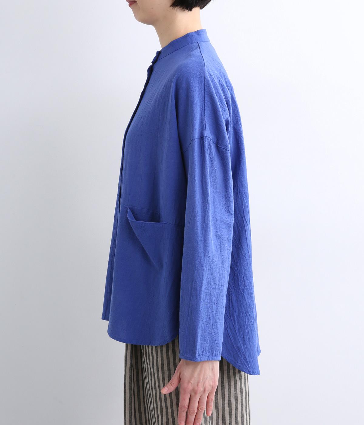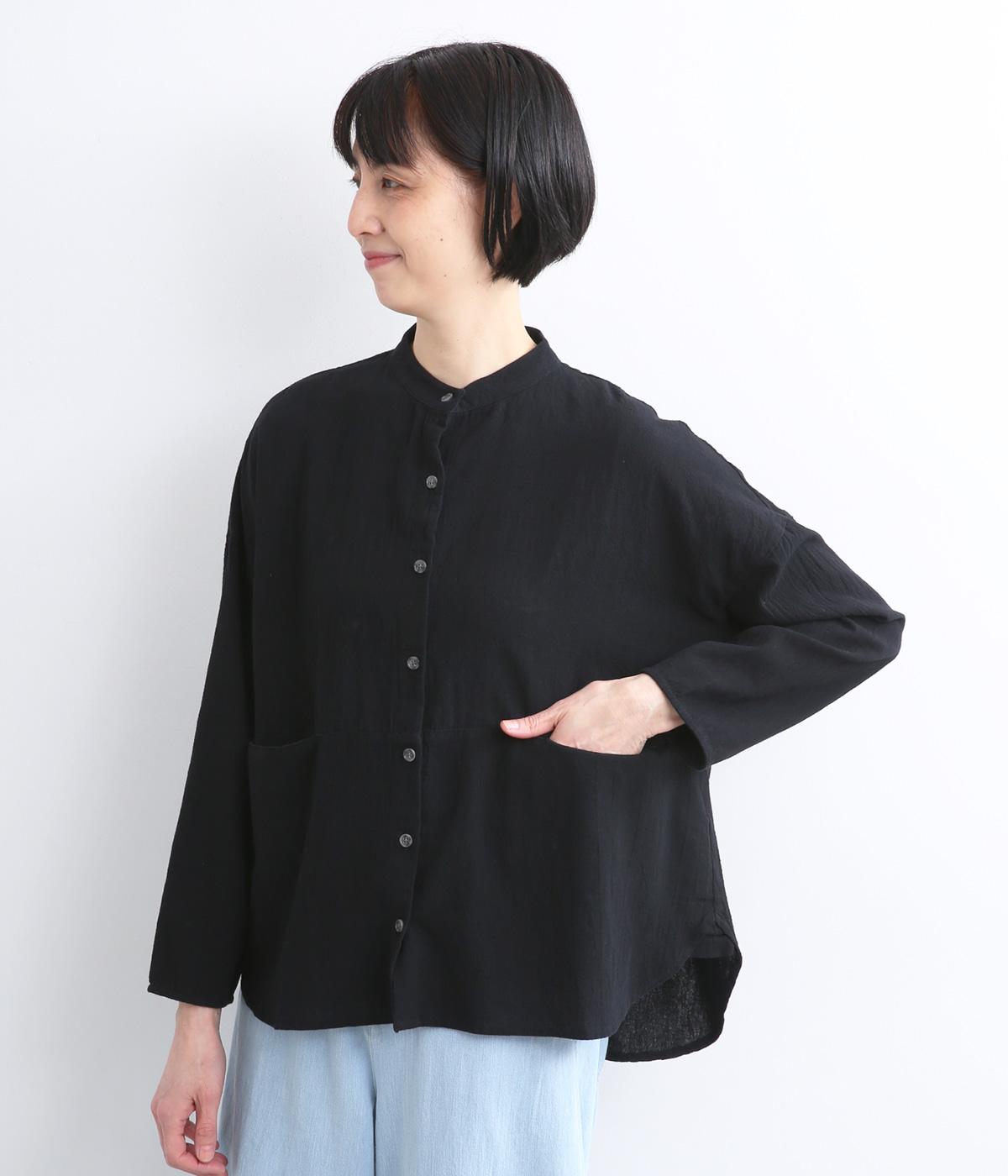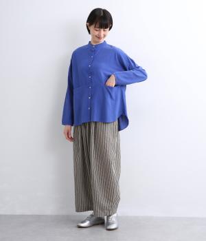 前ボタンを外して羽織りとしても活躍するブラウスです。ゆったりしたシルエットにシームポケットがさりげないアクセントを添え、気負わずリラックスした印象に。バンドカラーで顔まわりはすっきりと仕立てました。