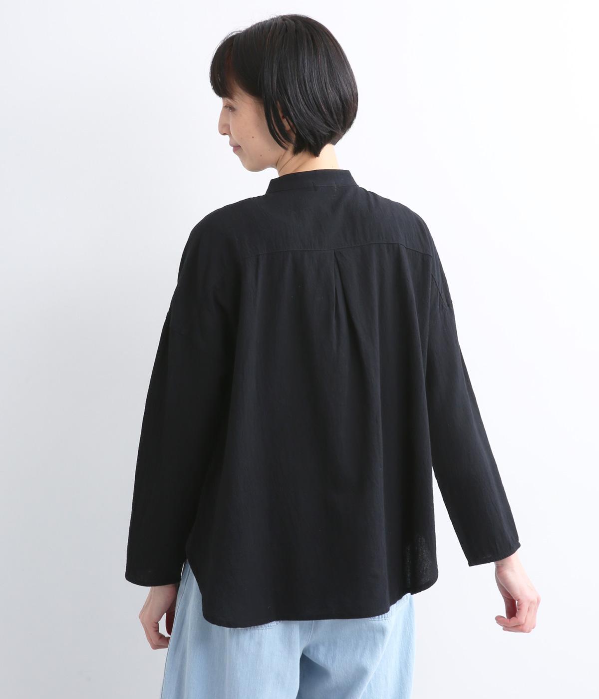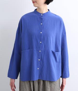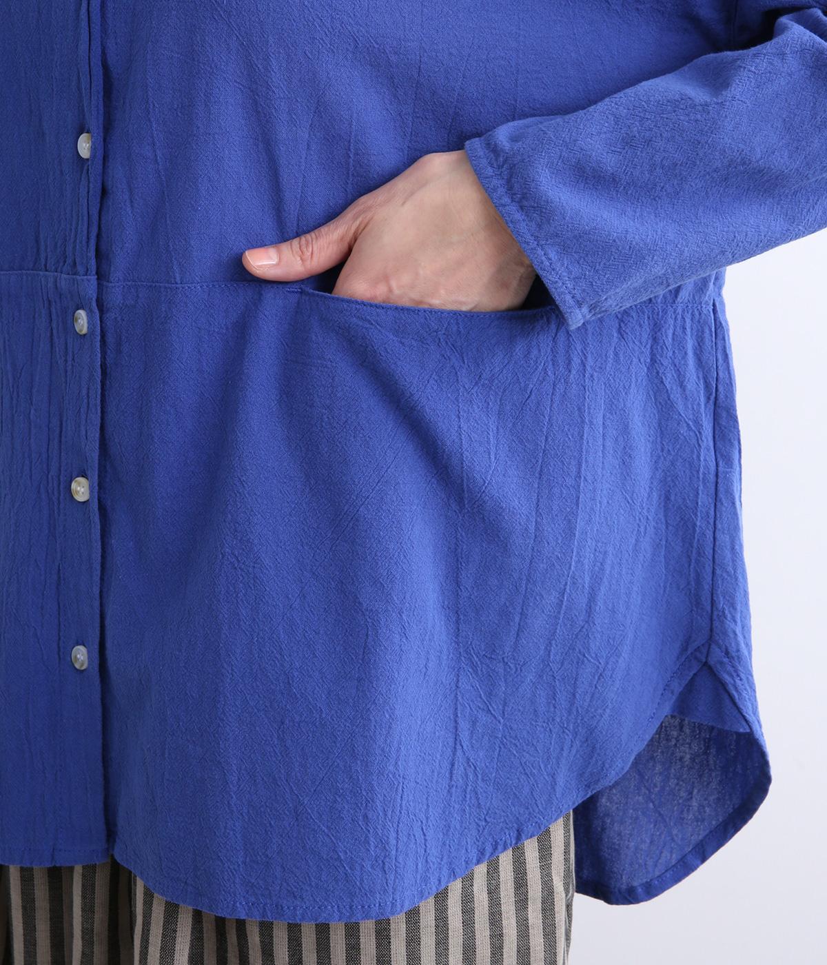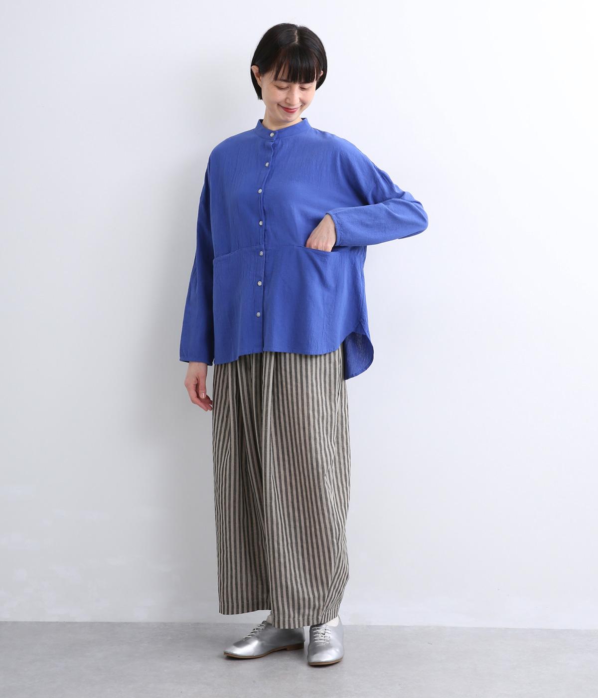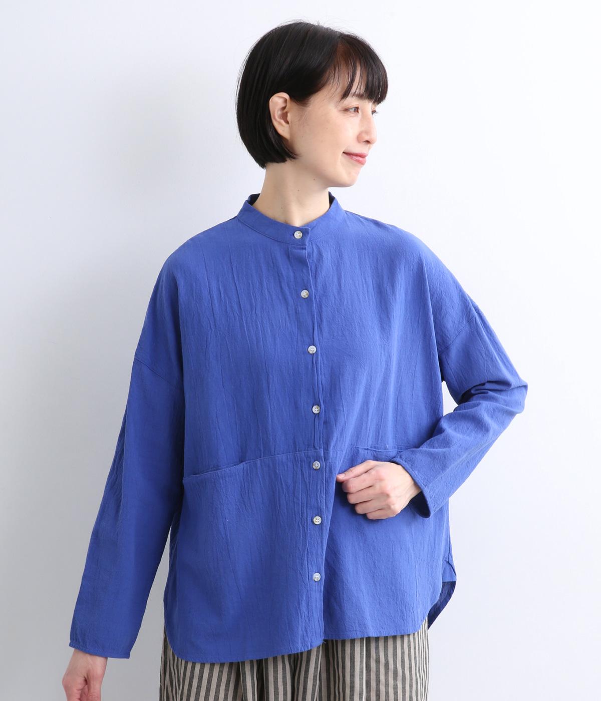 前ボタンを外して羽織りとしても活躍するブラウスです。ゆったりしたシルエットにシームポケットがさりげないアクセントを添え、気負わずリラックスした印象に。バンドカラーで顔まわりはすっきりと仕立てました。