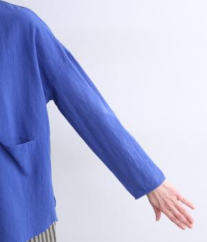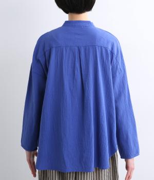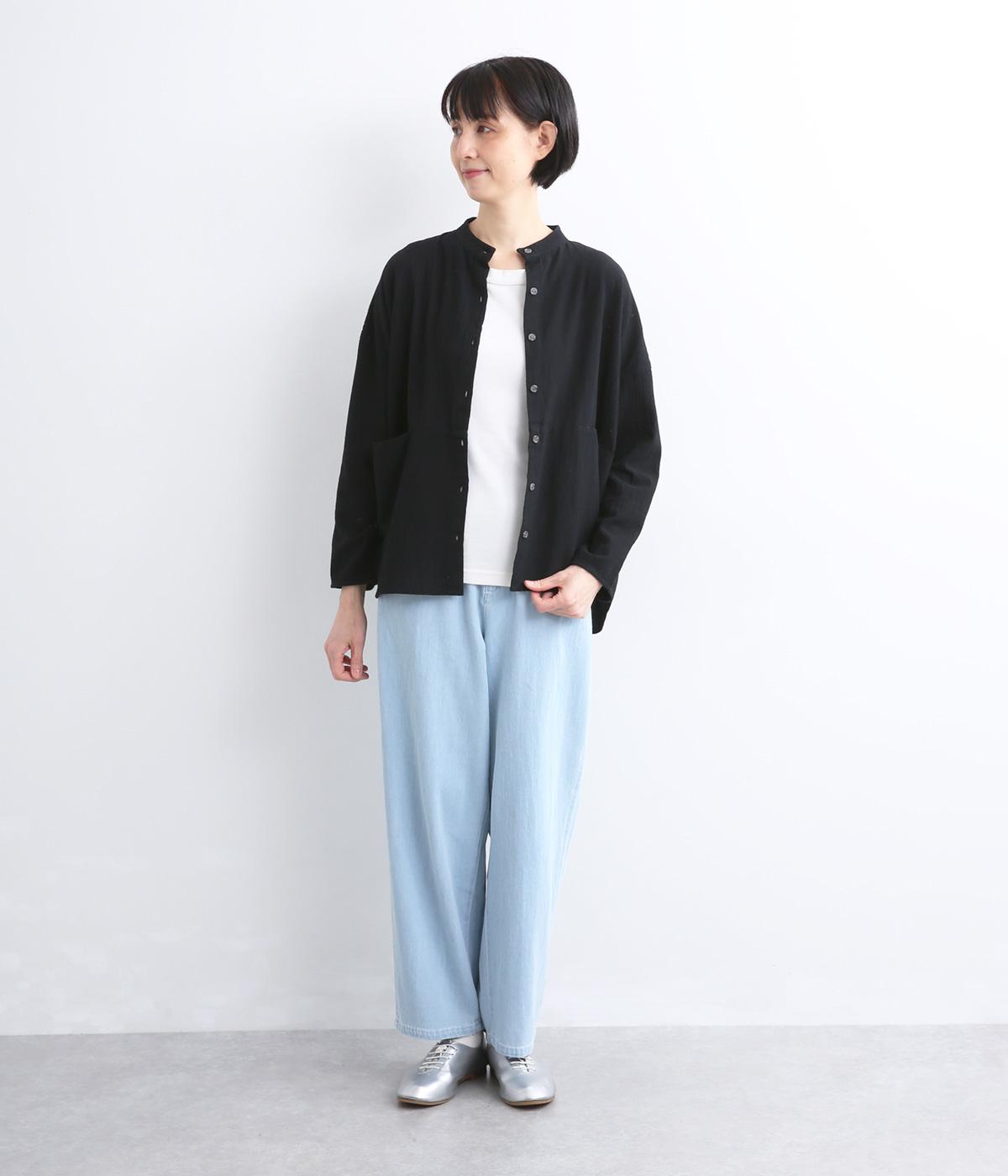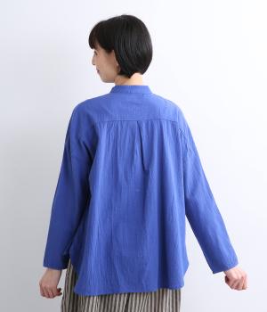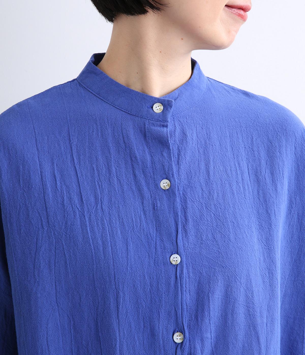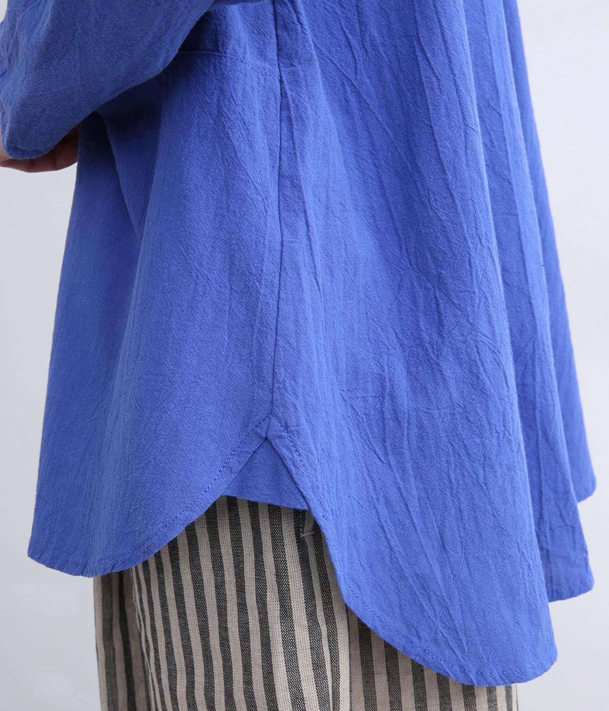 前ボタンを外して羽織りとしても活躍するブラウスです。ゆったりしたシルエットにシームポケットがさりげないアクセントを添え、気負わずリラックスした印象に。バンドカラーで顔まわりはすっきりと仕立てました。