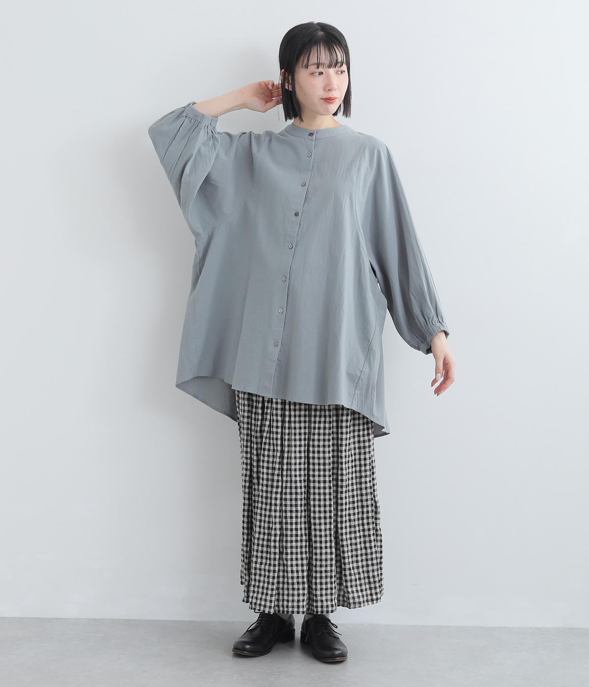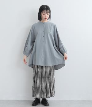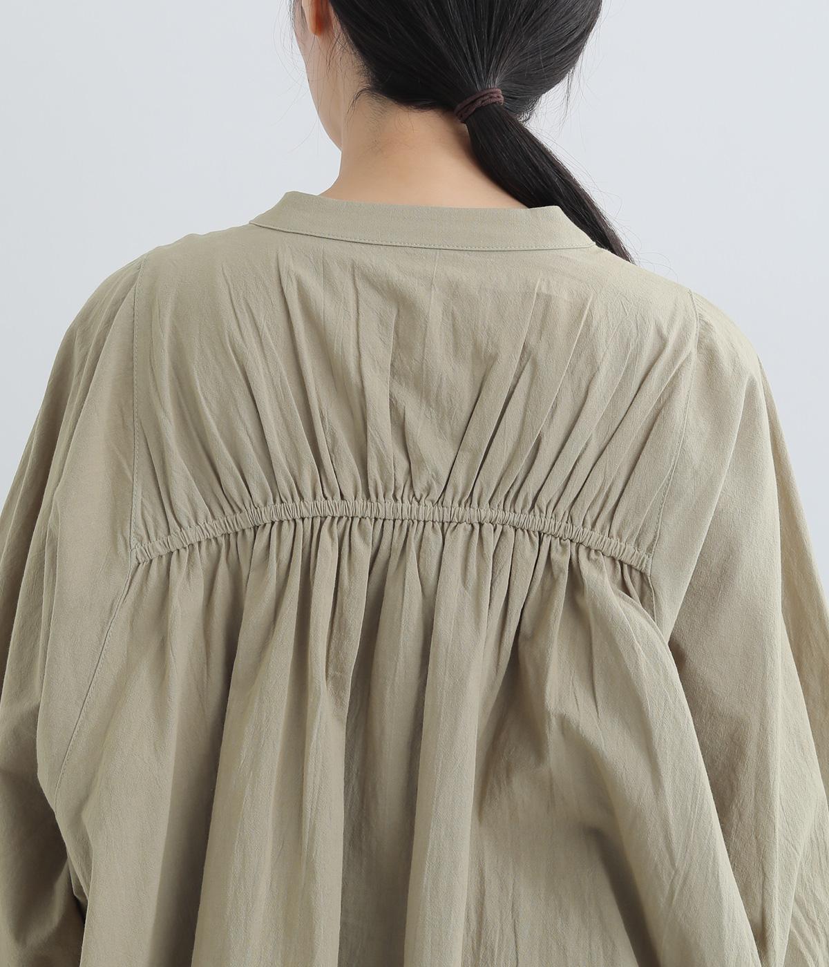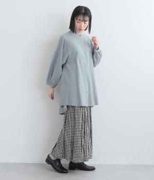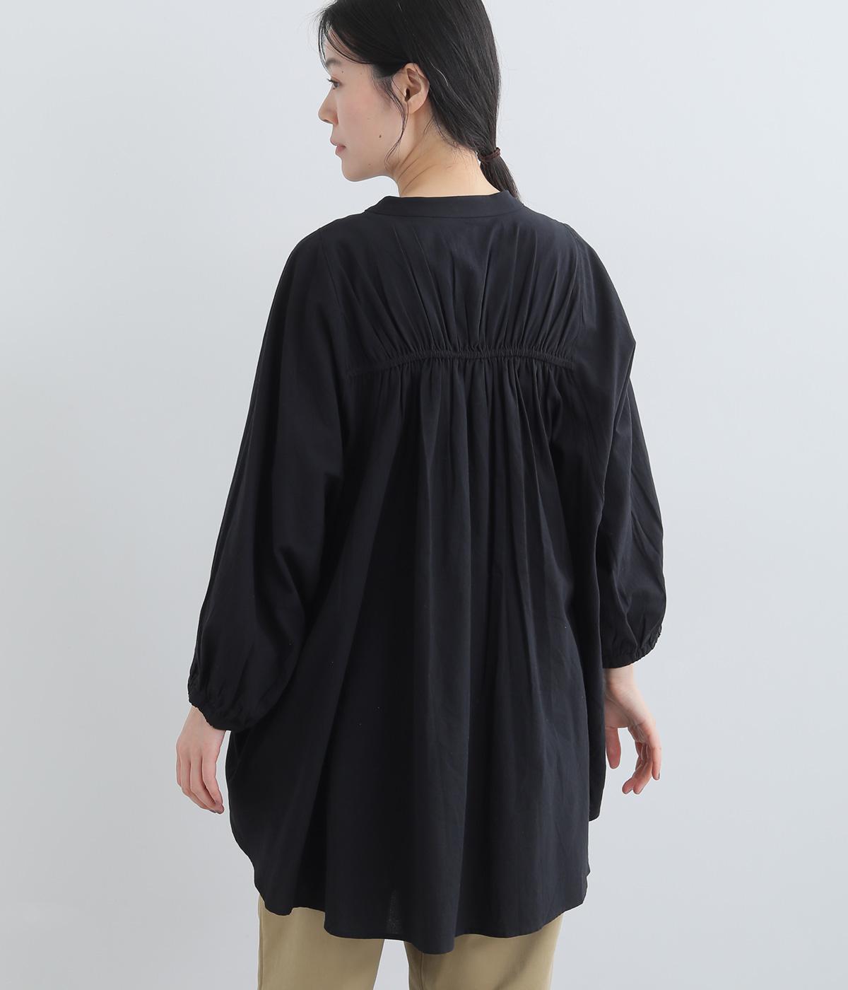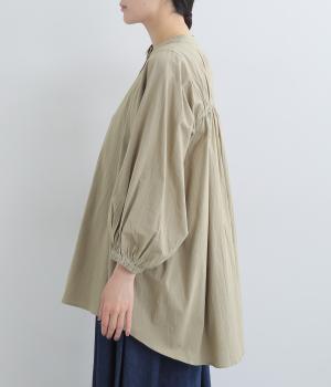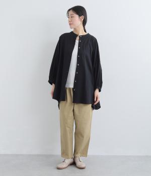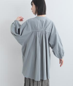 ゆったりした身幅のノーカラーブラウス。背中の高い位置に入れたギャザーによって、後ろ姿が自然にふんわり揺れるシルエットになるのが魅力です。前後差のある長め丈で腰回りをカバーできるのも◎。短めの袖が全体のバランスを引き締めます。