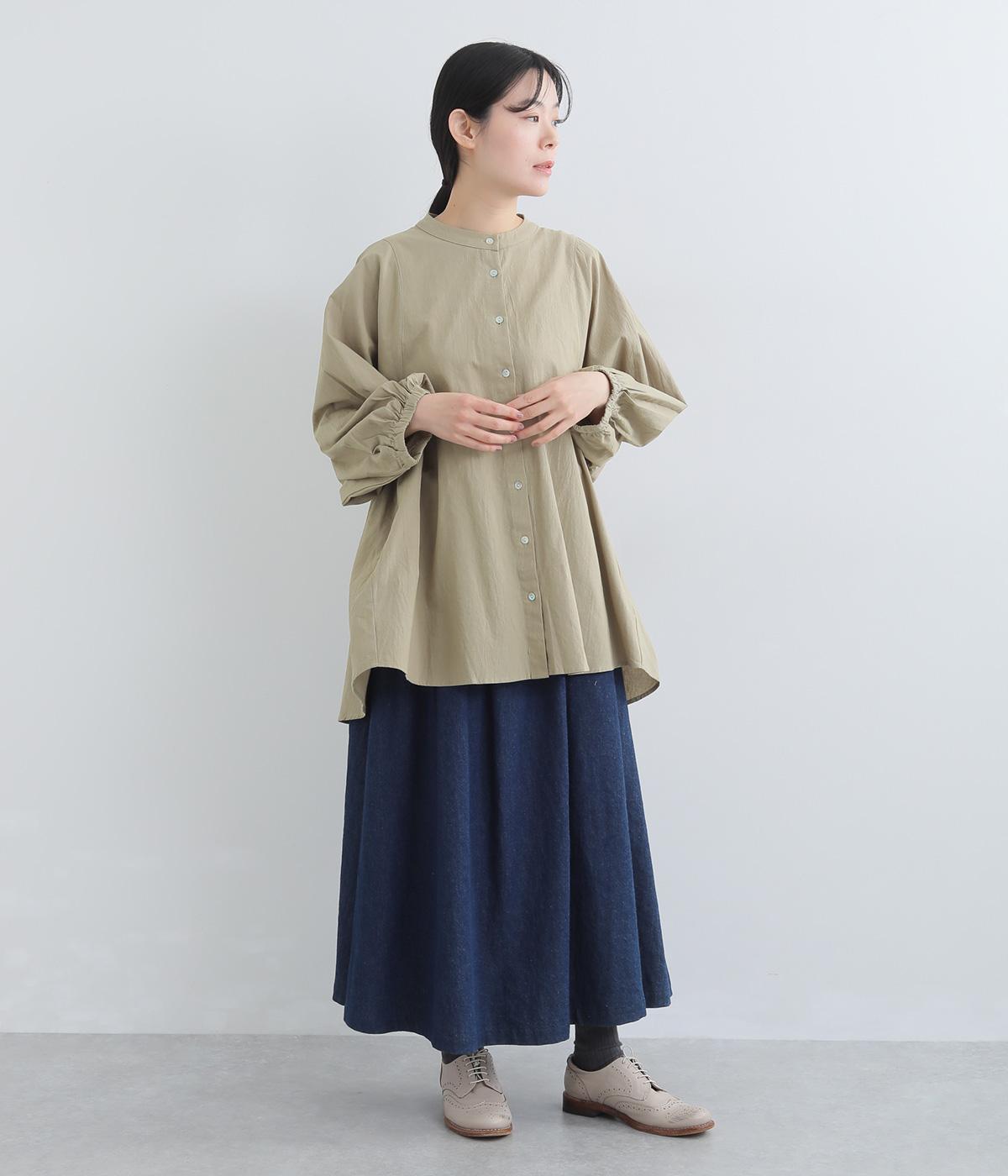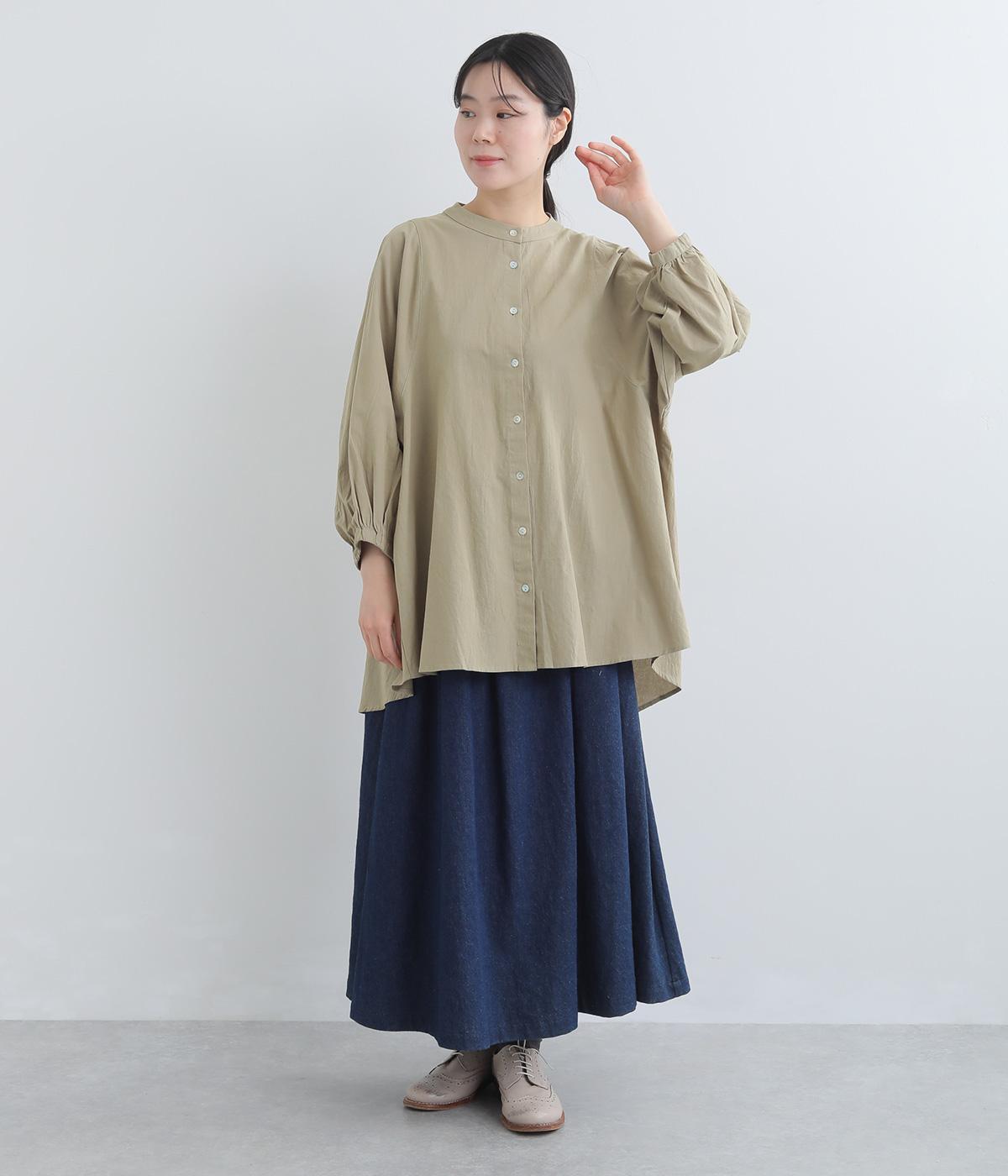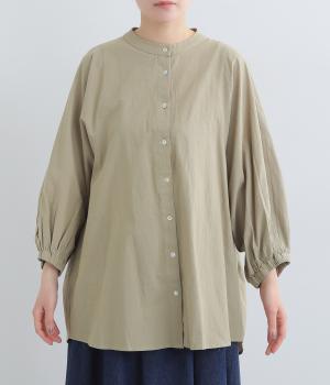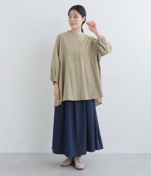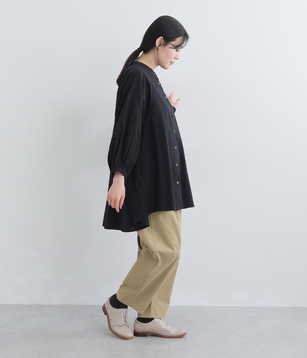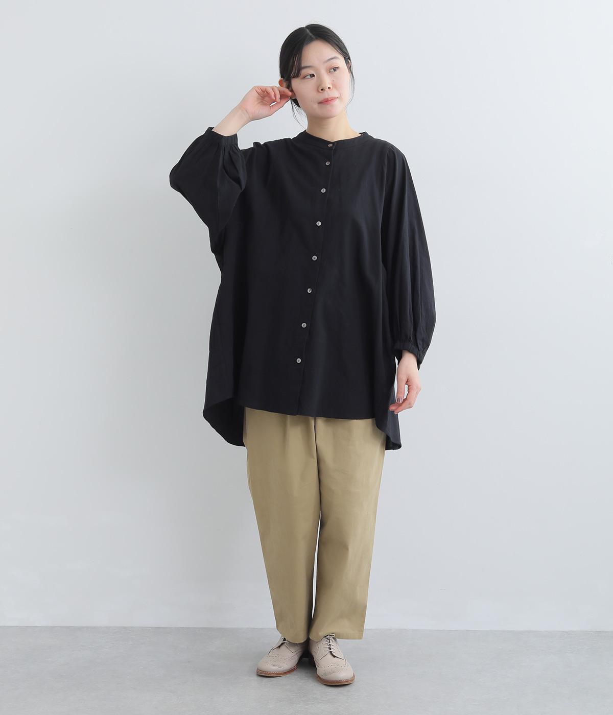 ゆったりした身幅のノーカラーブラウス。背中の高い位置に入れたギャザーによって、後ろ姿が自然にふんわり揺れるシルエットになるのが魅力です。前後差のある長め丈で腰回りをカバーできるのも◎。短めの袖が全体のバランスを引き締めます。