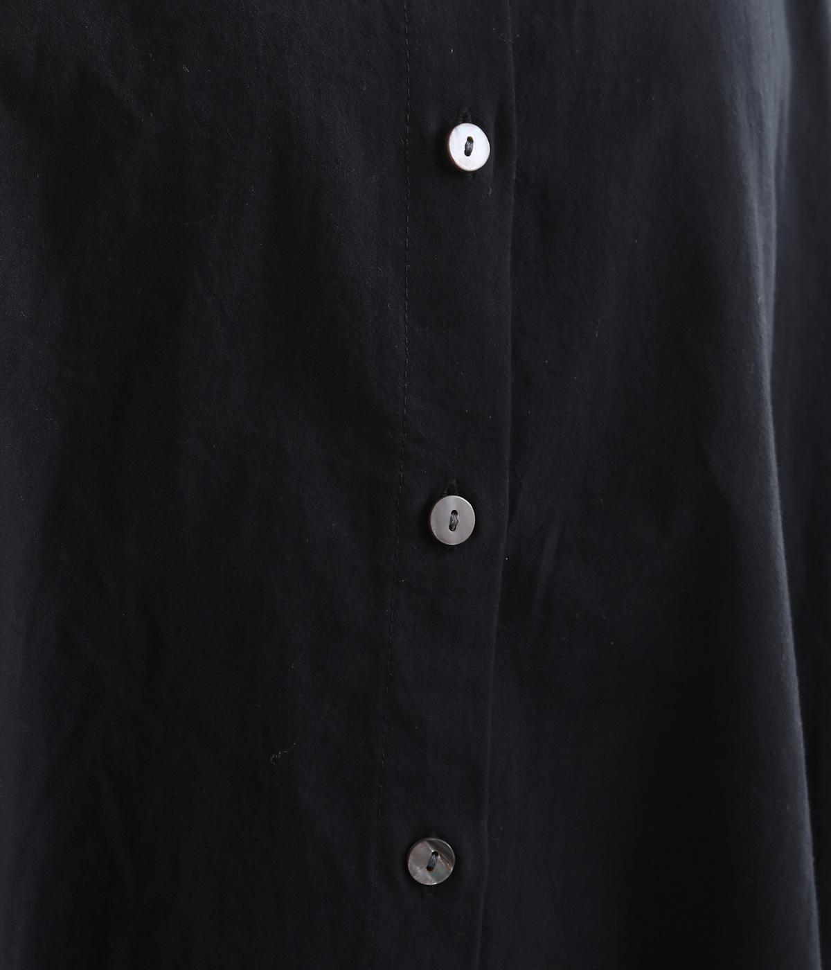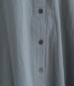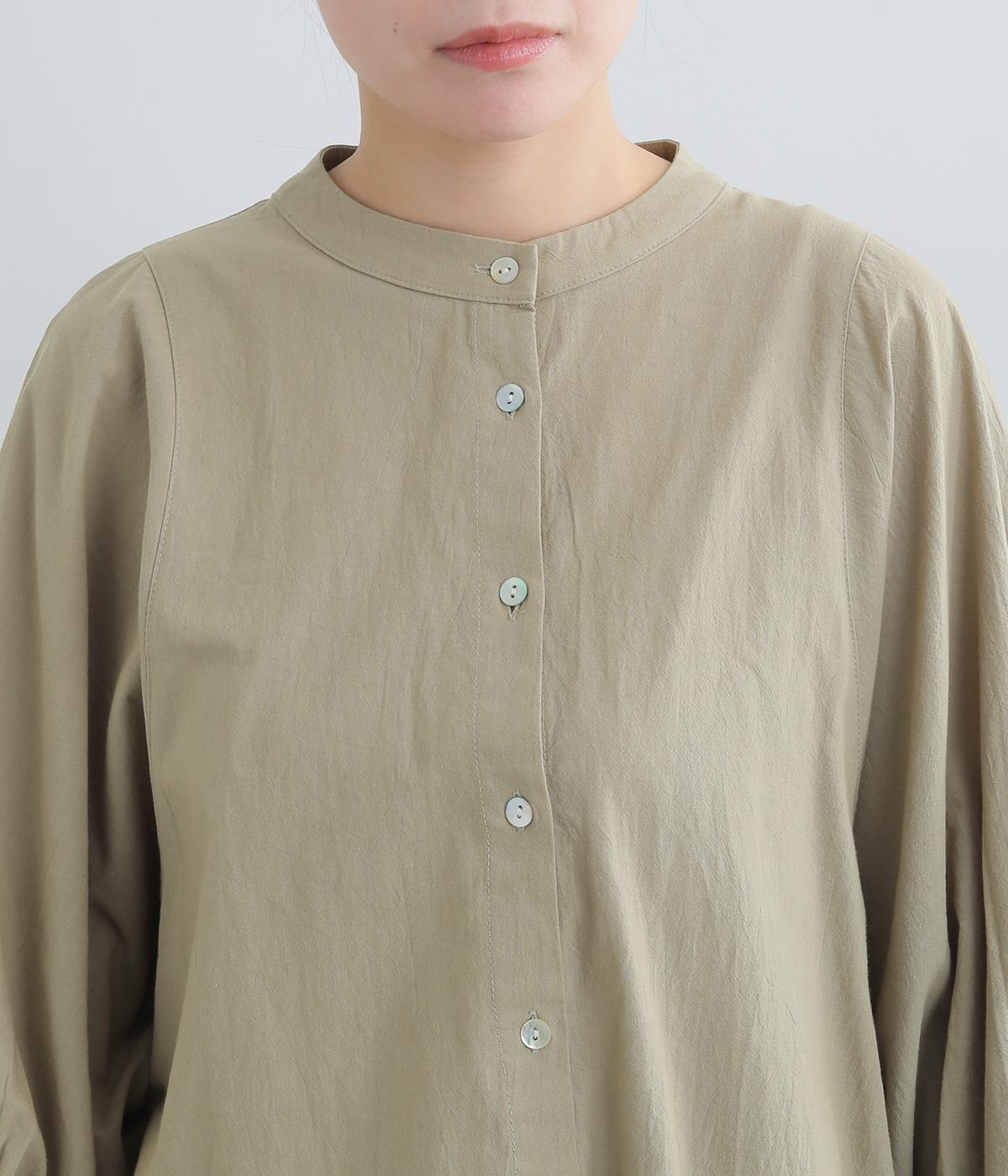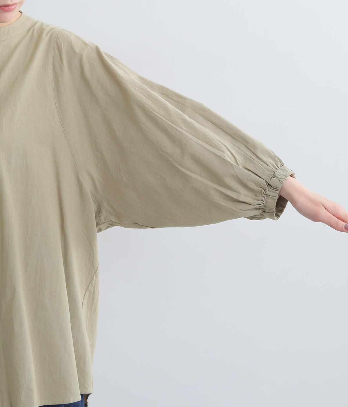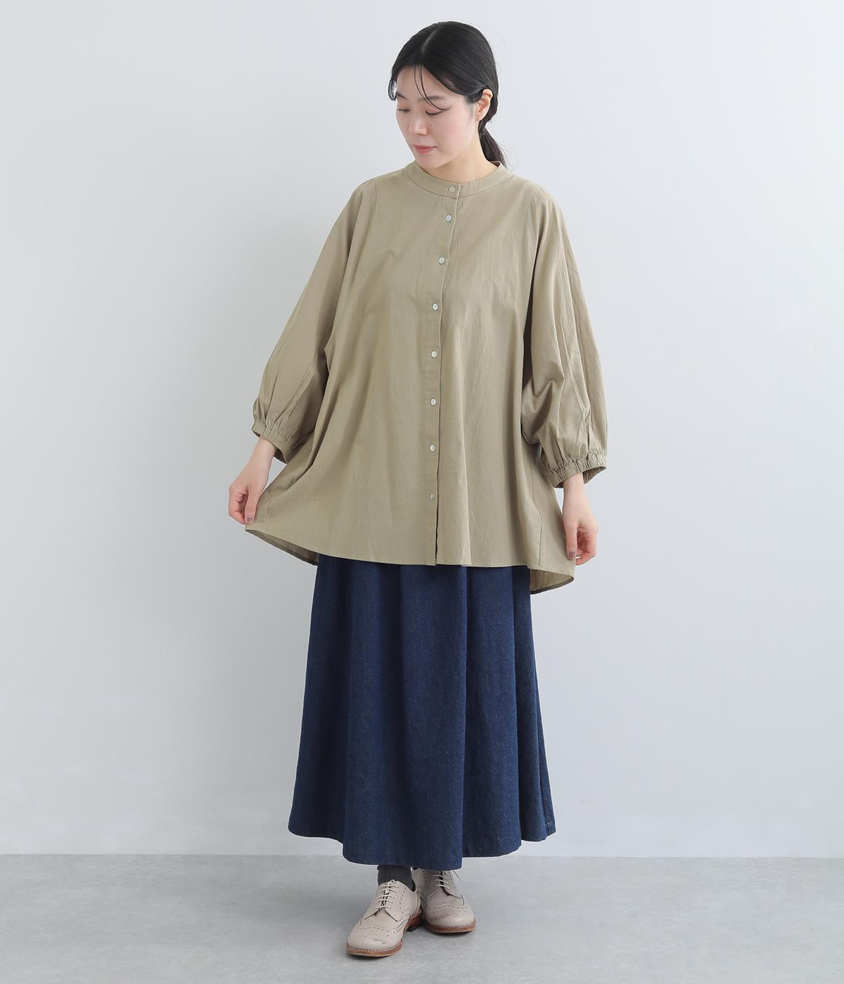 ゆったりした身幅のノーカラーブラウス。背中の高い位置に入れたギャザーによって、後ろ姿が自然にふんわり揺れるシルエットになるのが魅力です。前後差のある長め丈で腰回りをカバーできるのも◎。短めの袖が全体のバランスを引き締めます。