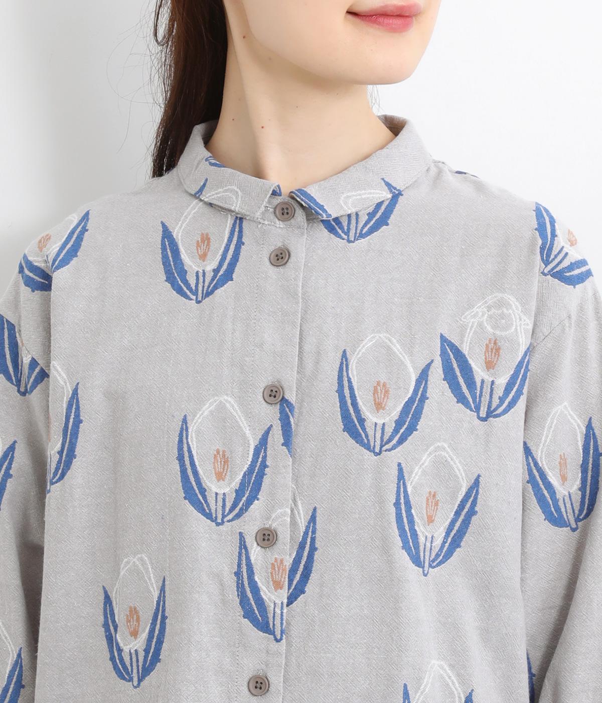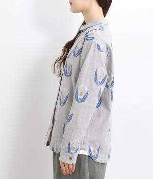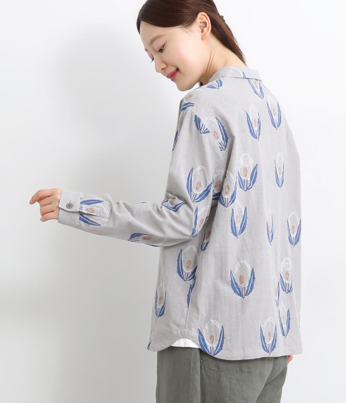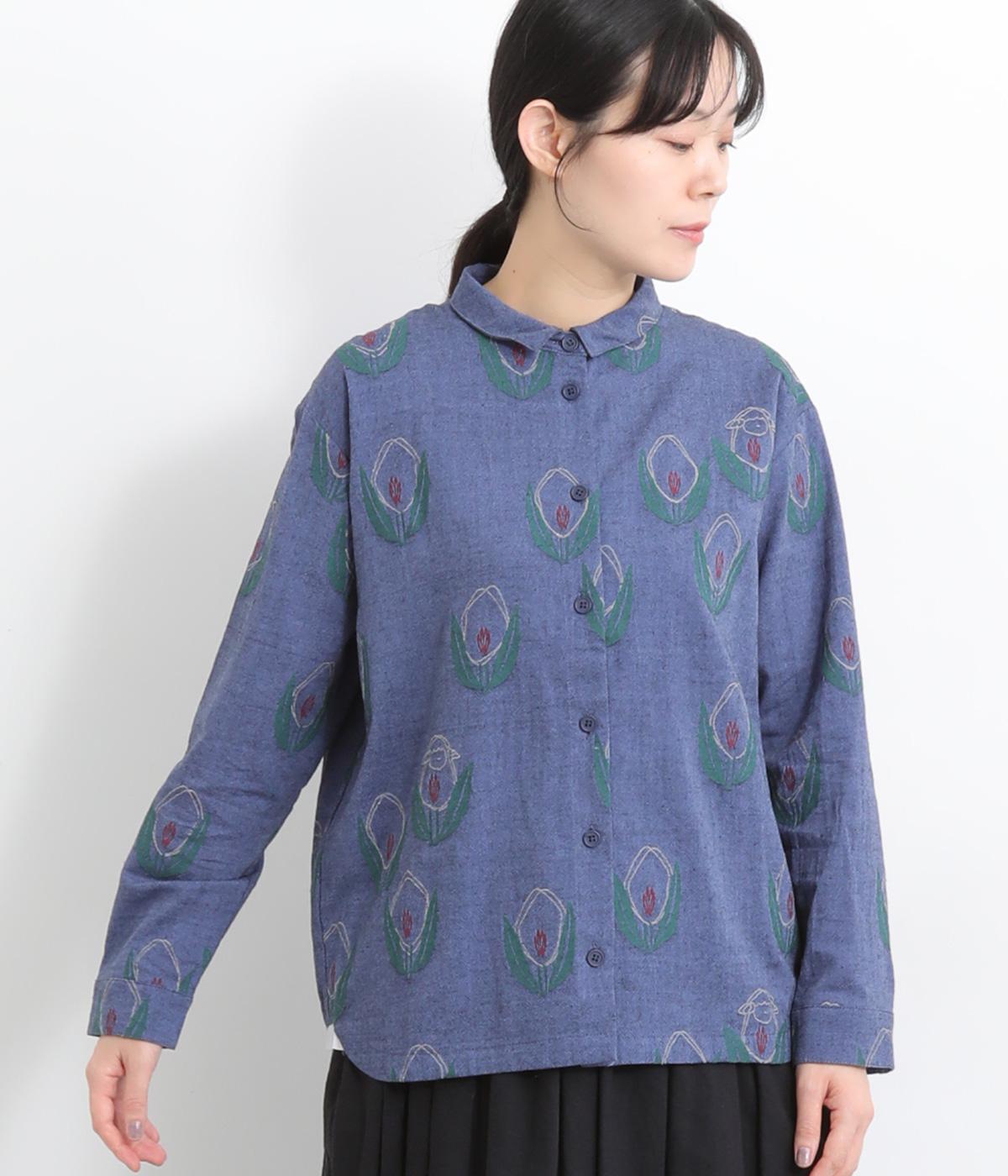 ラフに描かれたお花の中に羊がさりげなく隠れる愛らしいジャカードシャツです。甘さをおさえた柄なので、大人でも気負いせずに着やすいのが魅力。一枚で主役になりつつ、羽織りやインナーとしても便利に着まわせます。