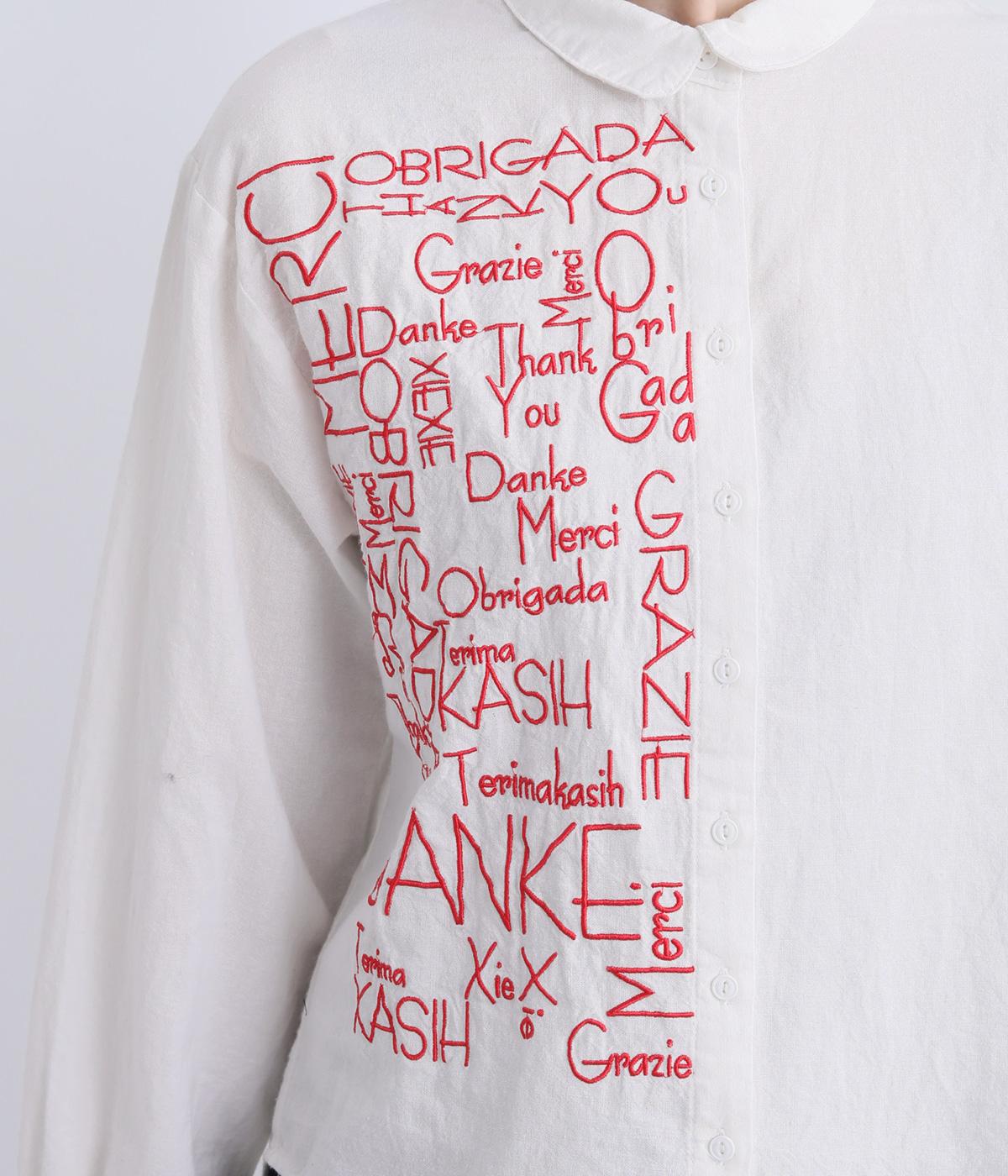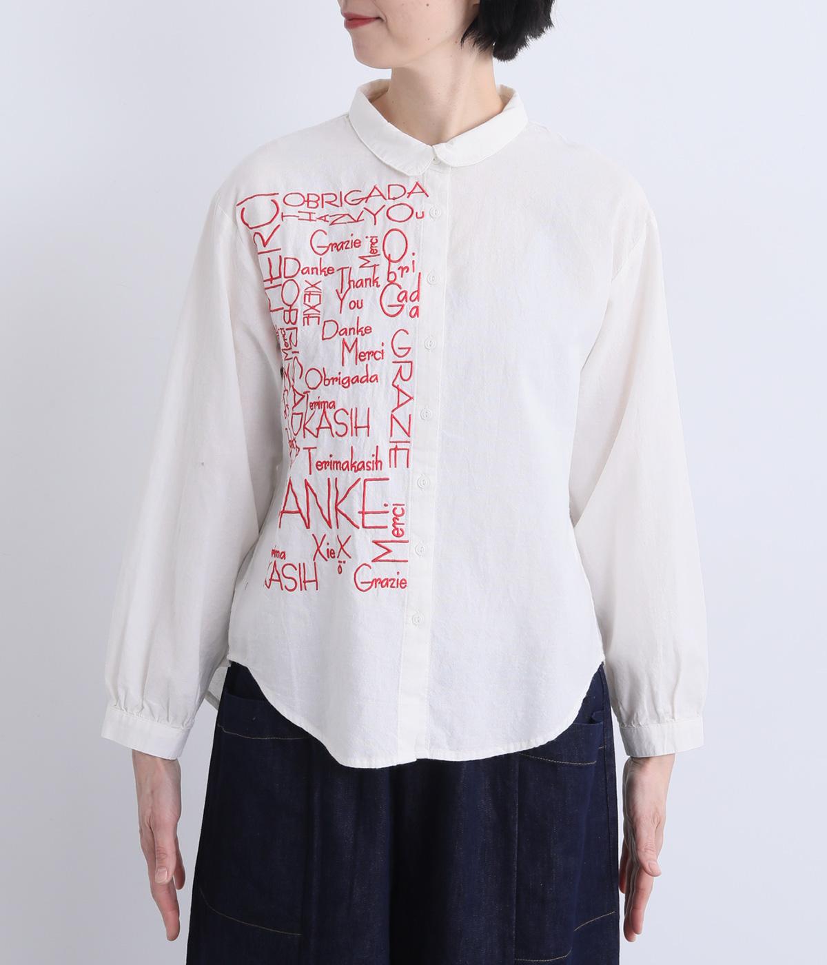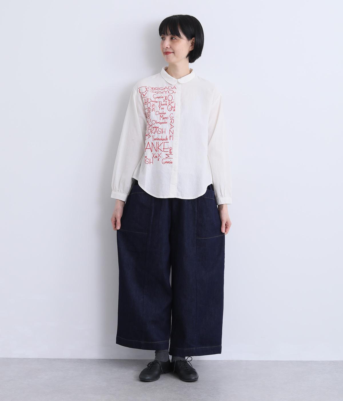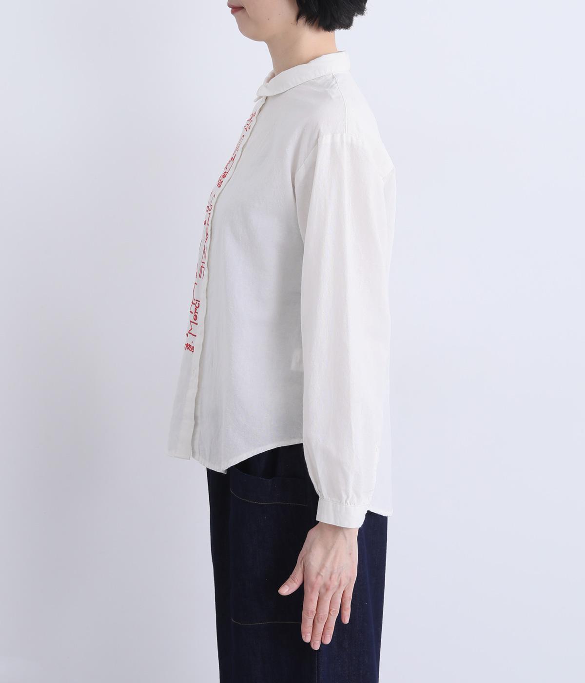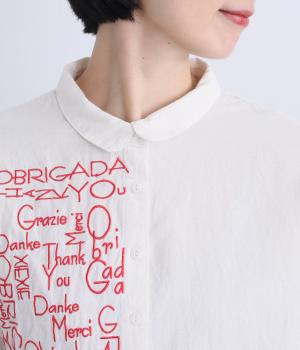 右身頃のみにほどこした刺しゅうメッセージがインパクト抜群な一枚。シャツのきちんと感を残しながらもキャッチーなデザインで着こなしのメインになります。ちょこんとついた丸襟やラウンドヘムなどディテールに女性らしさを。