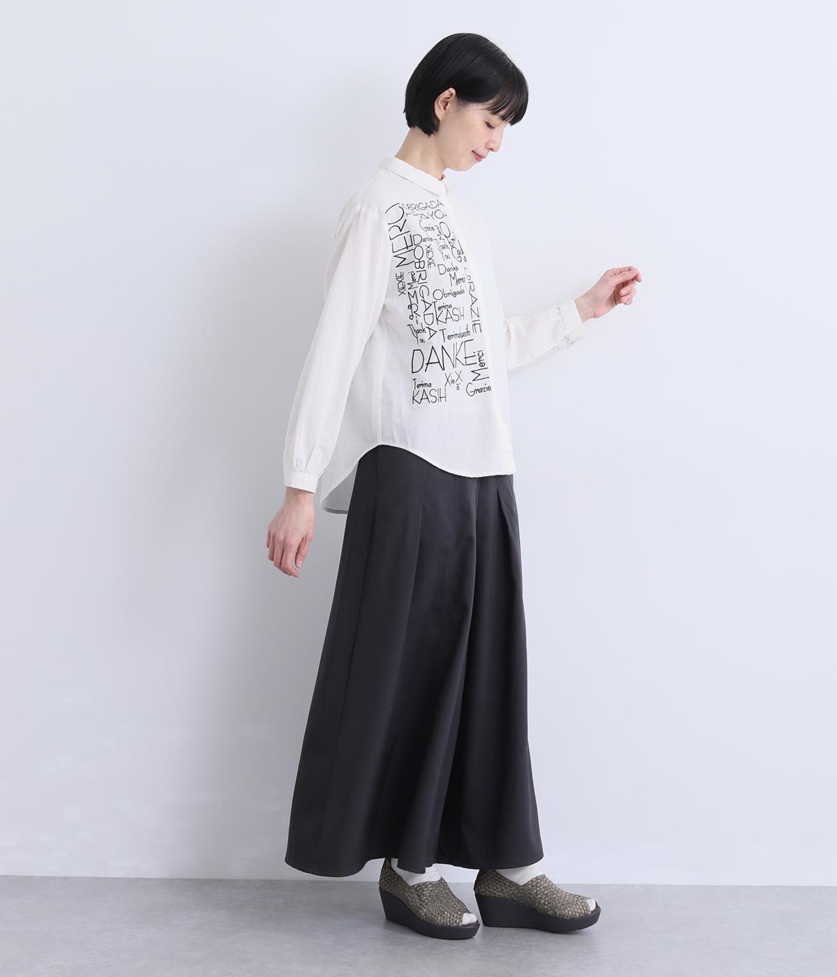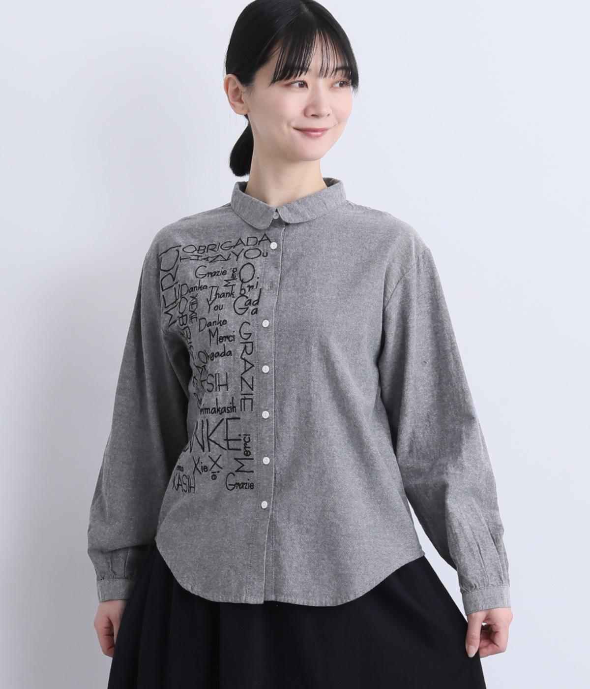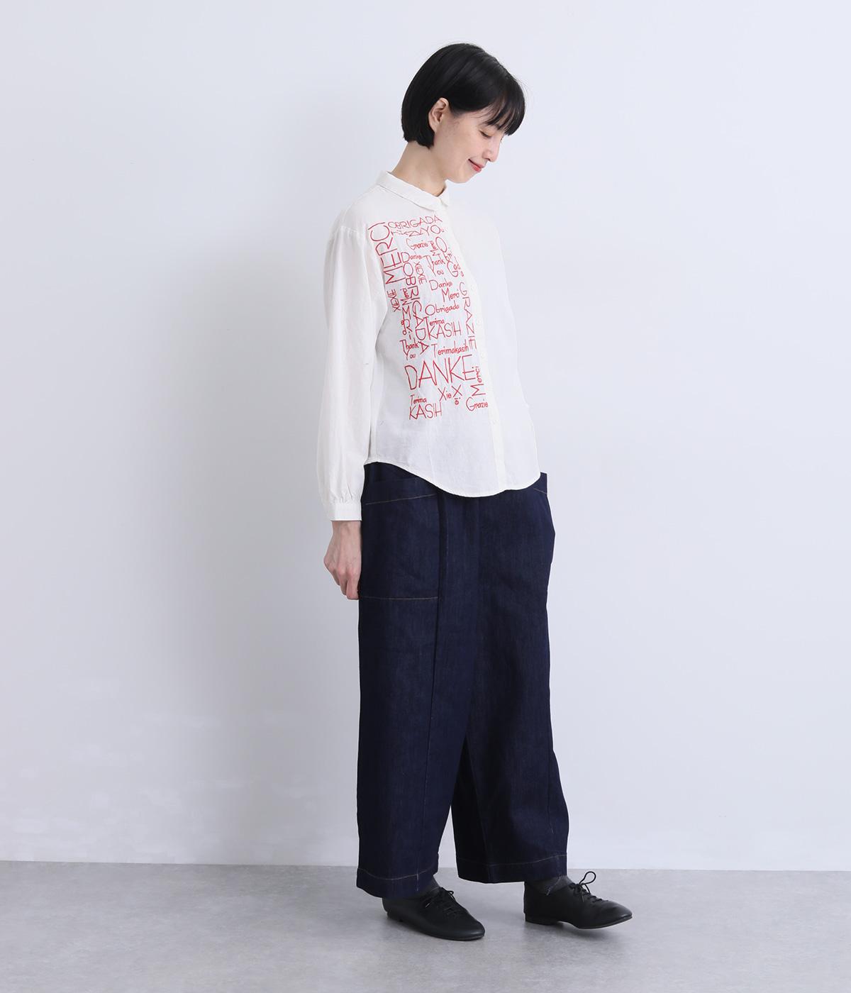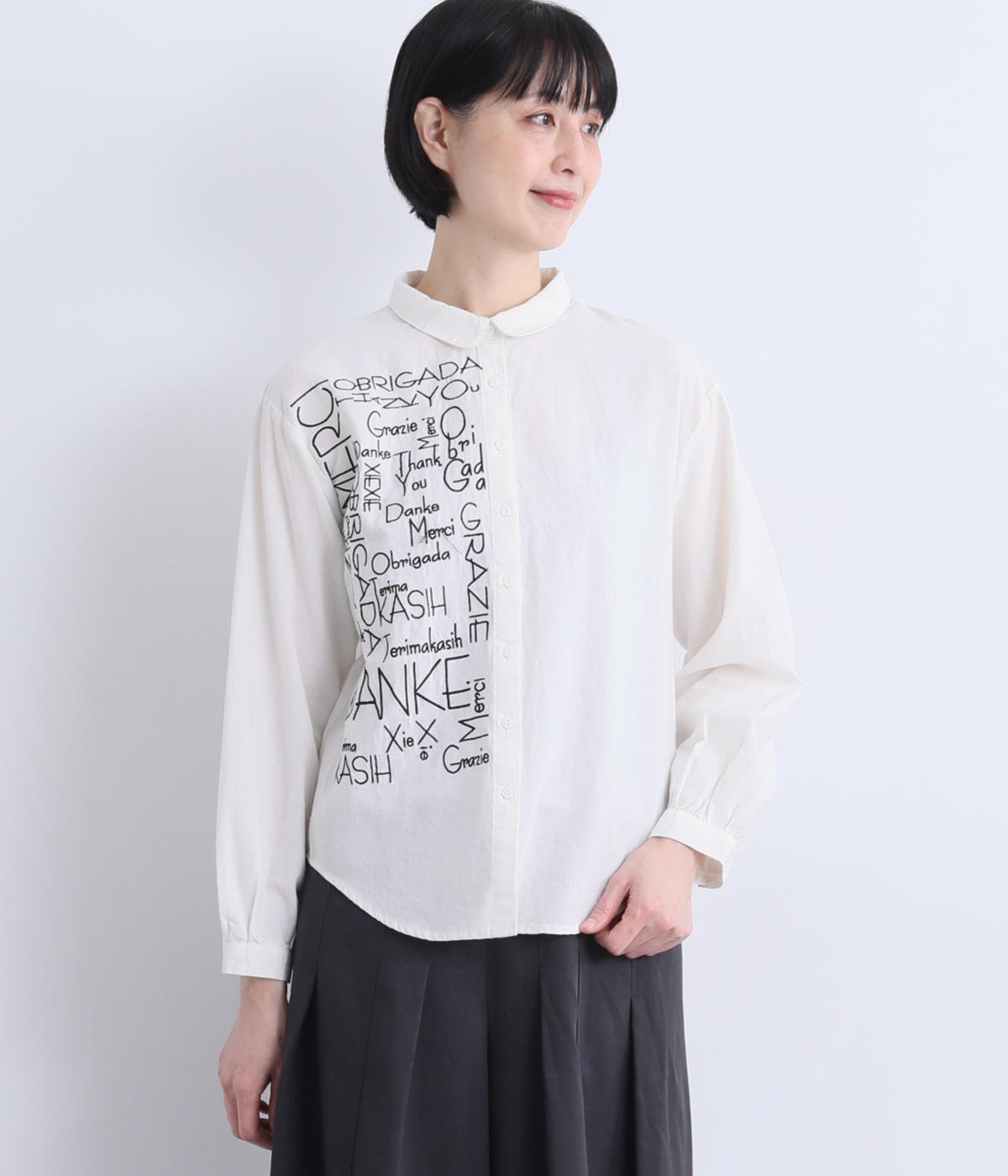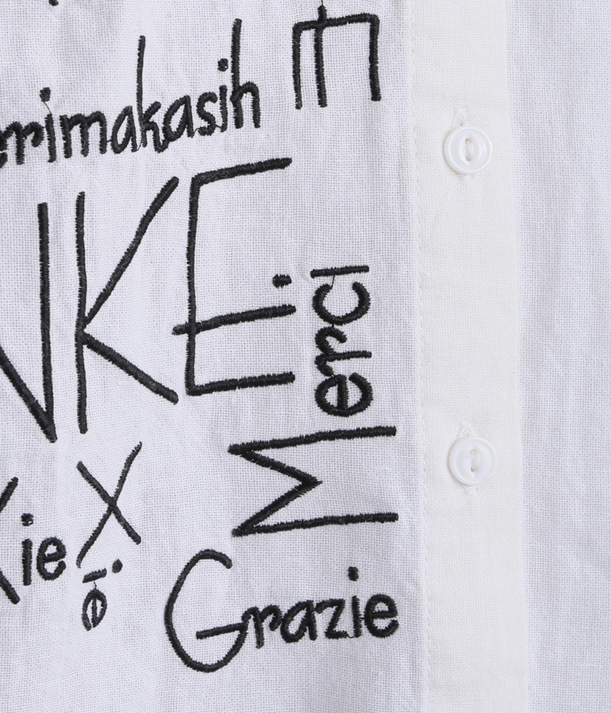 右身頃のみにほどこした刺しゅうメッセージがインパクト抜群な一枚。シャツのきちんと感を残しながらもキャッチーなデザインで着こなしのメインになります。ちょこんとついた丸襟やラウンドヘムなどディテールに女性らしさを。