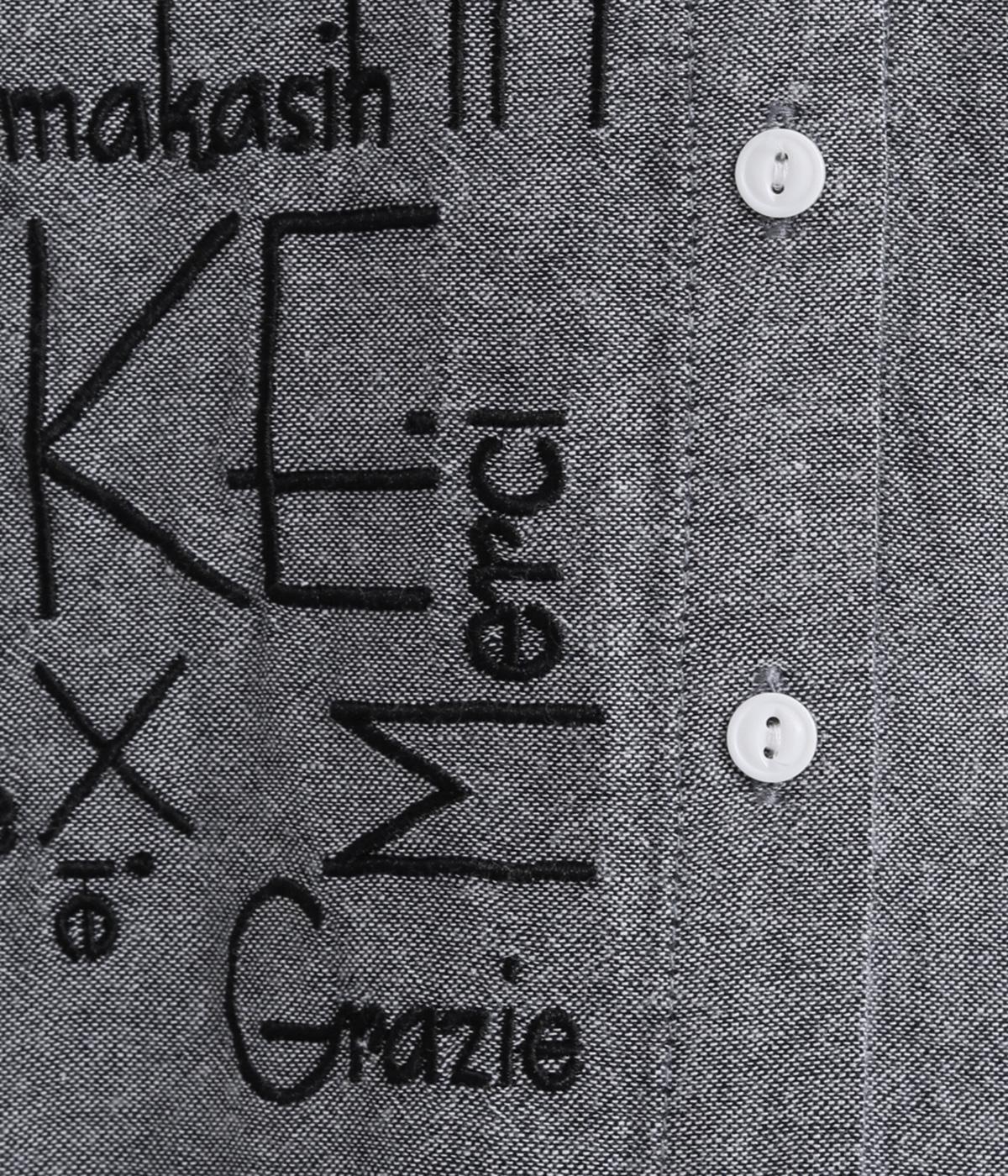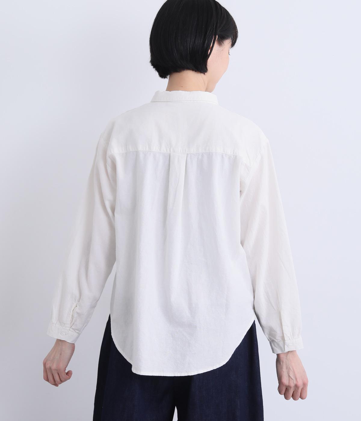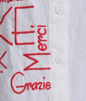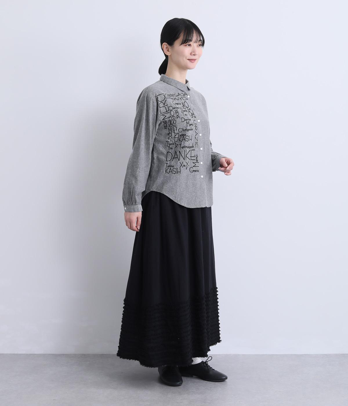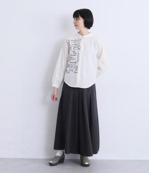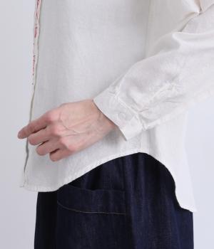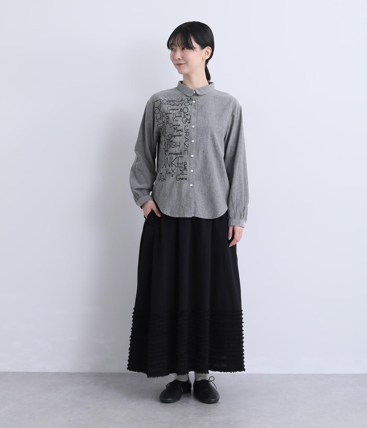 右身頃のみにほどこした刺しゅうメッセージがインパクト抜群な一枚。シャツのきちんと感を残しながらもキャッチーなデザインで着こなしのメインになります。ちょこんとついた丸襟やラウンドヘムなどディテールに女性らしさを。