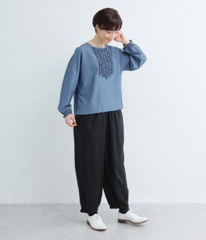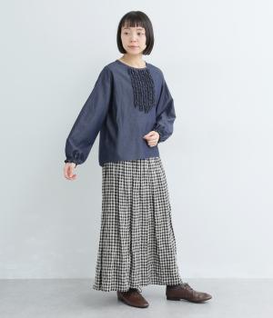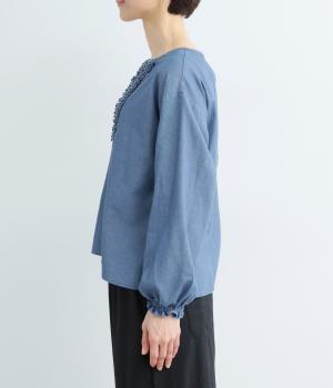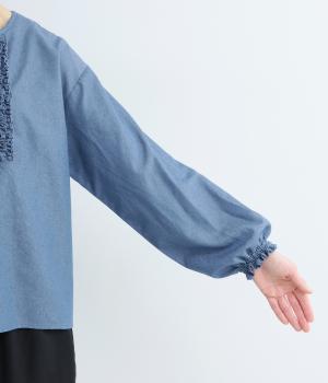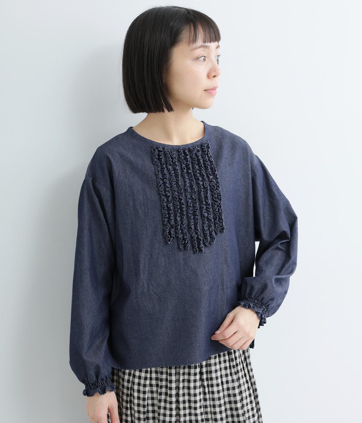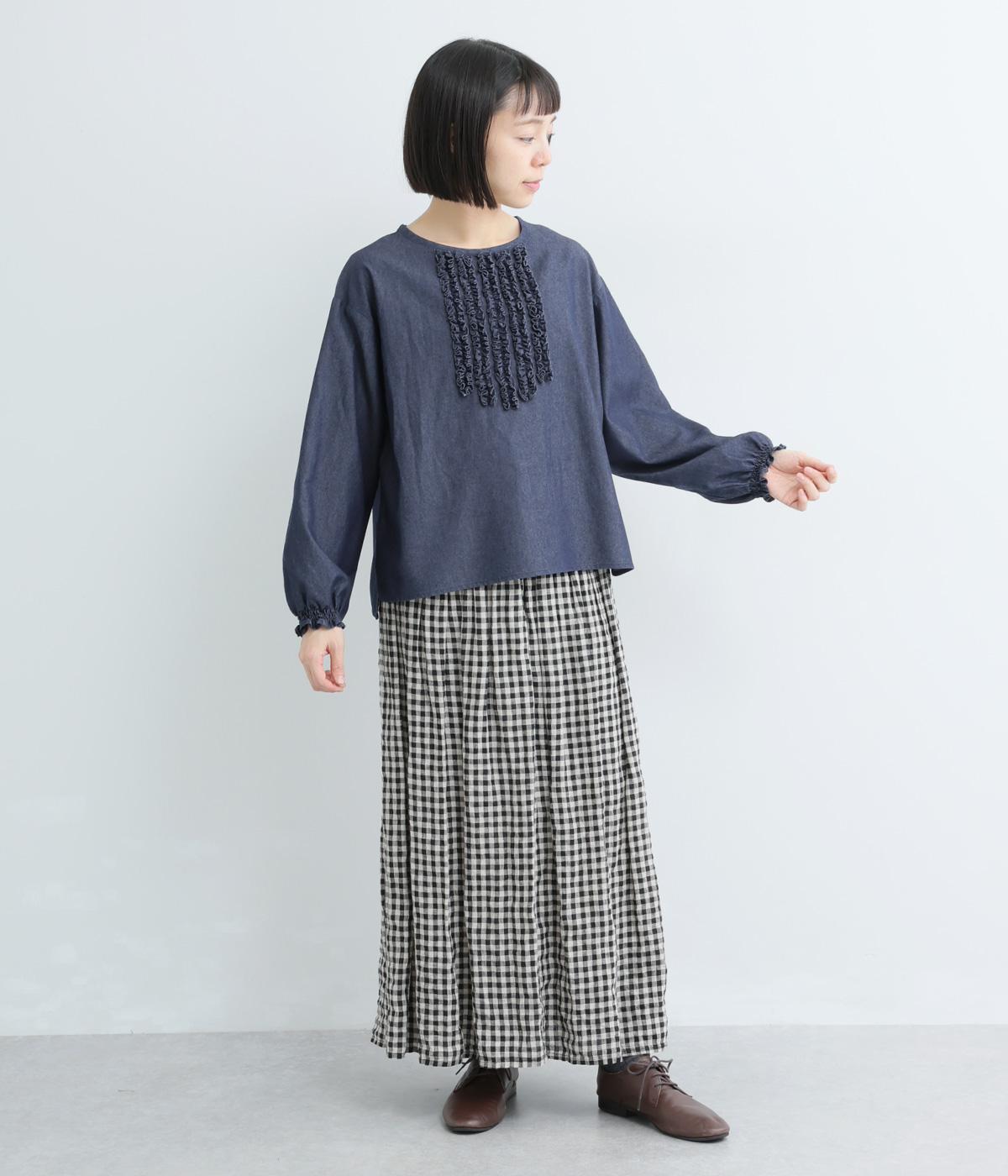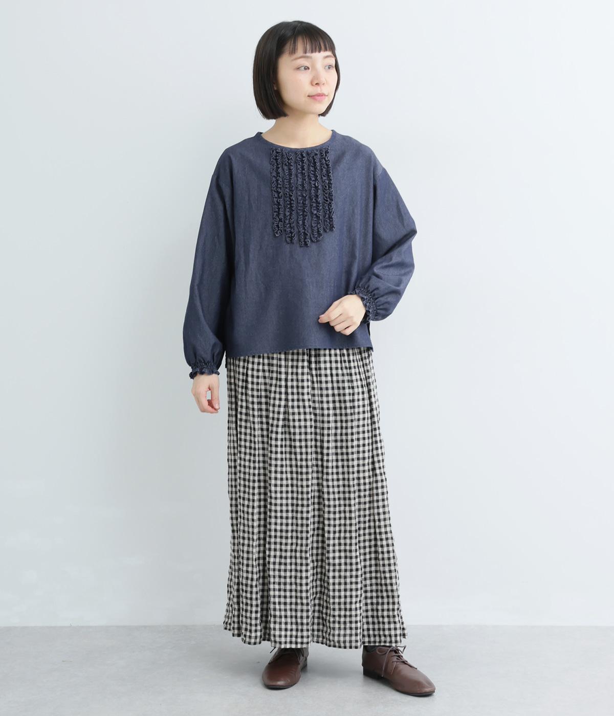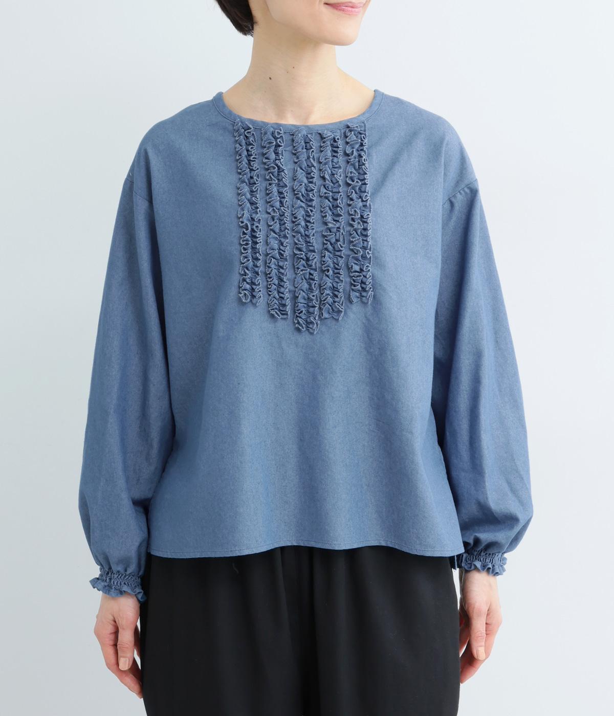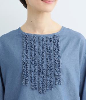 前身頃にあしらわれた、縦ラインのフリルが印象的なブラウスです。細かなギャザーが立体感を生み、やさしい奥行きを添えます。クルーネックのすっきりとしたラインが、上品で落ち着いた雰囲気に。着るだけで華やかさを演出する一着です。