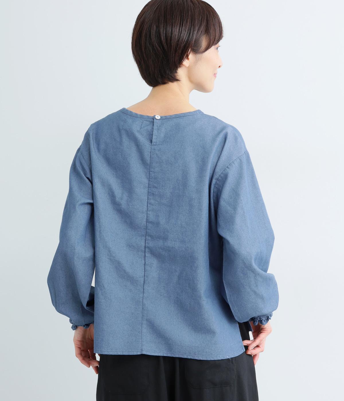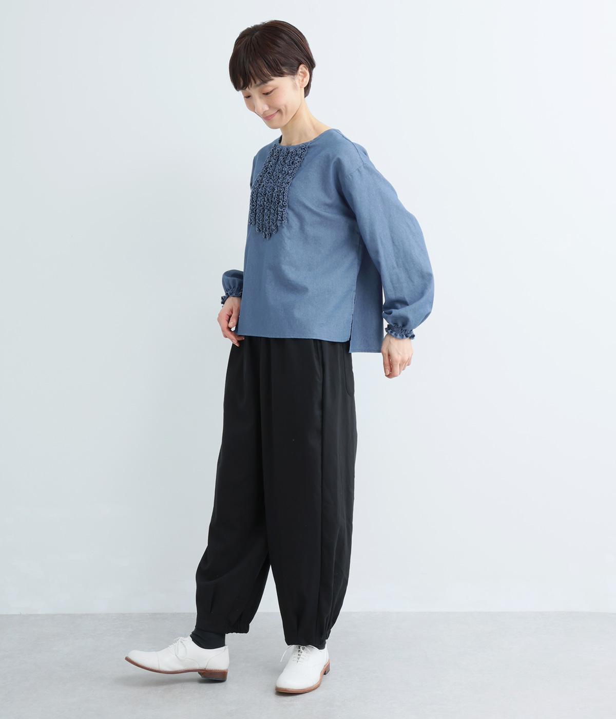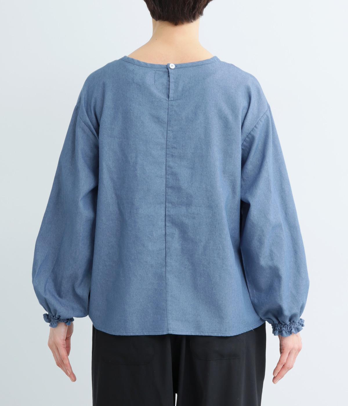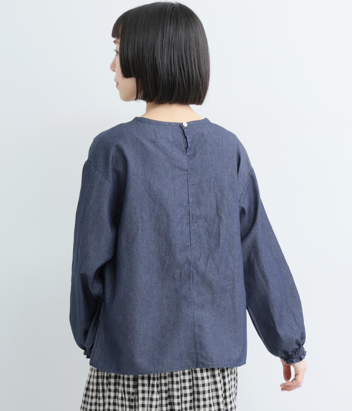 やや薄手でしなやかなコットン混デニム素材を使用。なめらかな肌ざわりと、軽やかな着心地が魅力です。ほのかな光沢がカジュアルすぎない印象を添え、ラフさのなかにも上品さを感じられる風合いに。