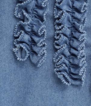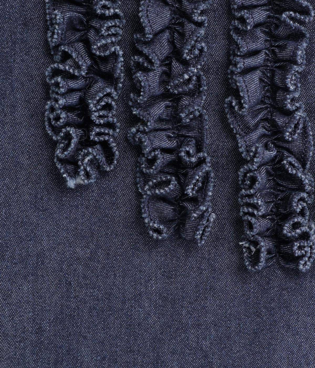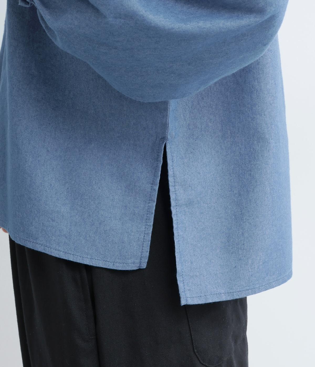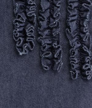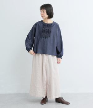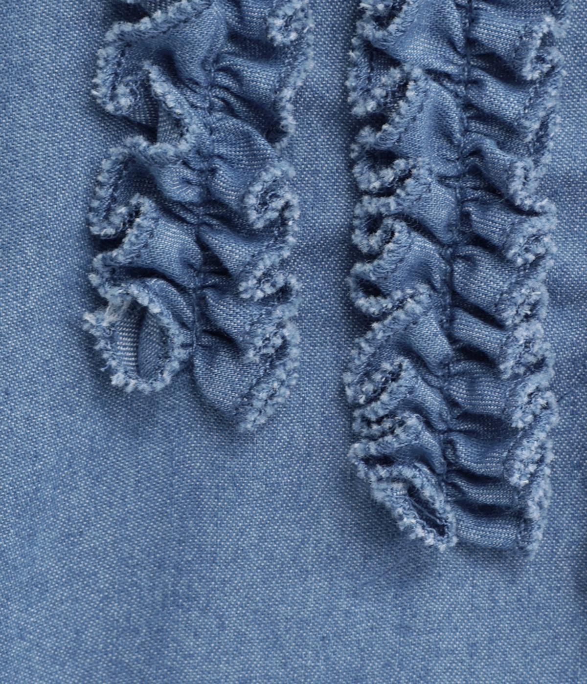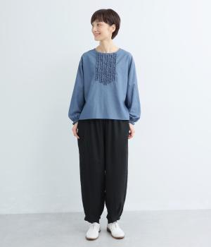 やや薄手でしなやかなコットン混デニム素材を使用。なめらかな肌ざわりと、軽やかな着心地が魅力です。ほのかな光沢がカジュアルすぎない印象を添え、ラフさのなかにも上品さを感じられる風合いに。