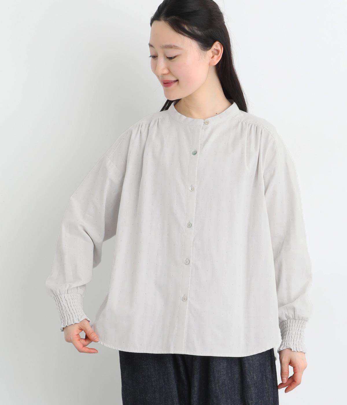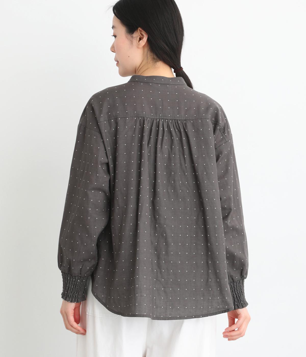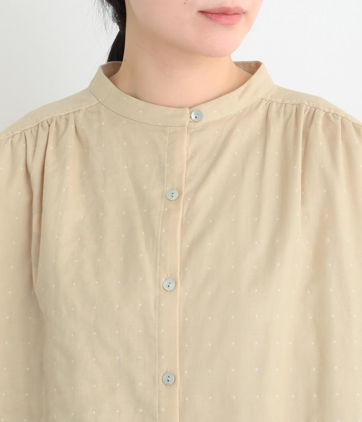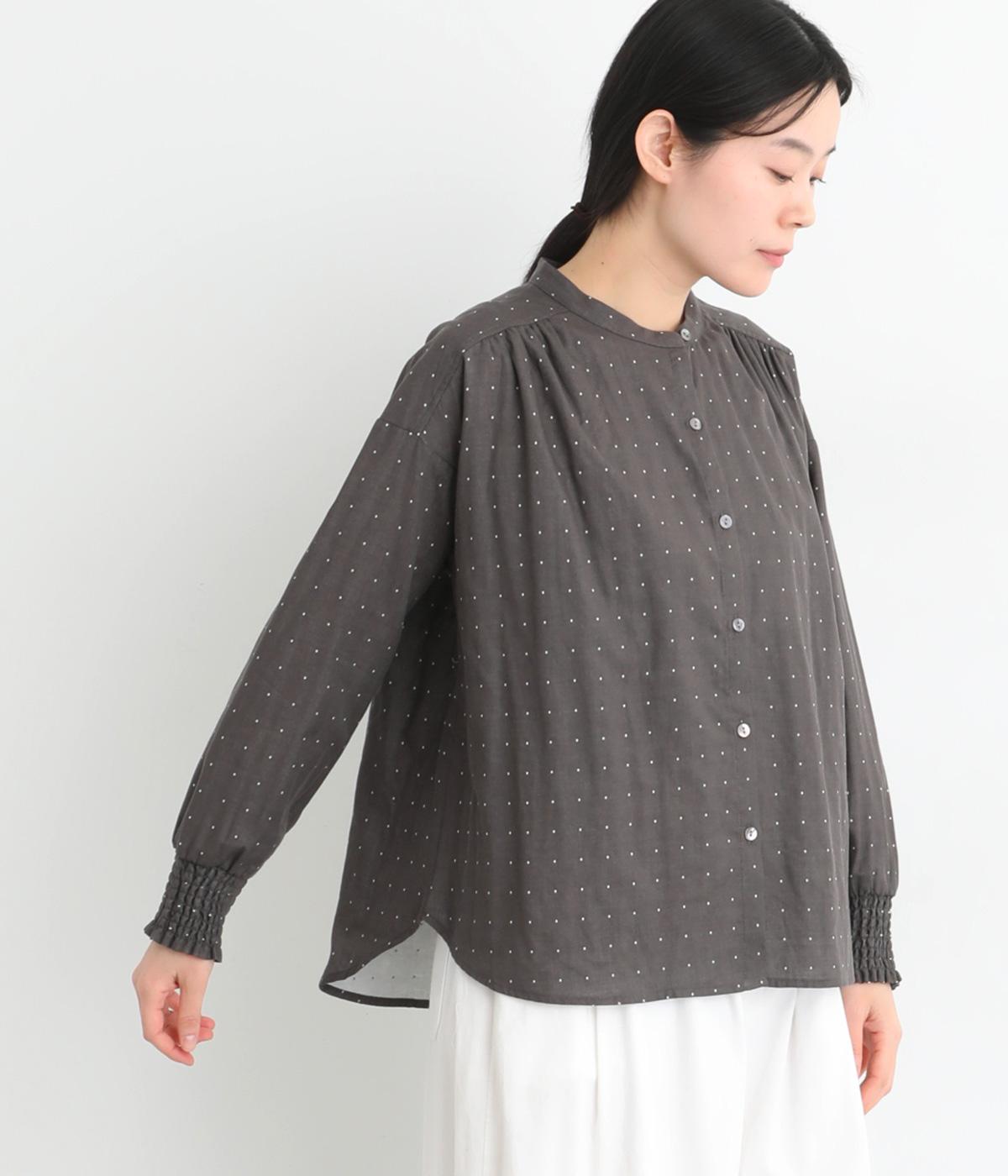 ショルダーヨークからギャザーをあしらい、ふわりとしたシルエットに仕上げたスタンドカラーブラウス。袖口はシャーリングゴム仕様で、着脱やたくし上げも快適に行えます。ドットの愛らしさがやさしい雰囲気を引き立てます。