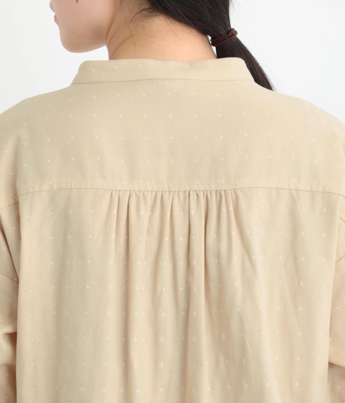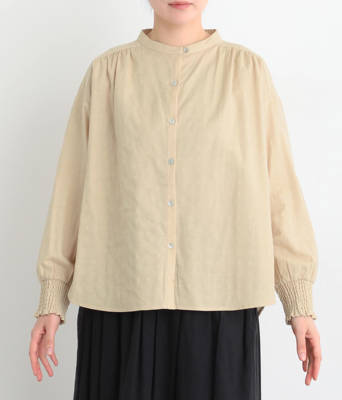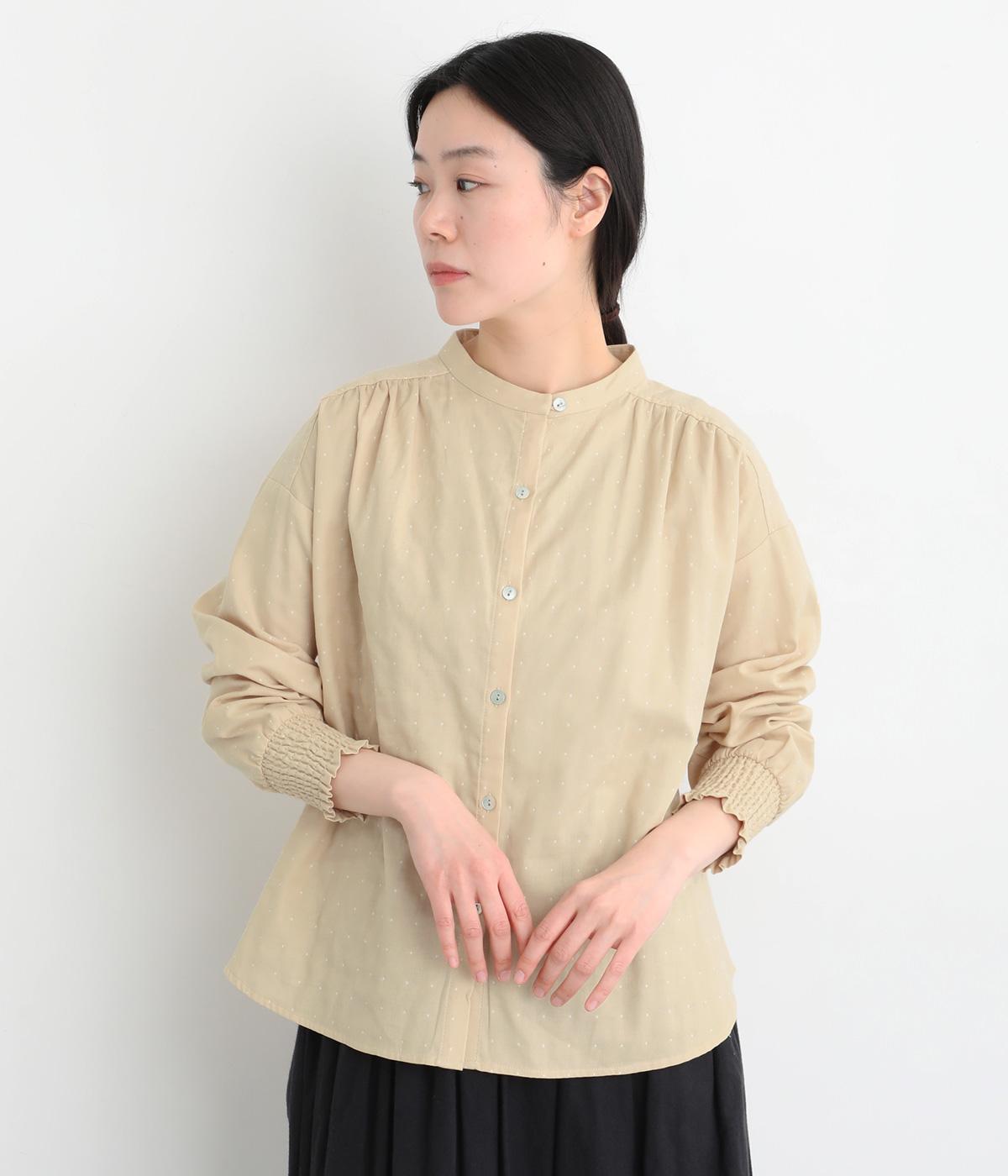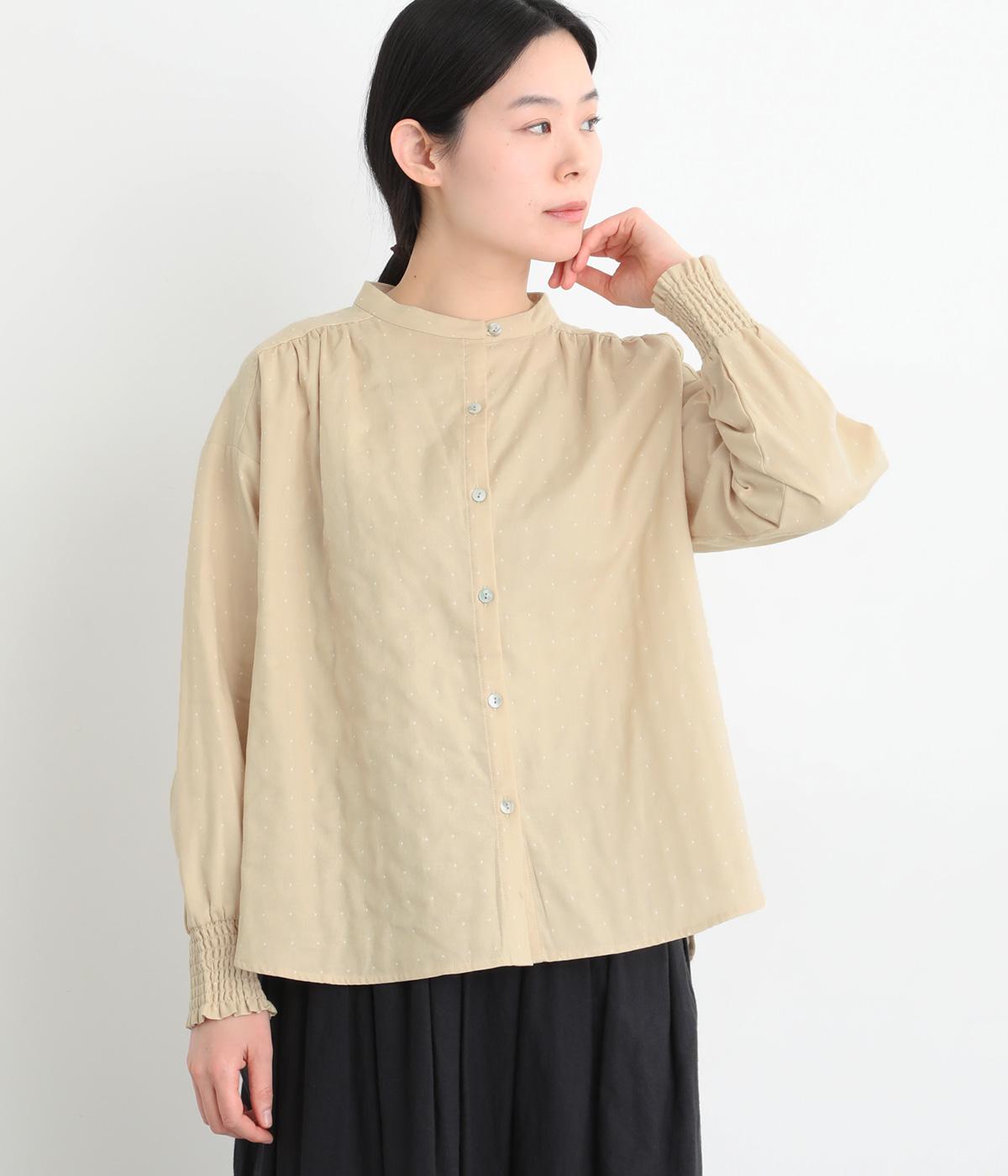ショルダーヨークからギャザーをあしらい、ふわりとしたシルエットに仕上げたスタンドカラーブラウス。袖口はシャーリングゴム仕様で、着脱やたくし上げも快適に行えます。ドットの愛らしさがやさしい雰囲気を引き立てます。