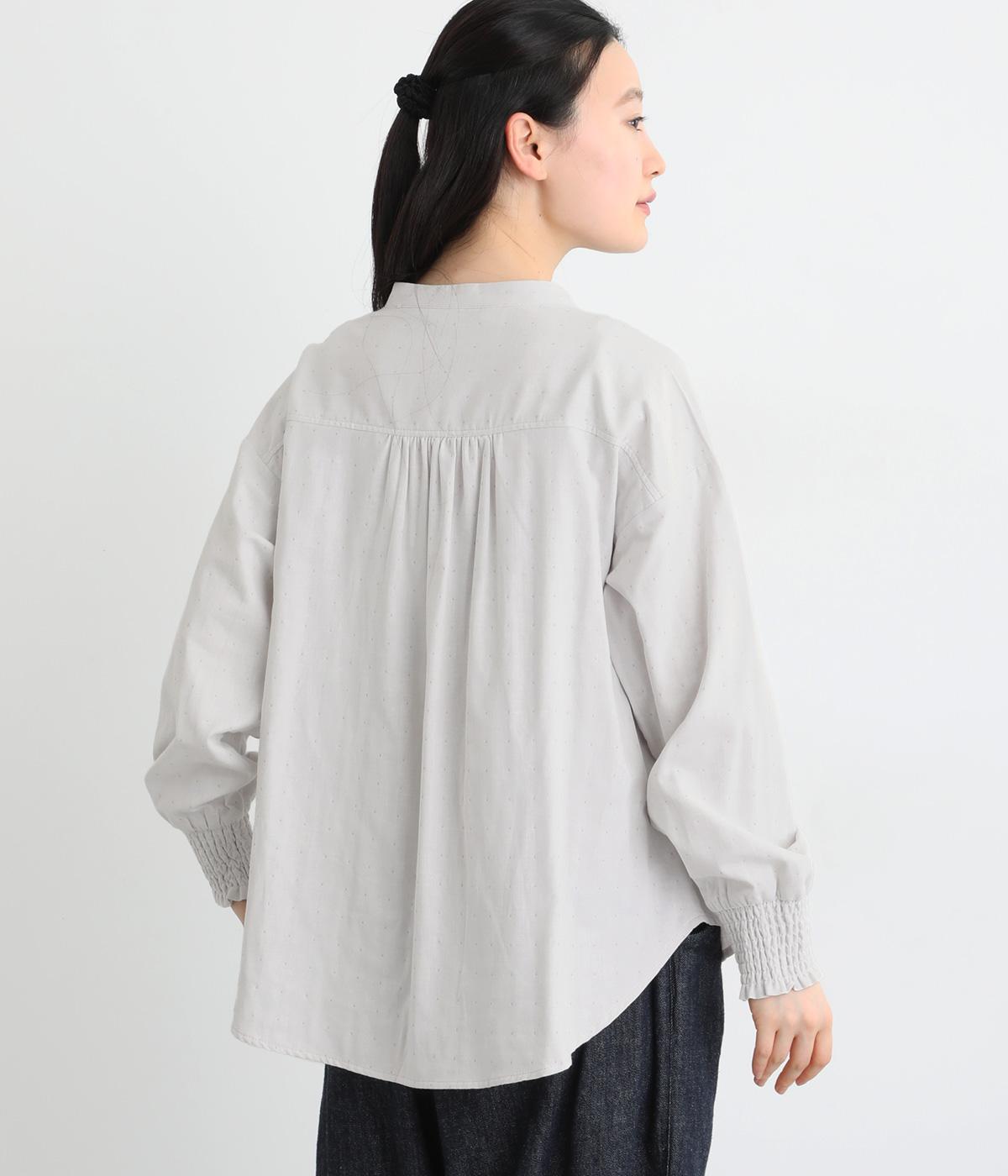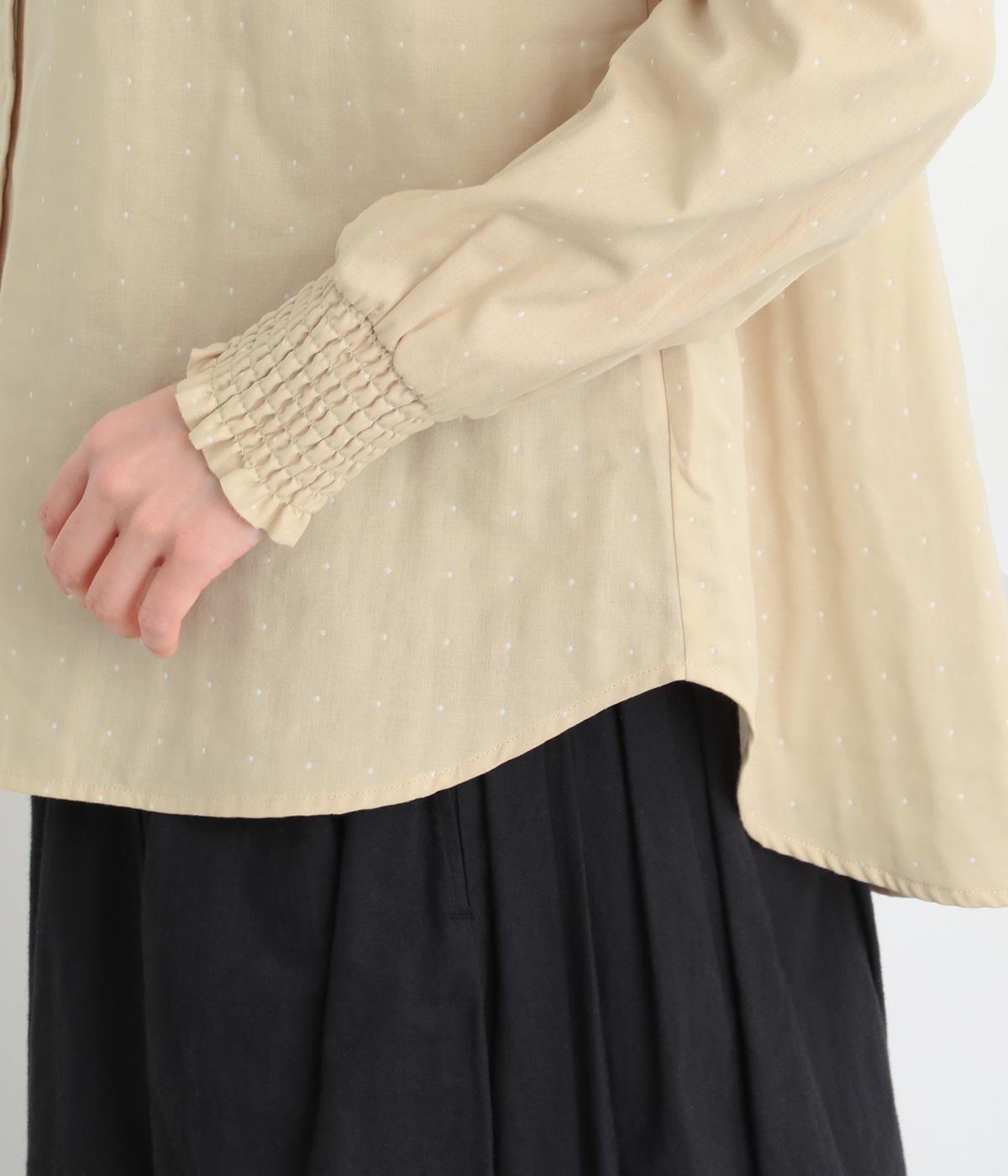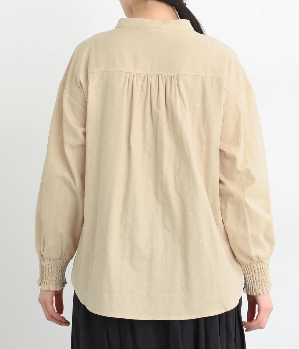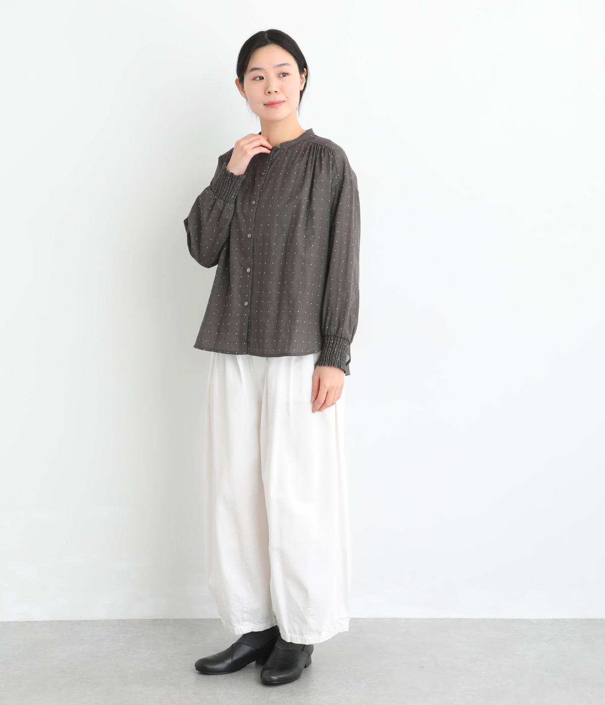 ショルダーヨークからギャザーをあしらい、ふわりとしたシルエットに仕上げたスタンドカラーブラウス。袖口はシャーリングゴム仕様で、着脱やたくし上げも快適に行えます。ドットの愛らしさがやさしい雰囲気を引き立てます。