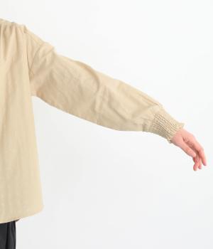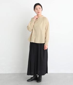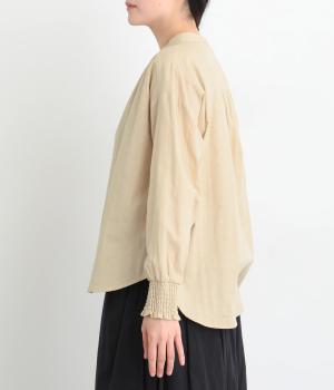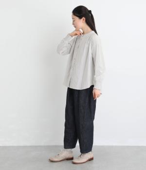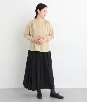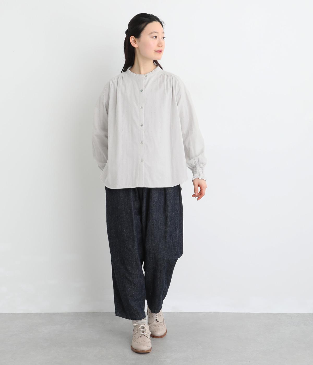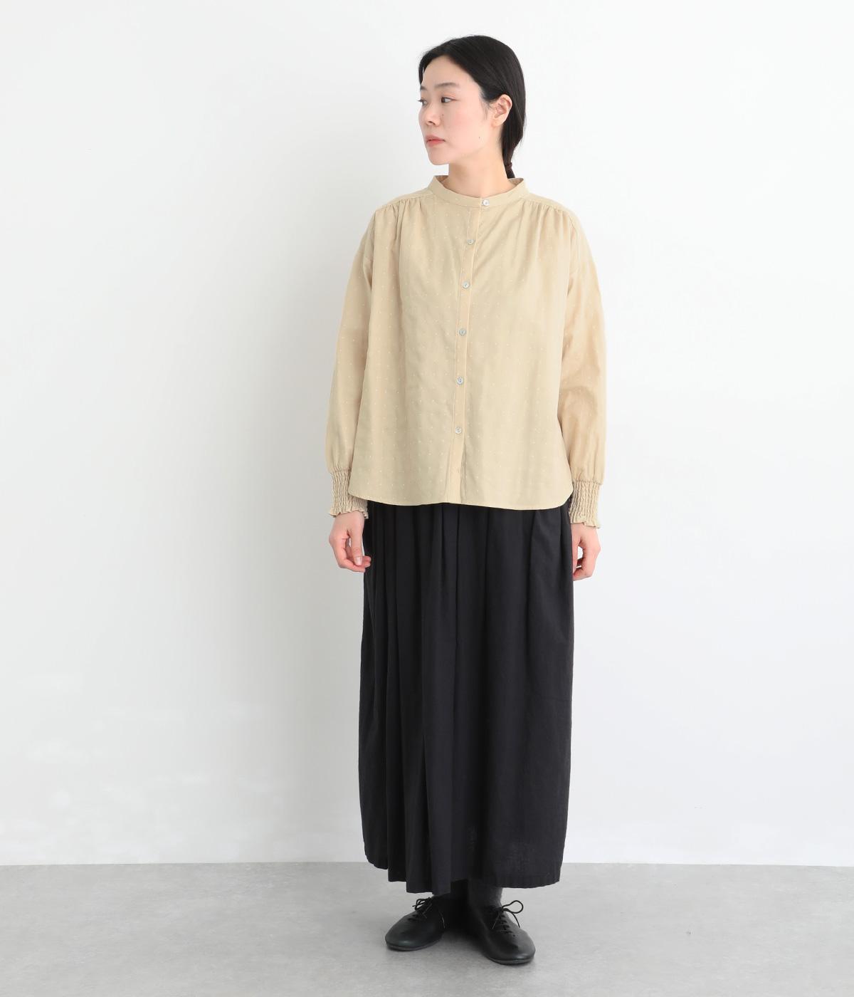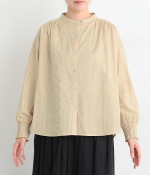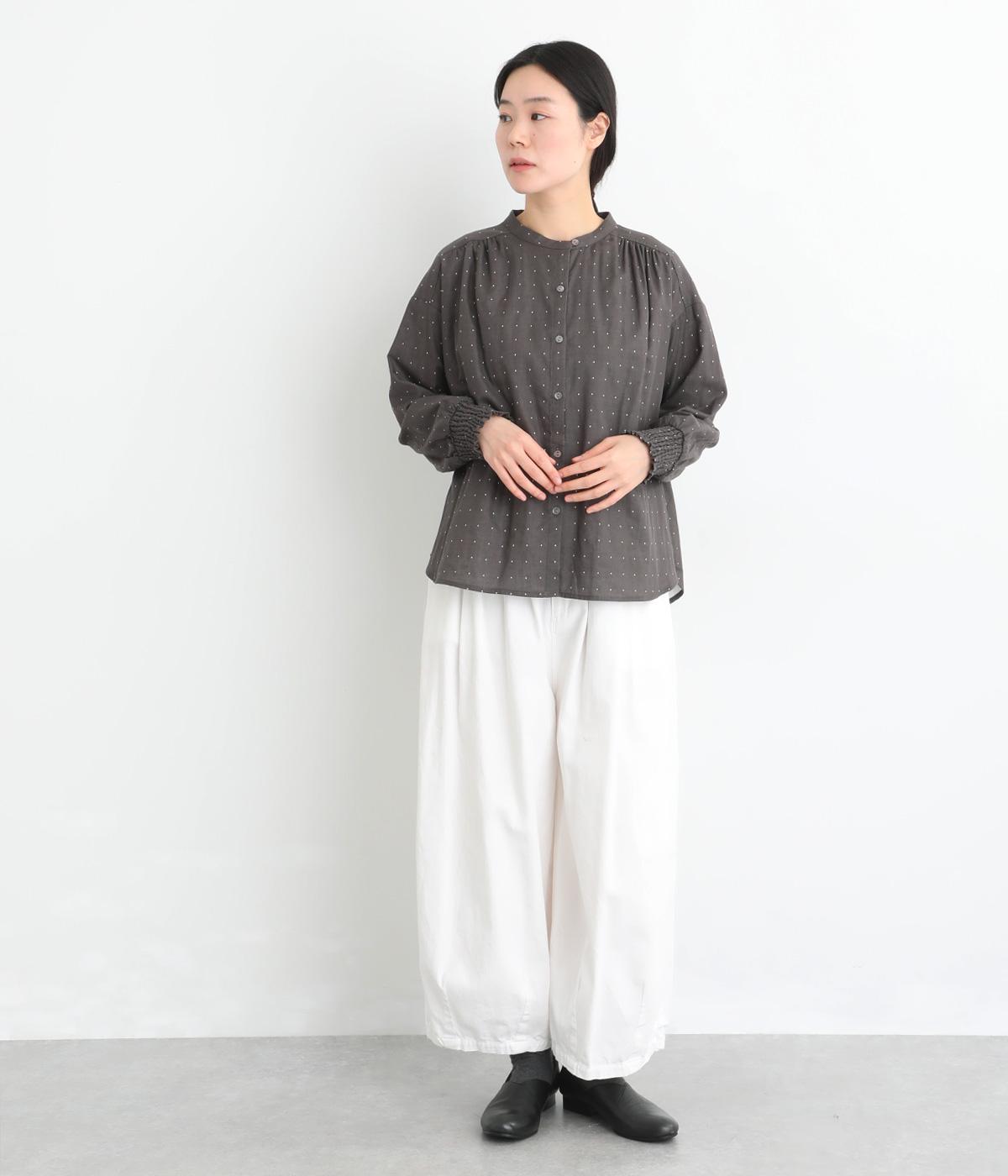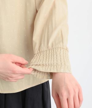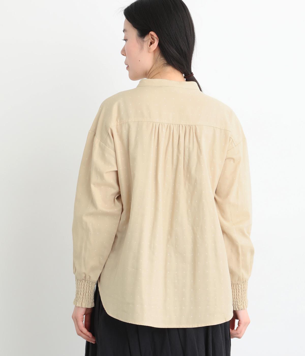 ショルダーヨークからギャザーをあしらい、ふわりとしたシルエットに仕上げたスタンドカラーブラウス。袖口はシャーリングゴム仕様で、着脱やたくし上げも快適に行えます。ドットの愛らしさがやさしい雰囲気を引き立てます。
