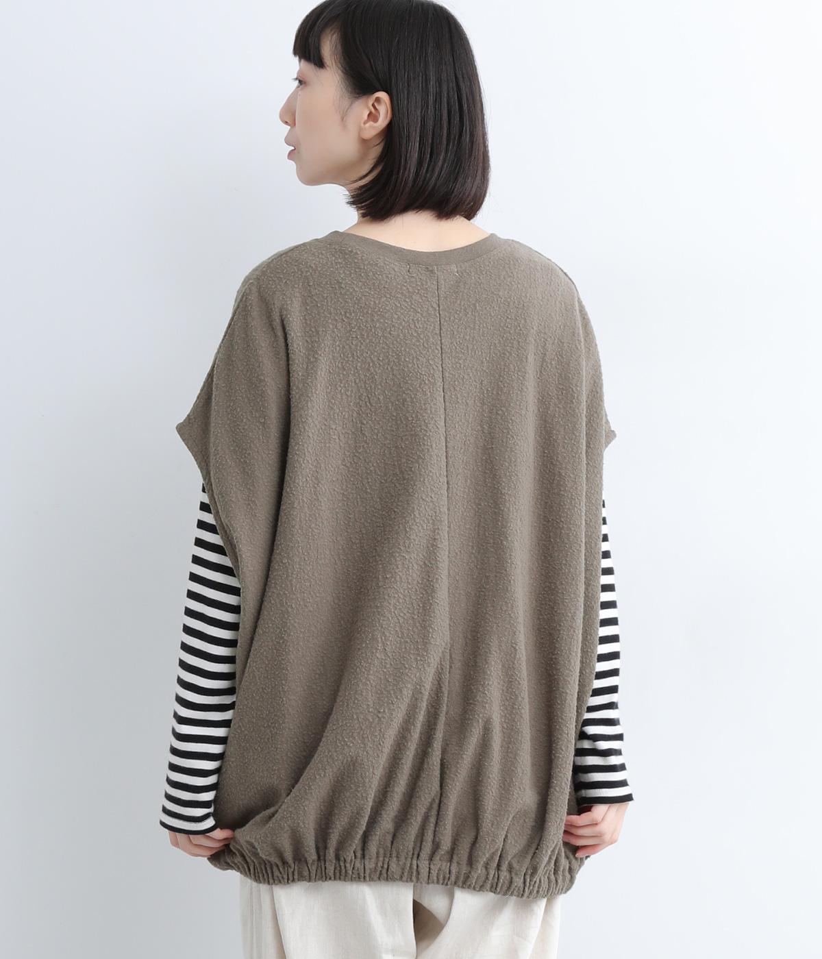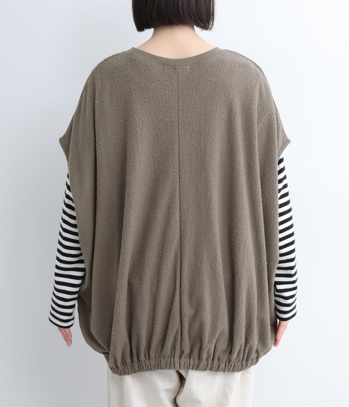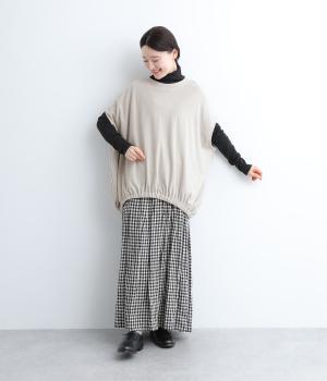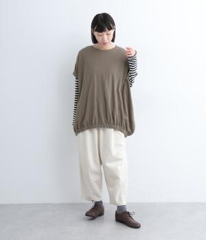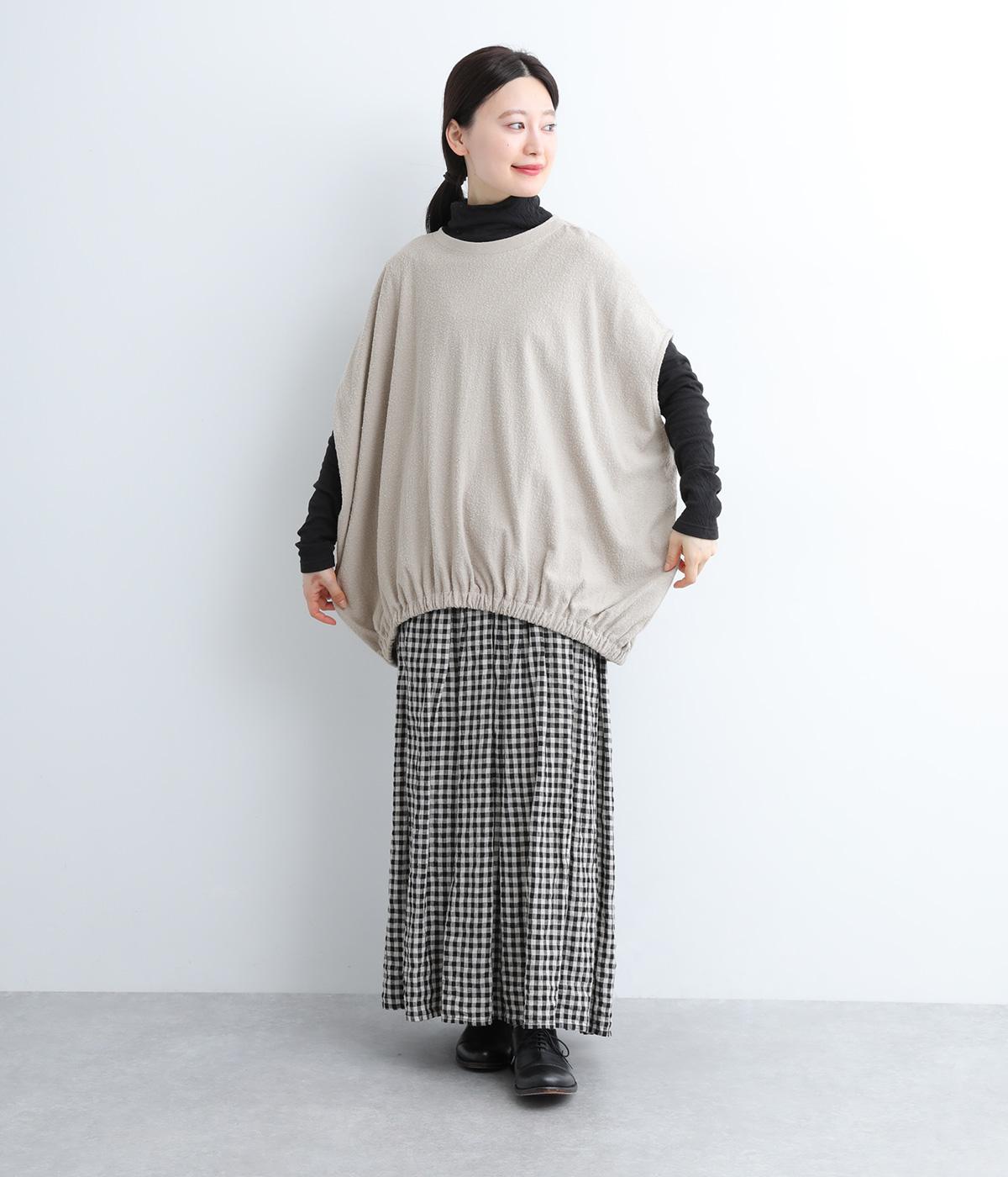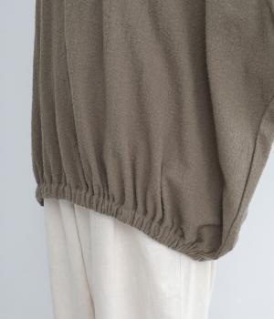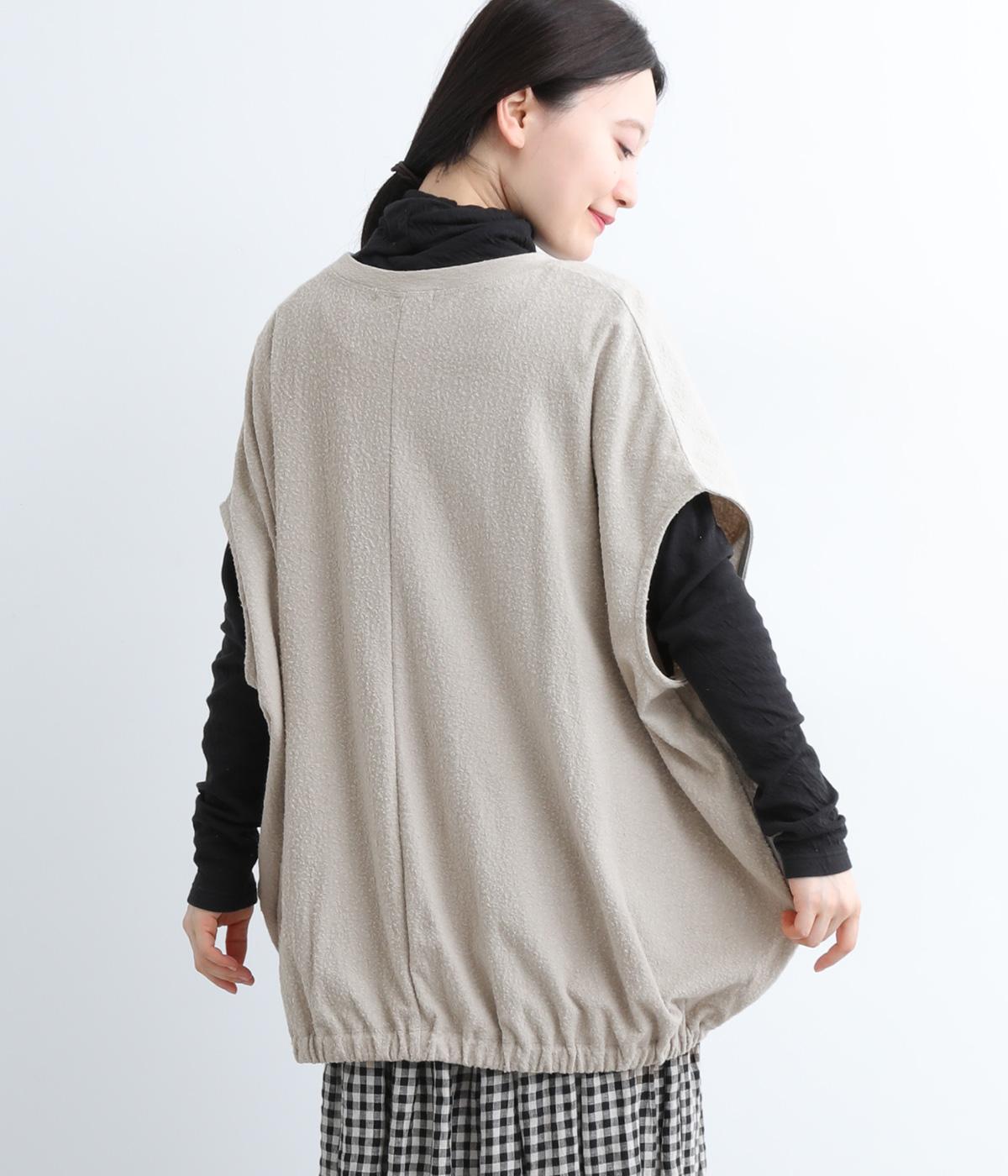 体を包み込むようにたっぷりとしたシルエットが目を惹きます。ゴム入りの裾がきゅっとメリハリをつけて立体感のあるラインを演出。着こなしのメインになるようなベストで、一枚持っているとスタイルチェンジに重宝します。