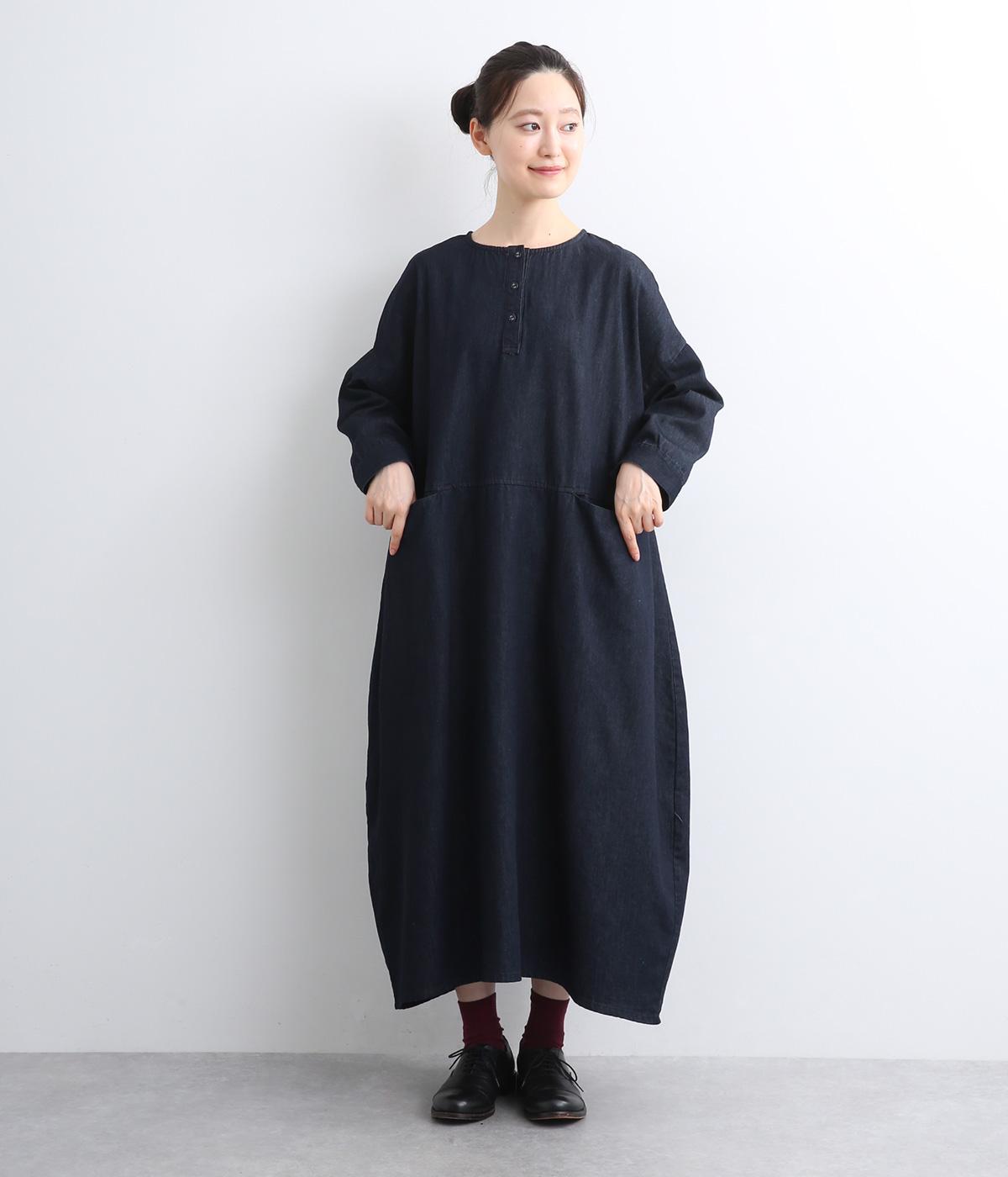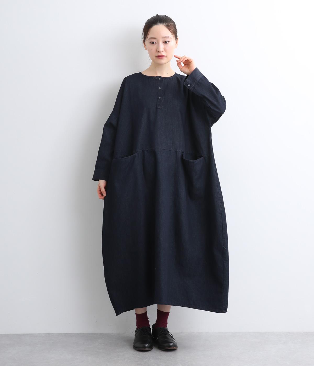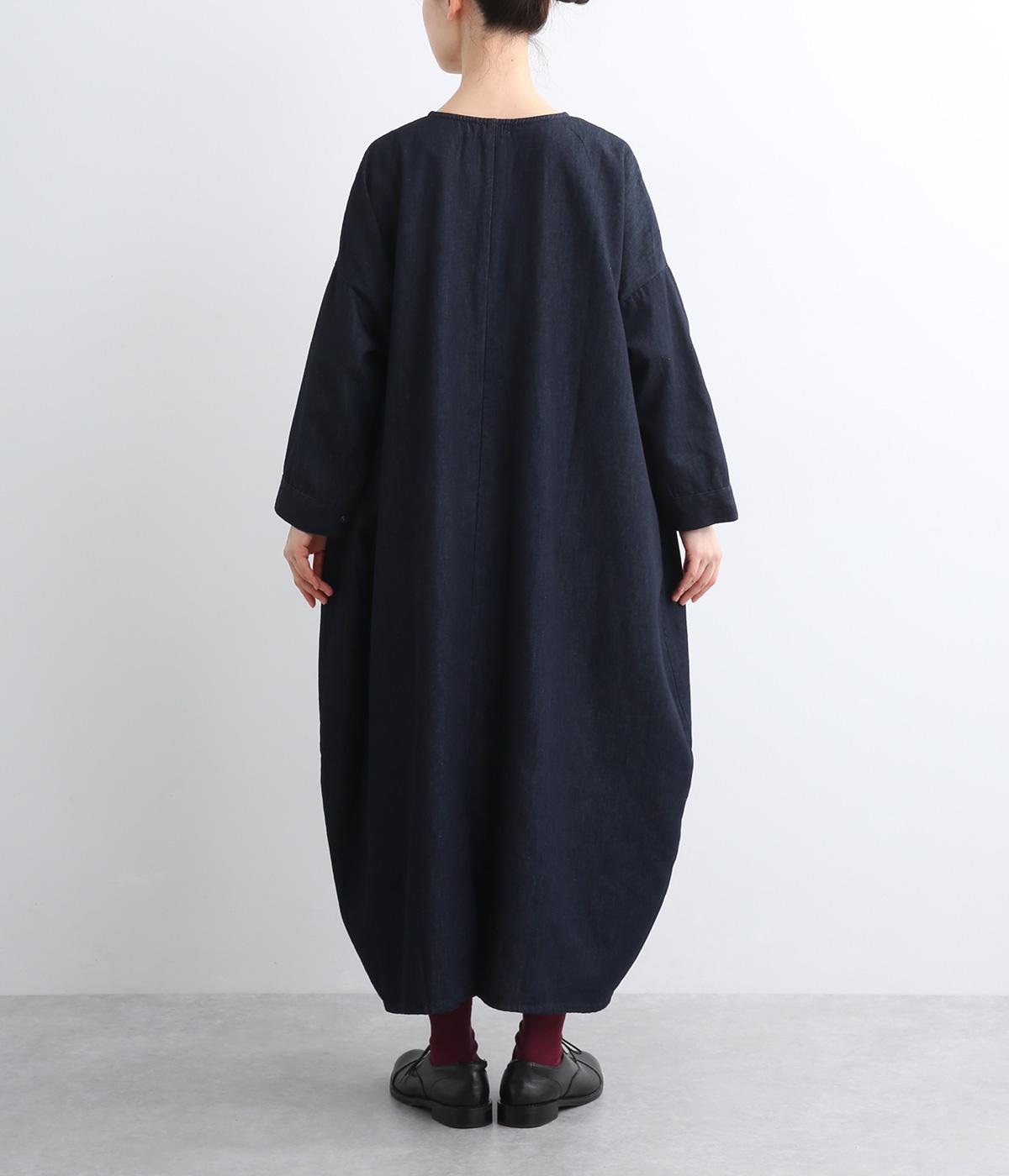 裾に向かって丸みを帯びたコクーンシルエットのワンピースです。フロントはボタン仕様で、少し開ければ抜け感を出すことも可能。両サイドに大きなポケットがついており、シンプルながら印象的な1枚です。