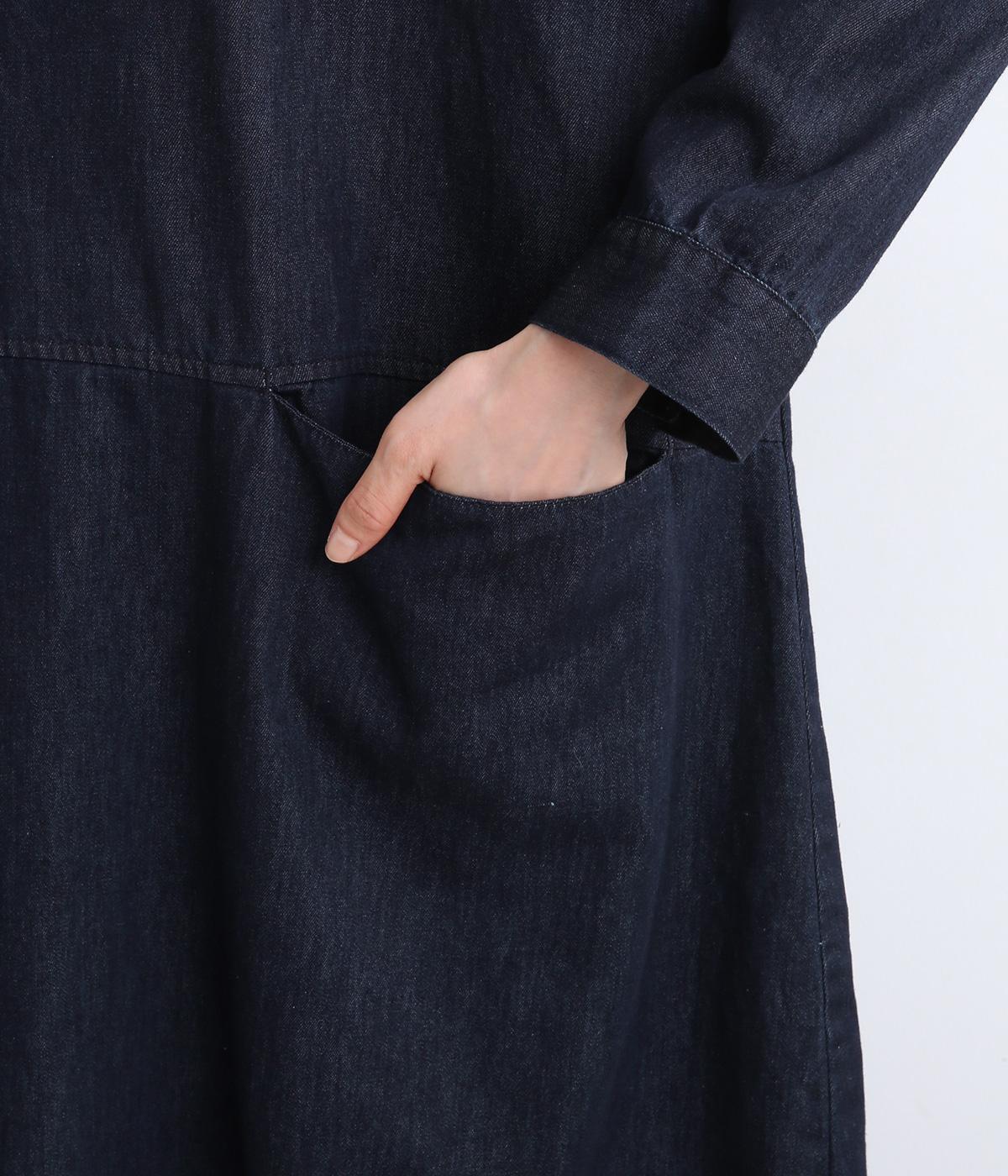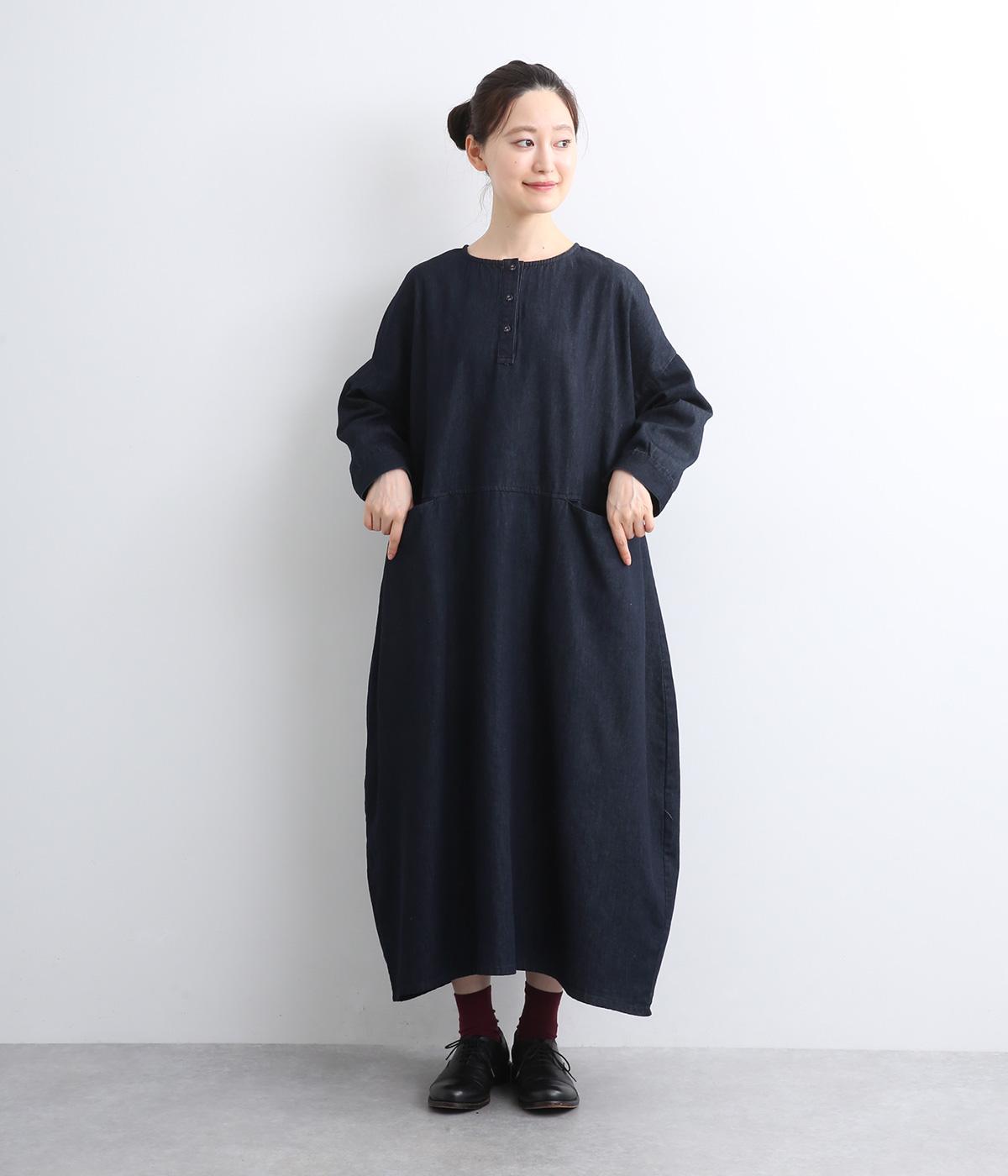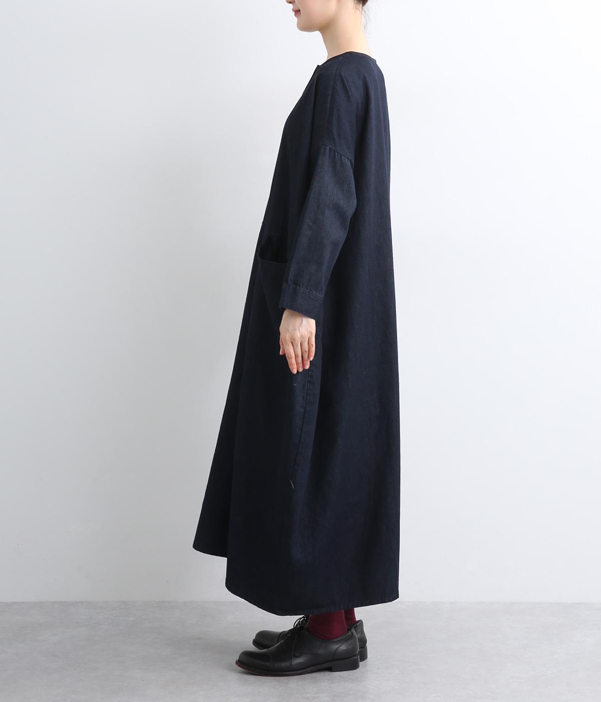 裾に向かって丸みを帯びたコクーンシルエットのワンピースです。フロントはボタン仕様で、少し開ければ抜け感を出すことも可能。両サイドに大きなポケットがついており、シンプルながら印象的な1枚です。