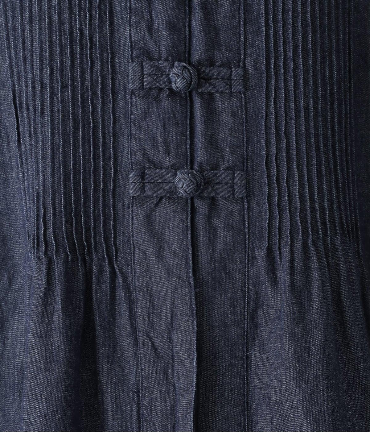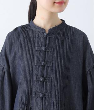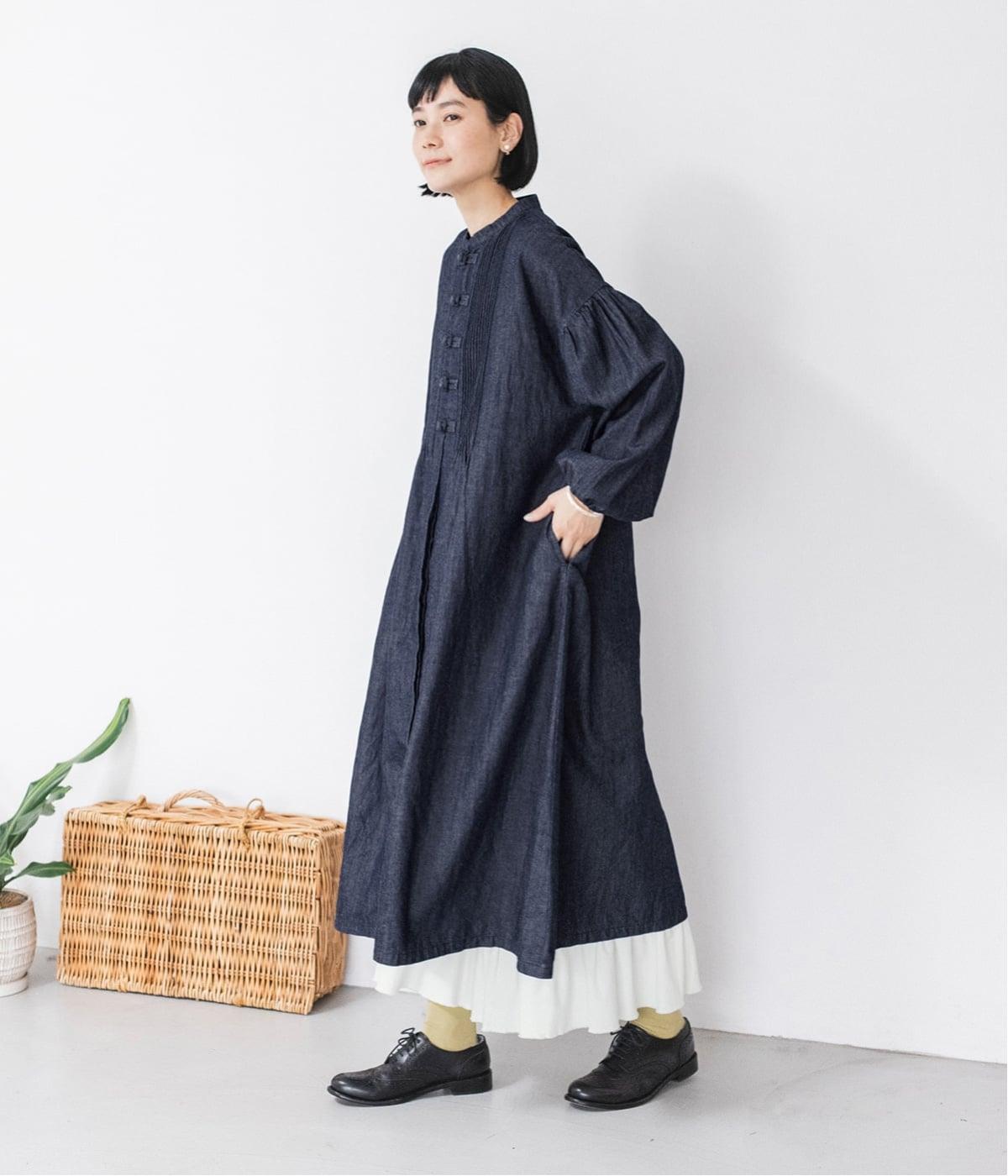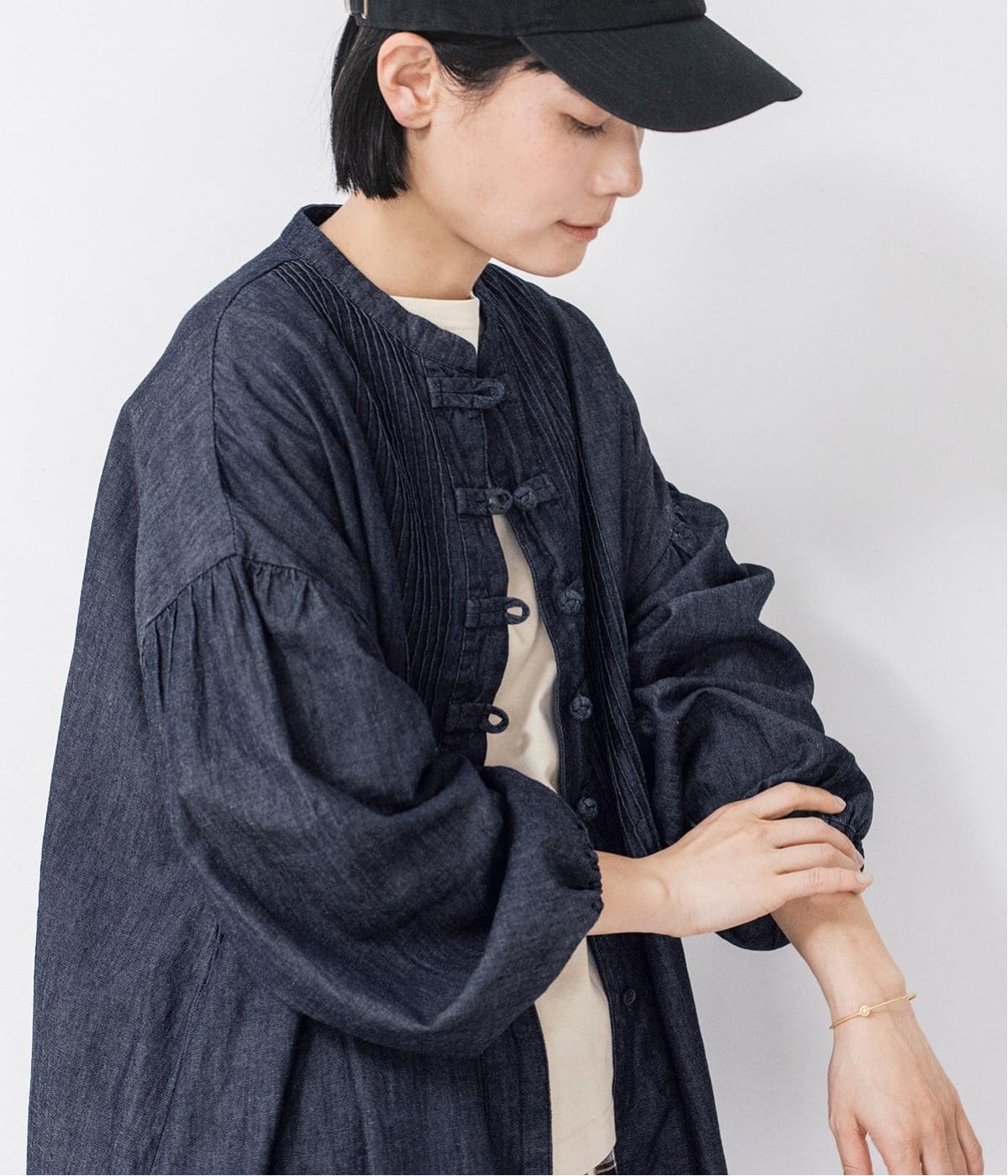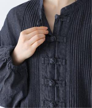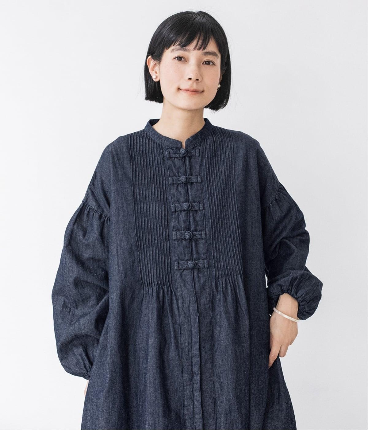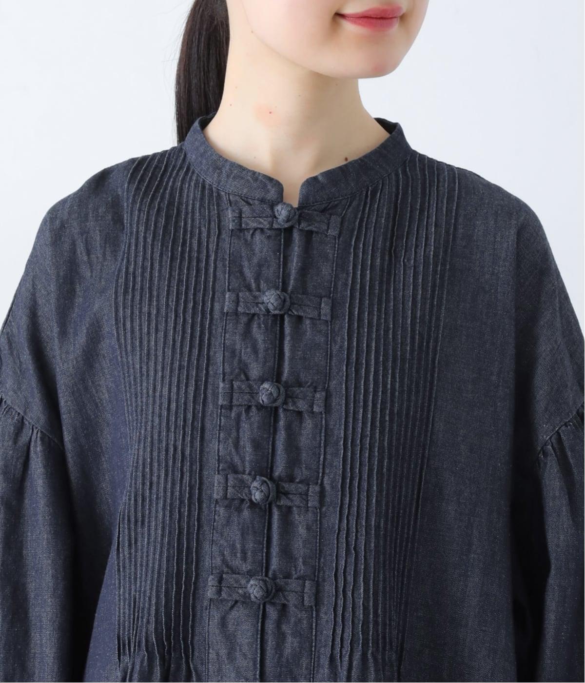 チャイナボタンや繊細なピンタックが目を惹くコットンリネンデニムのブラウスとワンピース。