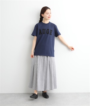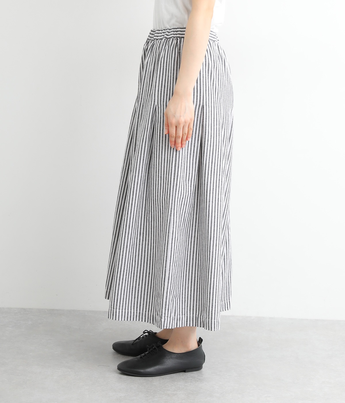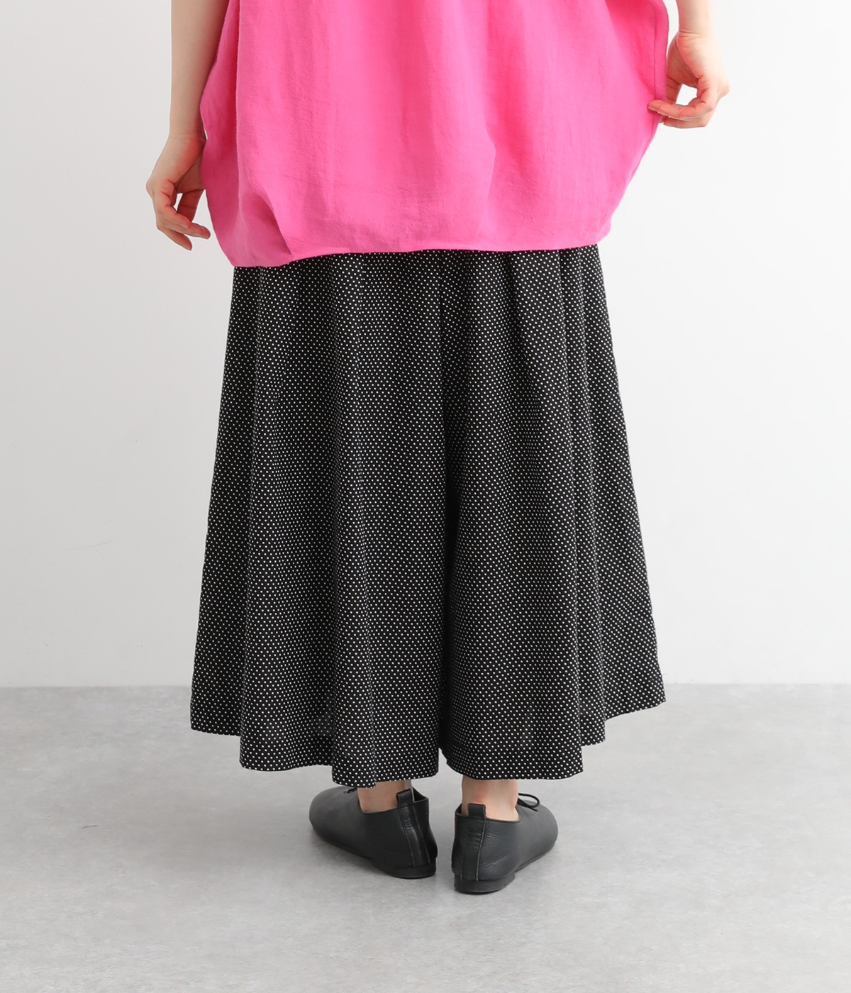 スカート見えするボリューム感のあるフレアシルエットが目を惹きます。タックで腰まわりは広がりをおさえているのですっきりとはきやすいのもグッドポイント。ウエストは総ゴム&内紐でリラックス仕様にしました。