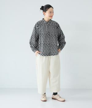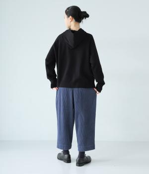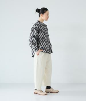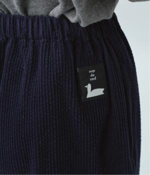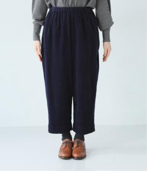 Pomme(リンゴ)のような丸みのあるシルエットのワイドパンツ。股上が深くリラックスしたゆるさがありながらも、高い位置にボリュームを持たせているのでバランス良く着こなせます。ショートブーツにも相性のいいやや短めの丈感です。右後ろにはブランドのアイコンであるスワンモチーフのネーム入り。ウエストは総ゴム&内ヒモ仕様ではき心地も抜群です。