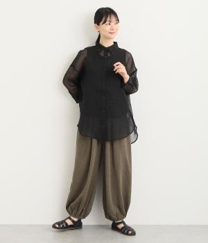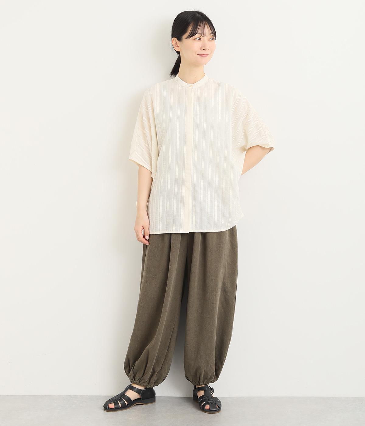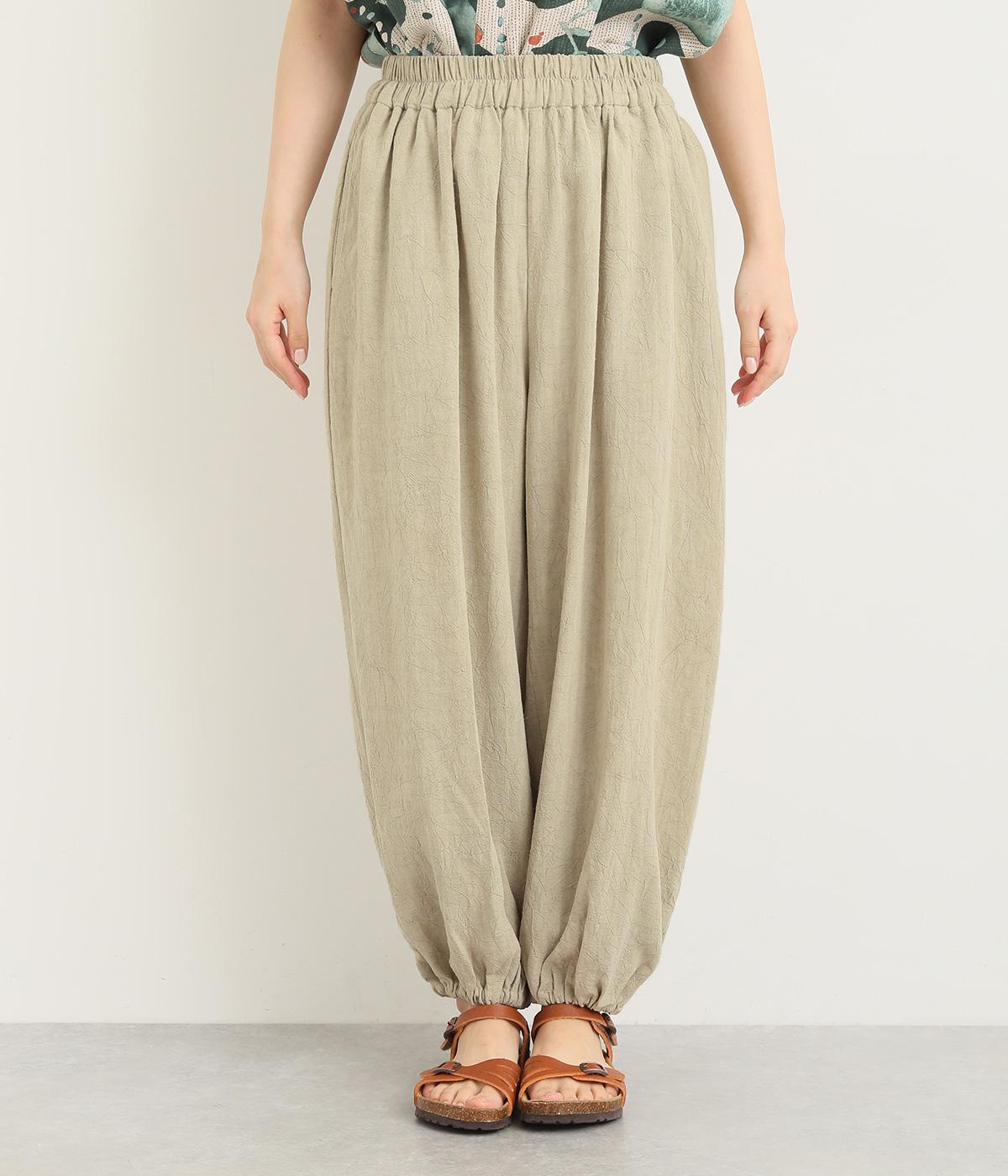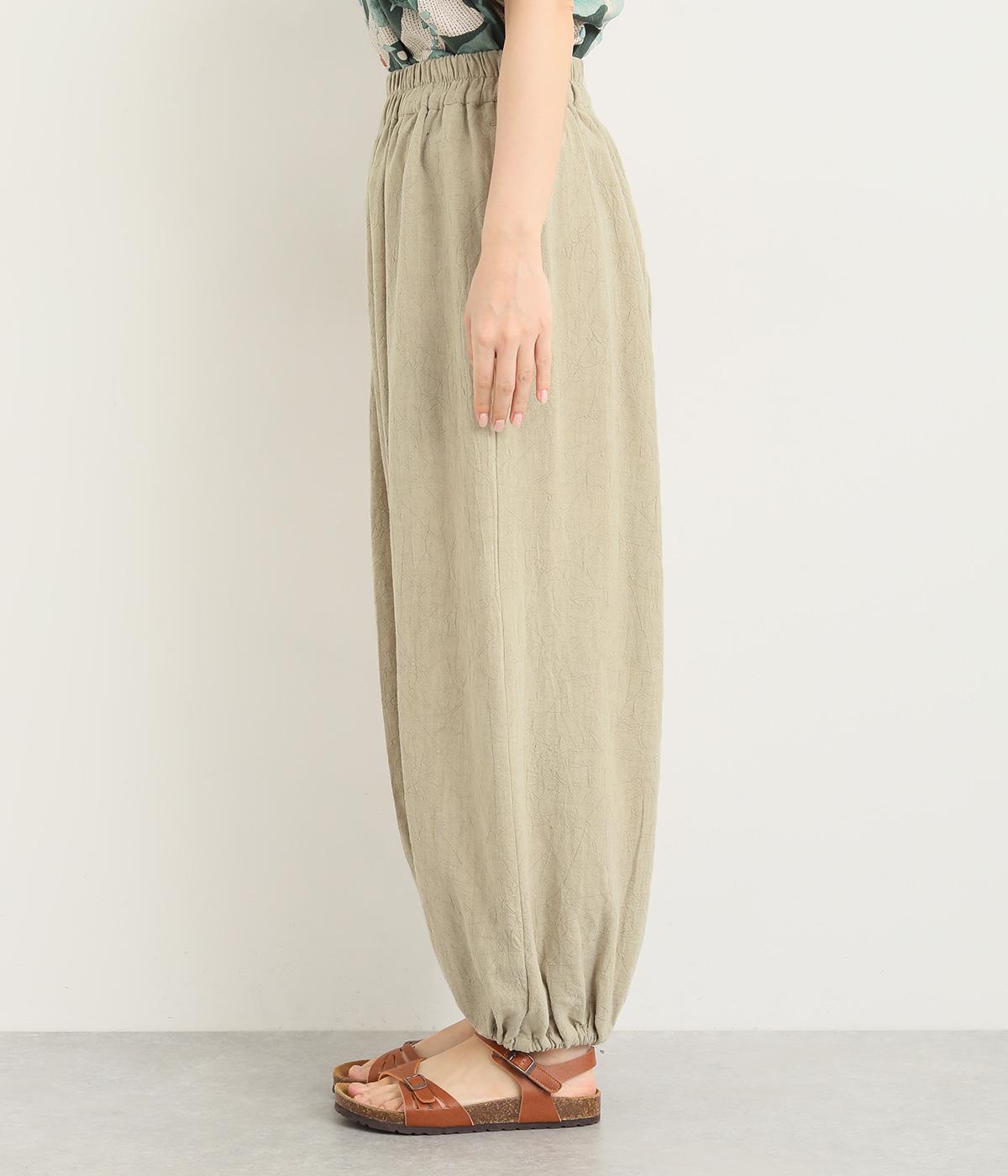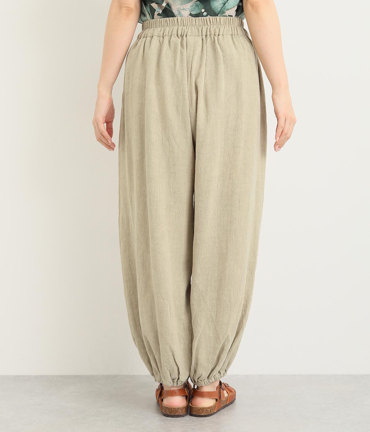 裾のゴムギャザーでゆったりとしたバルーンシルエットを描いています。シンプルな仕立てにすることで、生地の持つ豊かな風合いを最大限に発揮。ウエストは安定感のある太平ゴムに内紐入りのリラックス仕様です。