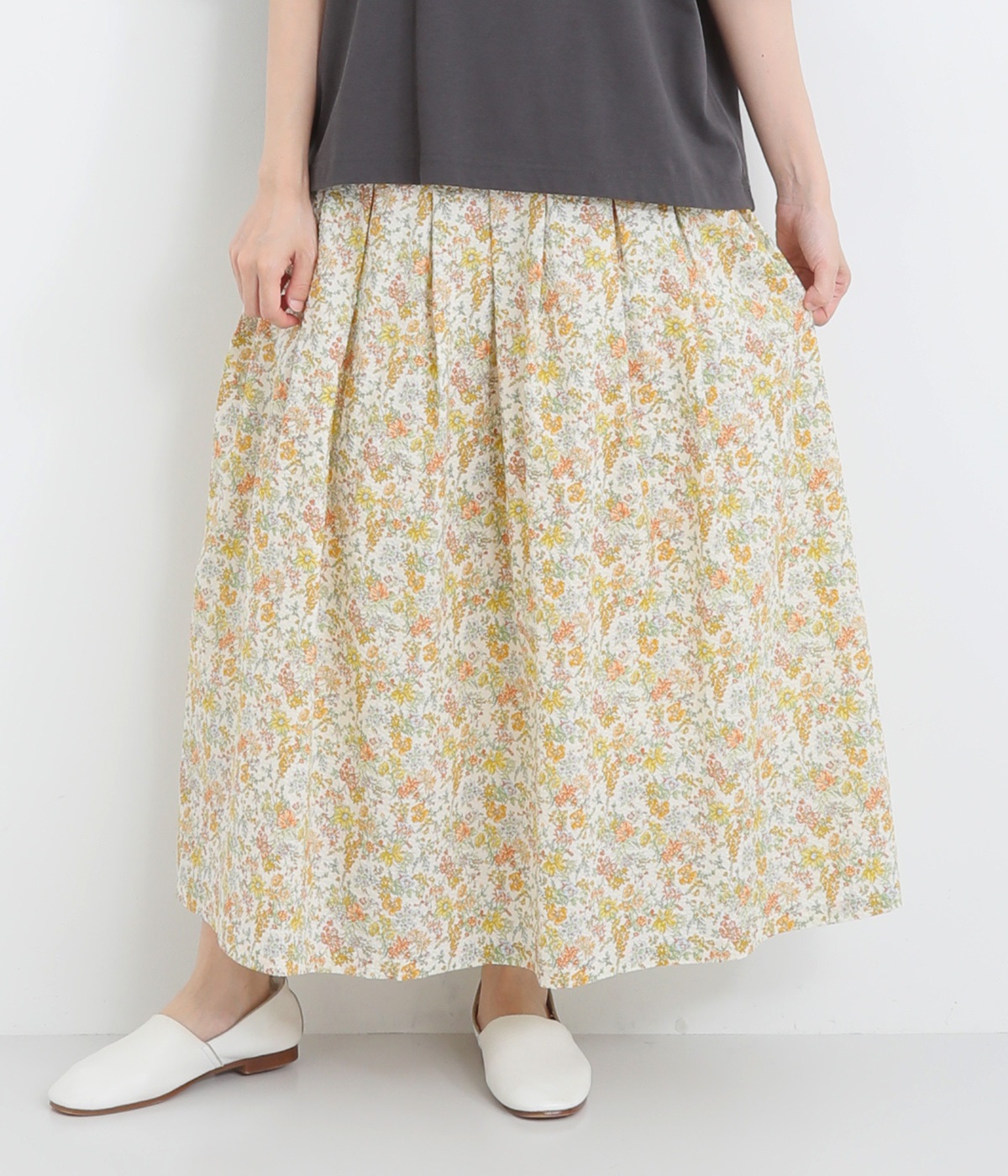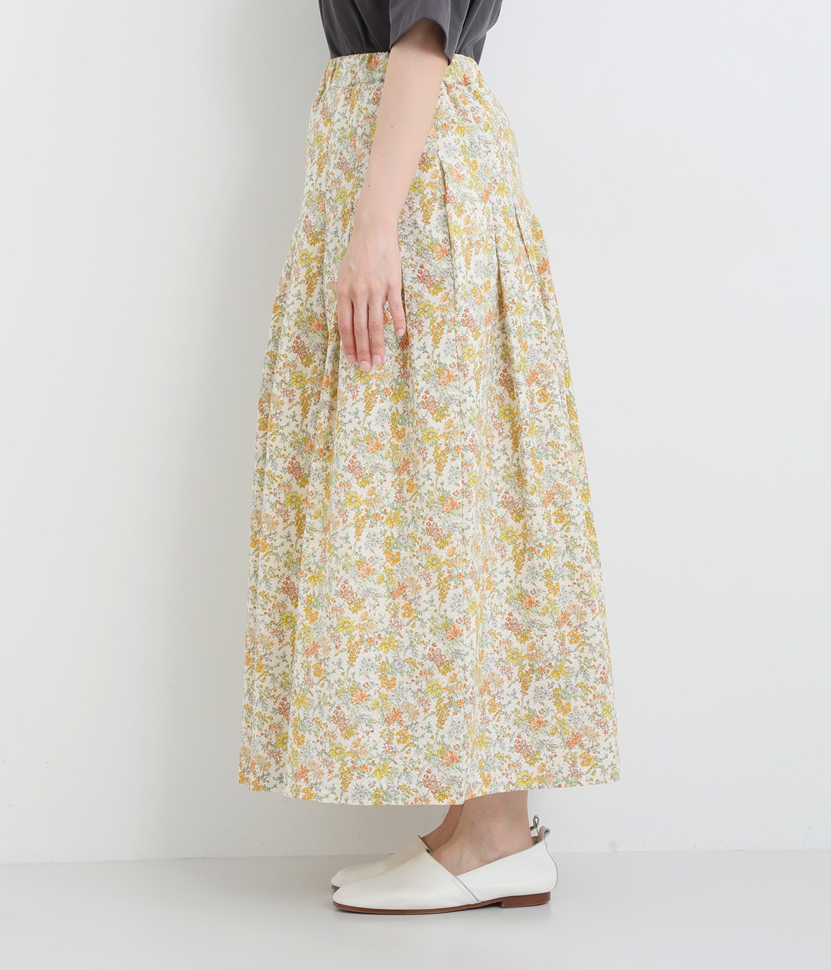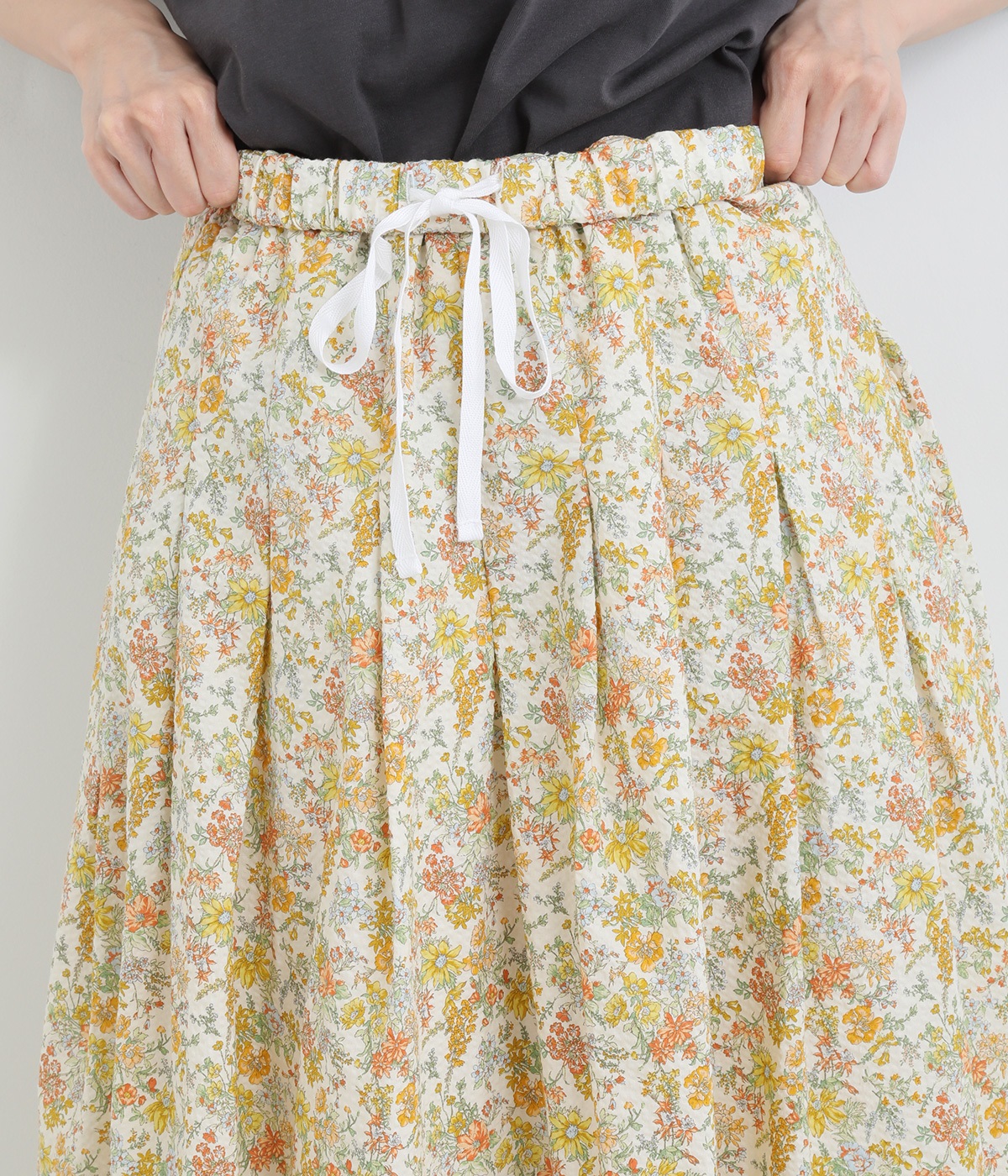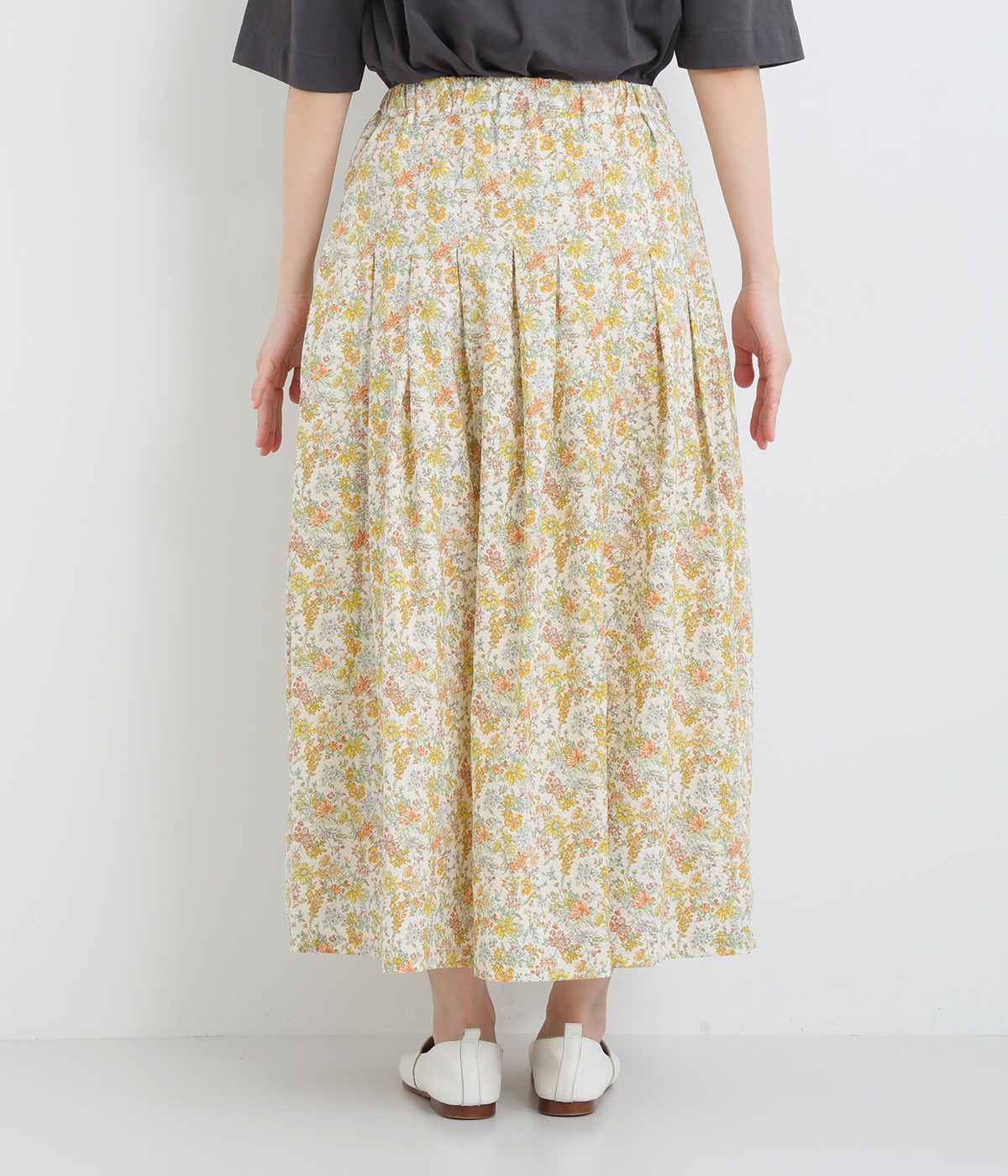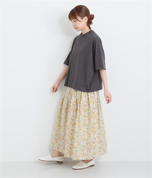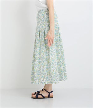 タックをほどこして腰まわりは広がりをおさえながらも、適度にボリュームのあるシルエットがやさしい雰囲気に。表面感のある素材で定番花柄も印象がちがって見えます。ウエスト総ゴム&内紐つきで調節可能です。