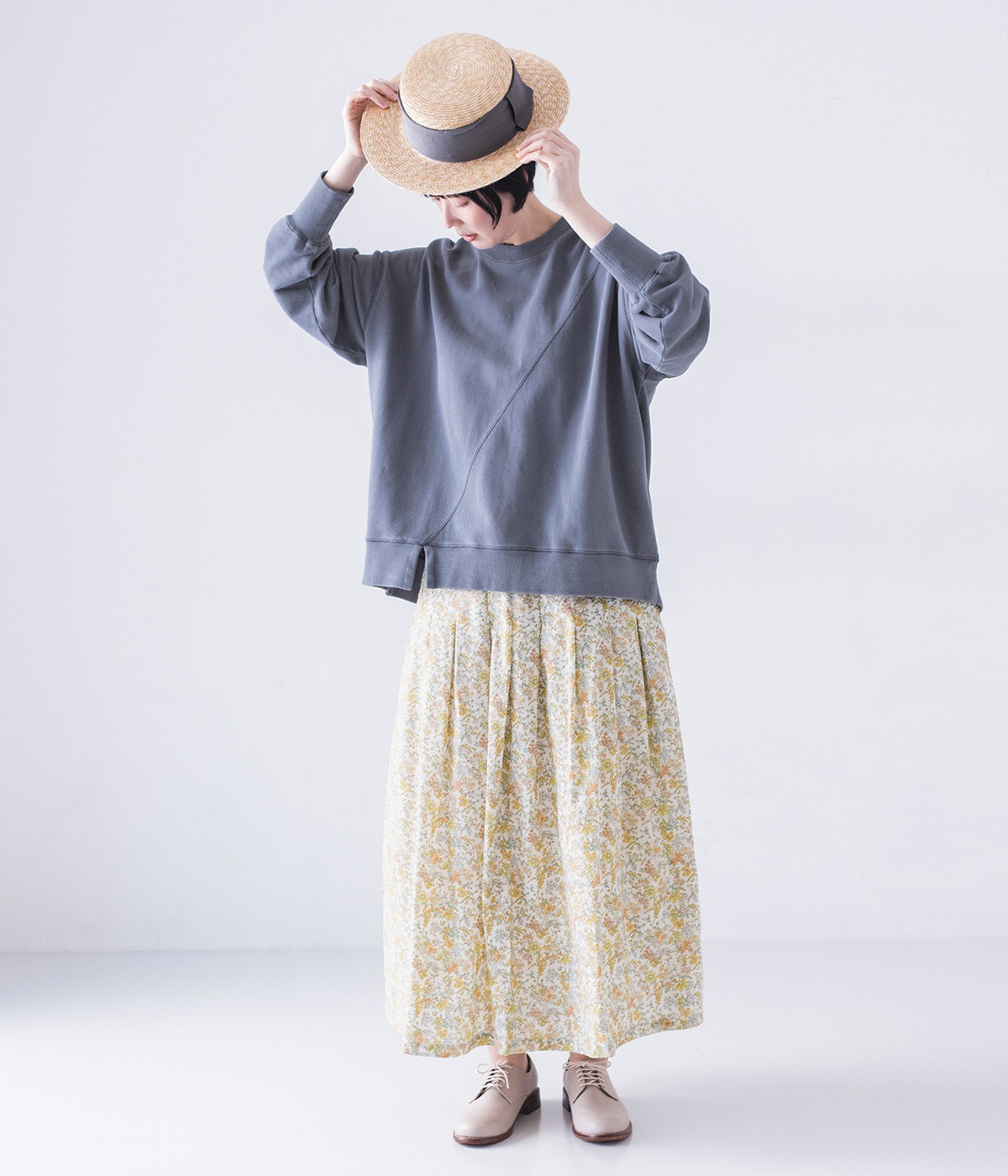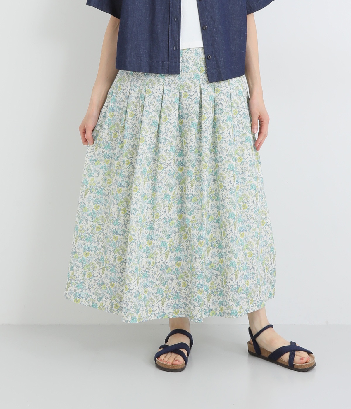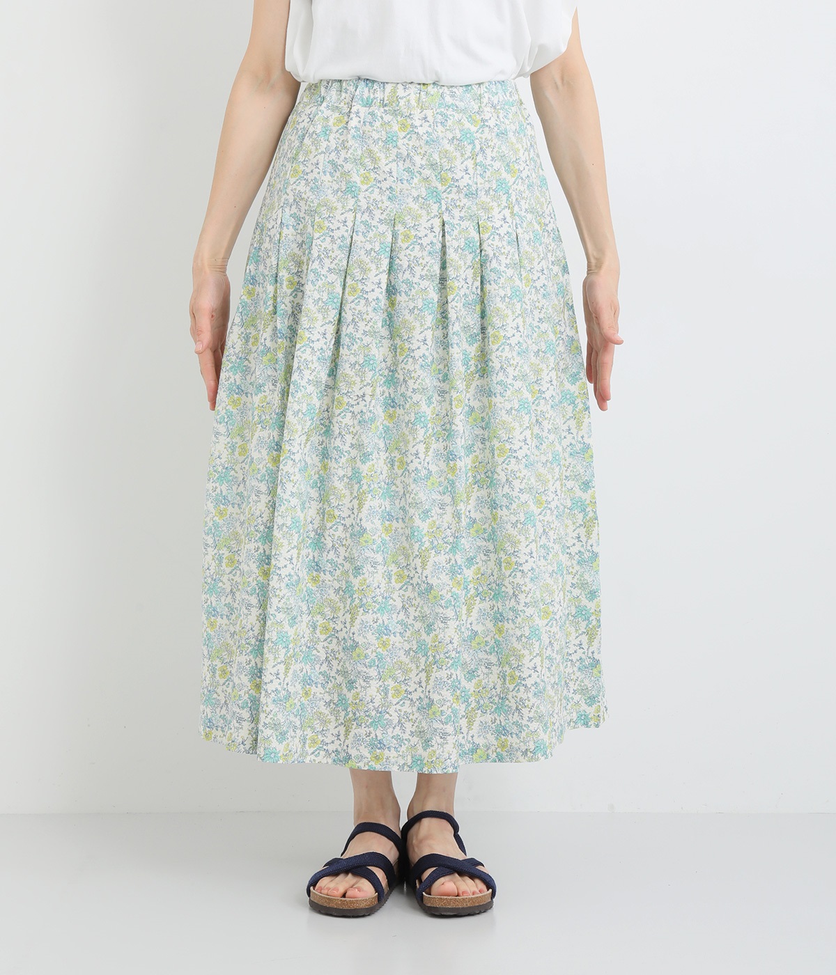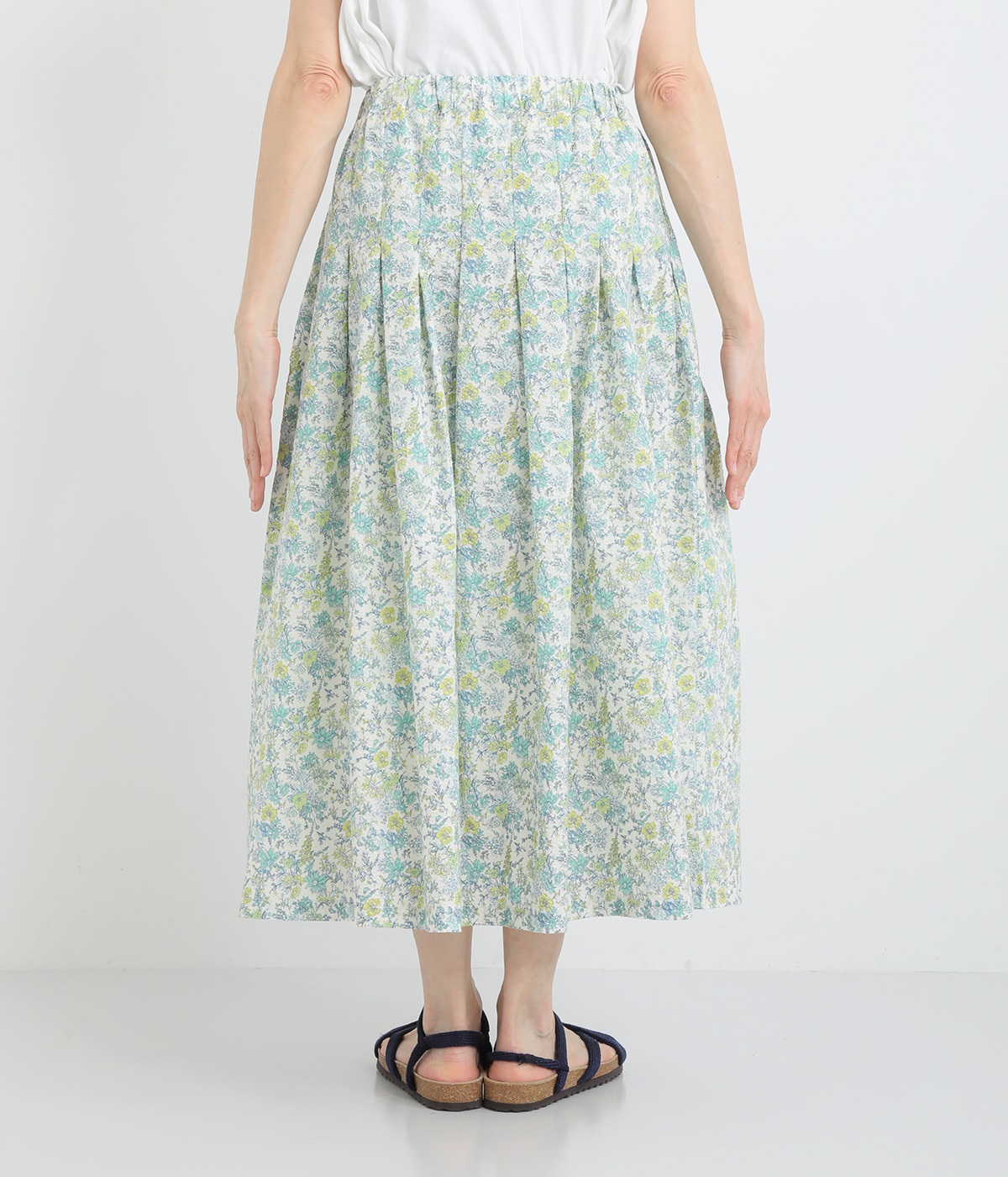 タックをほどこして腰まわりは広がりをおさえながらも、適度にボリュームのあるシルエットがやさしい雰囲気に。表面感のある素材で定番花柄も印象がちがって見えます。ウエスト総ゴム&内紐つきで調節可能です。