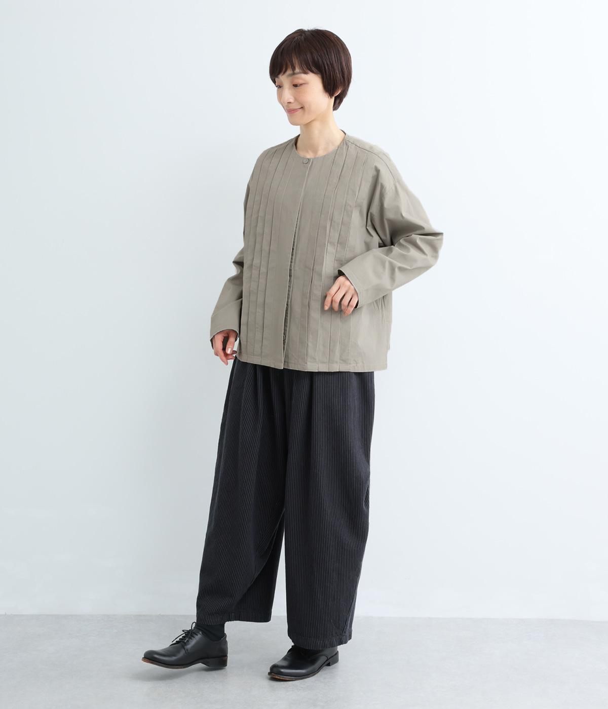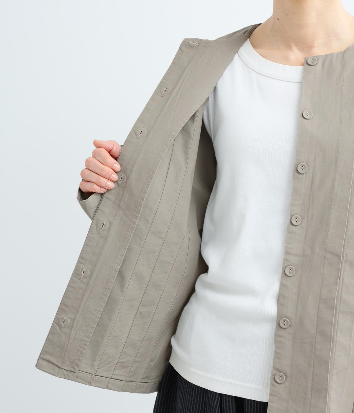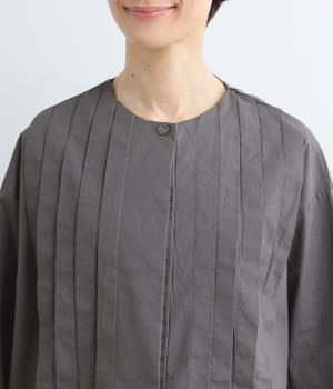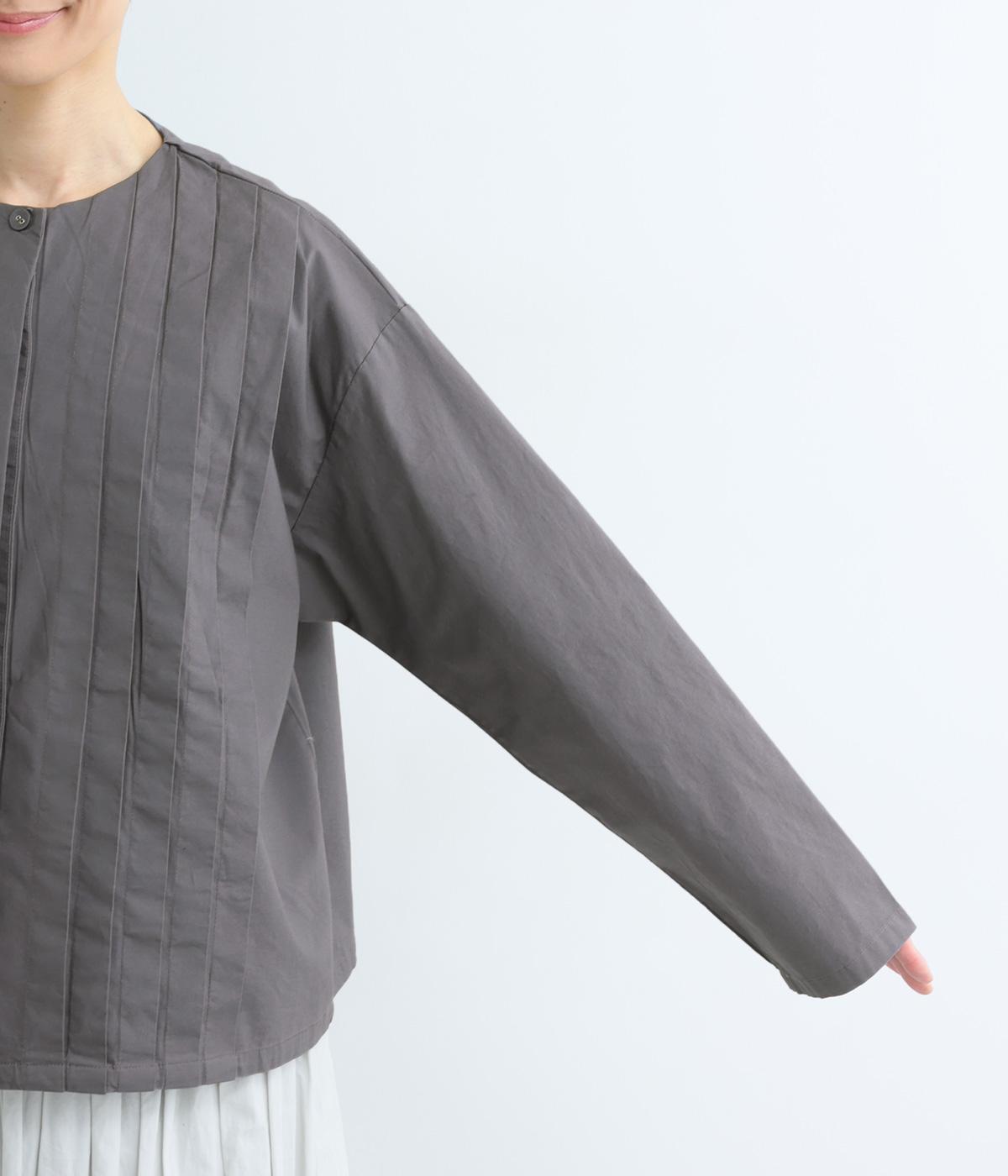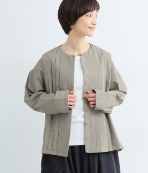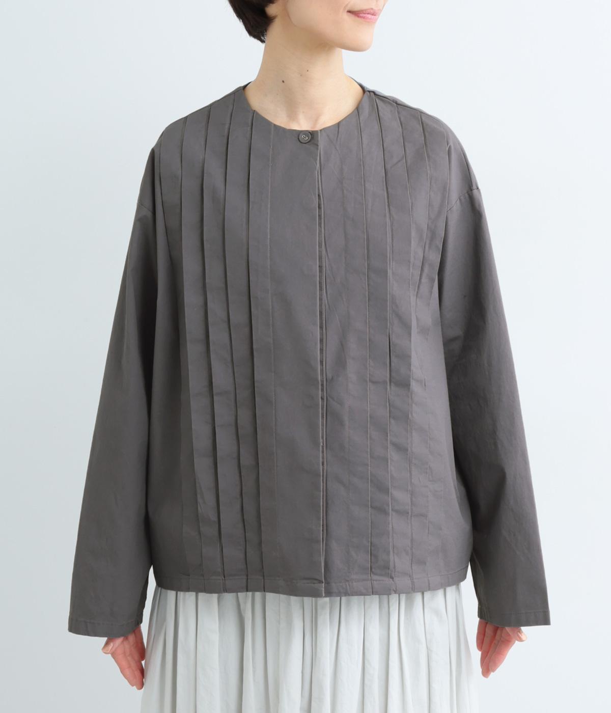 前身頃に入れたやや太めのタックが、装いに上品な立体感を添えるジャケットです。ほどよく詰まったクルーネックと比翼ボタン仕様で、すっきりとした印象に。少し長めの袖丈は、ロールアップすることで軽やかさが生まれ、コーディネートに抜け感を与えてくれます。