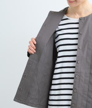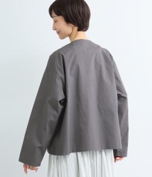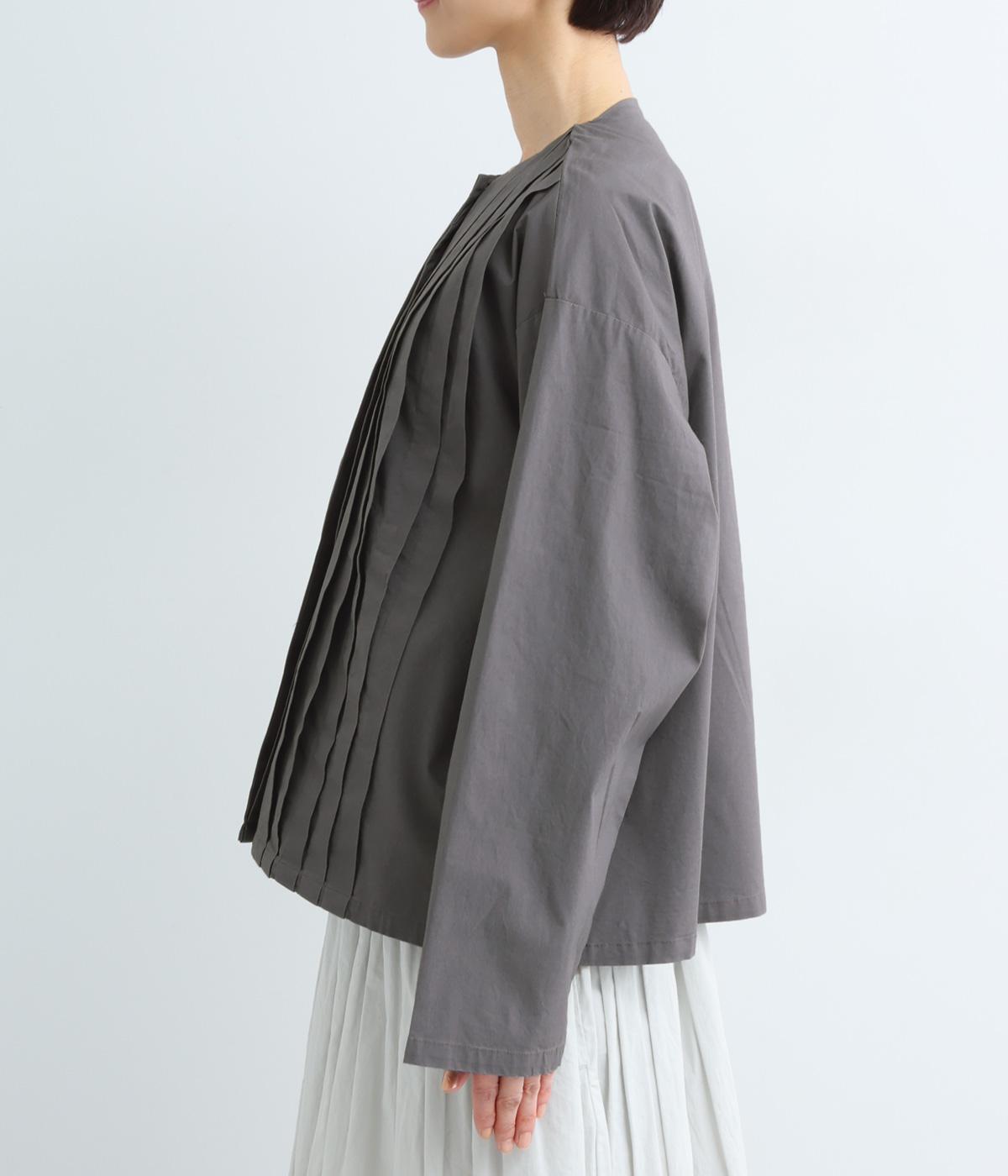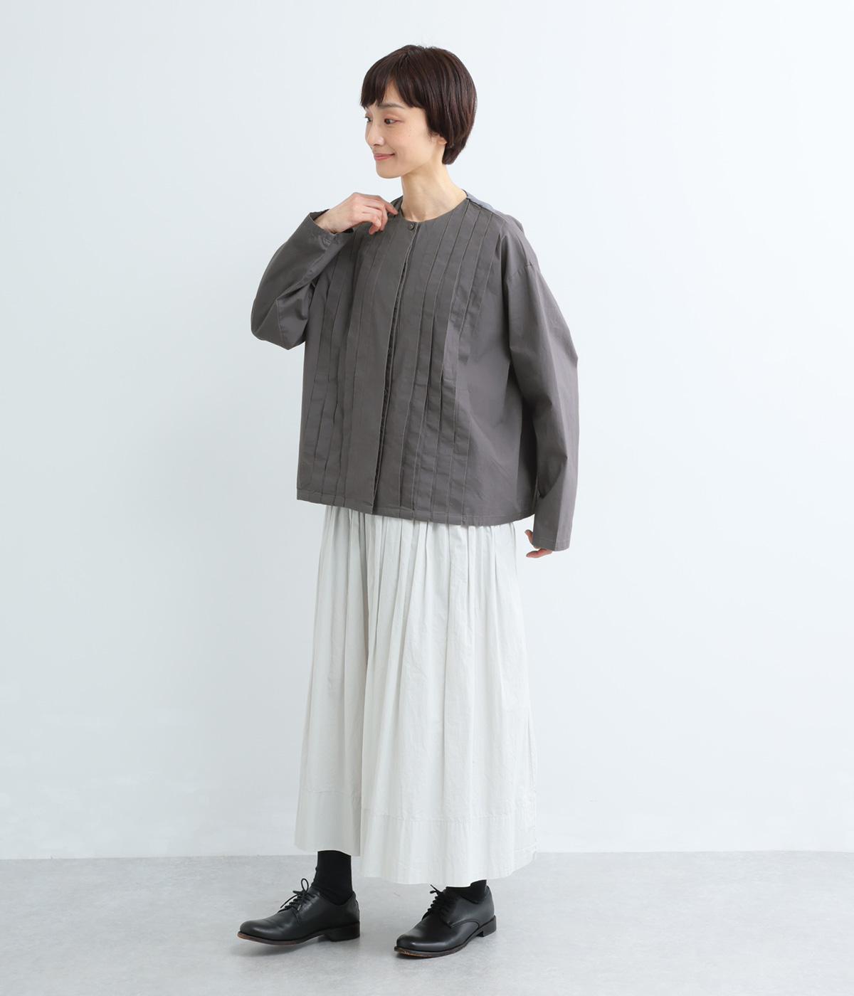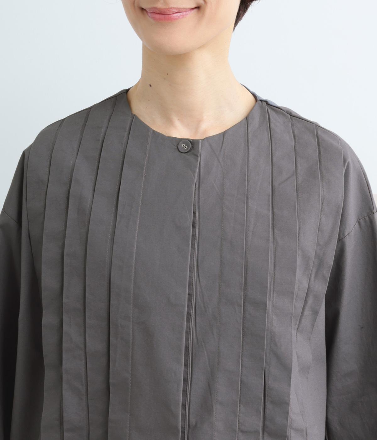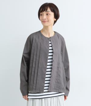 前身頃に入れたやや太めのタックが、装いに上品な立体感を添えるジャケットです。ほどよく詰まったクルーネックと比翼ボタン仕様で、すっきりとした印象に。少し長めの袖丈は、ロールアップすることで軽やかさが生まれ、コーディネートに抜け感を与えてくれます。