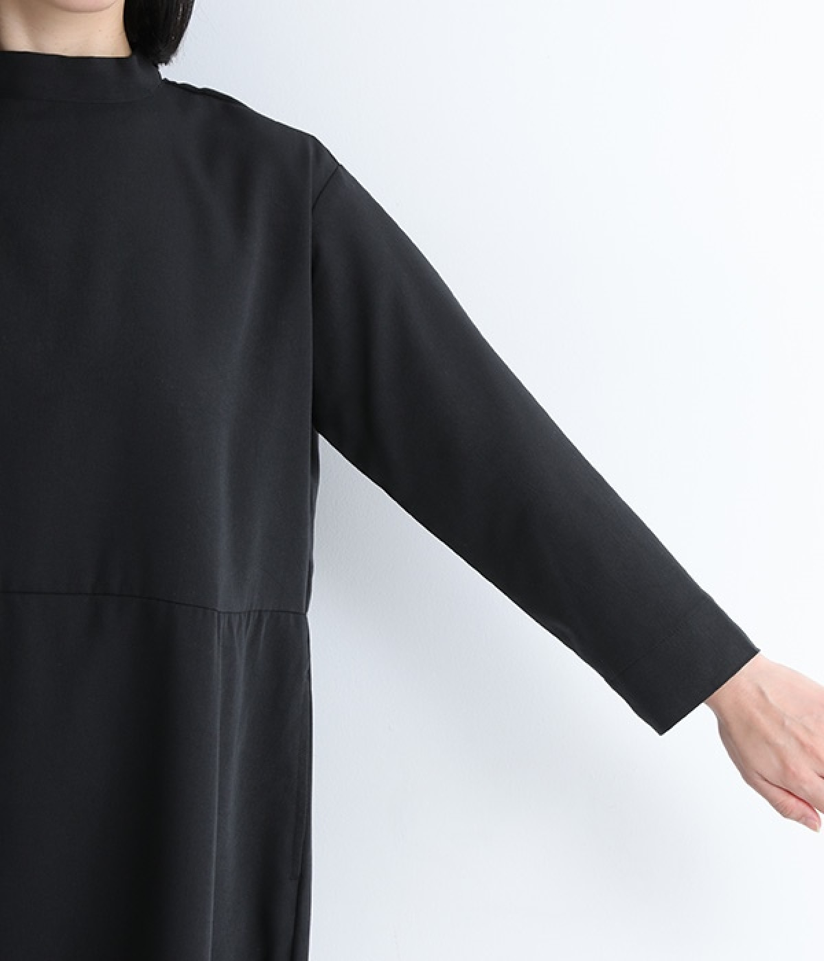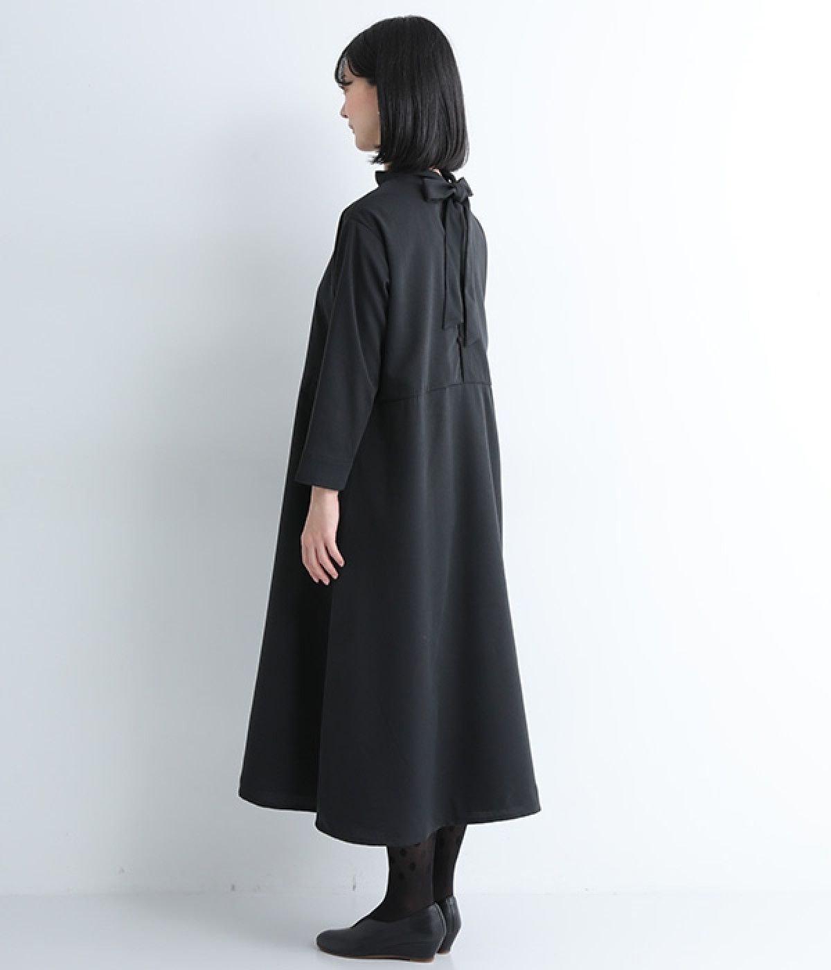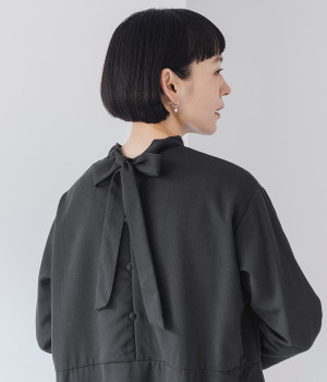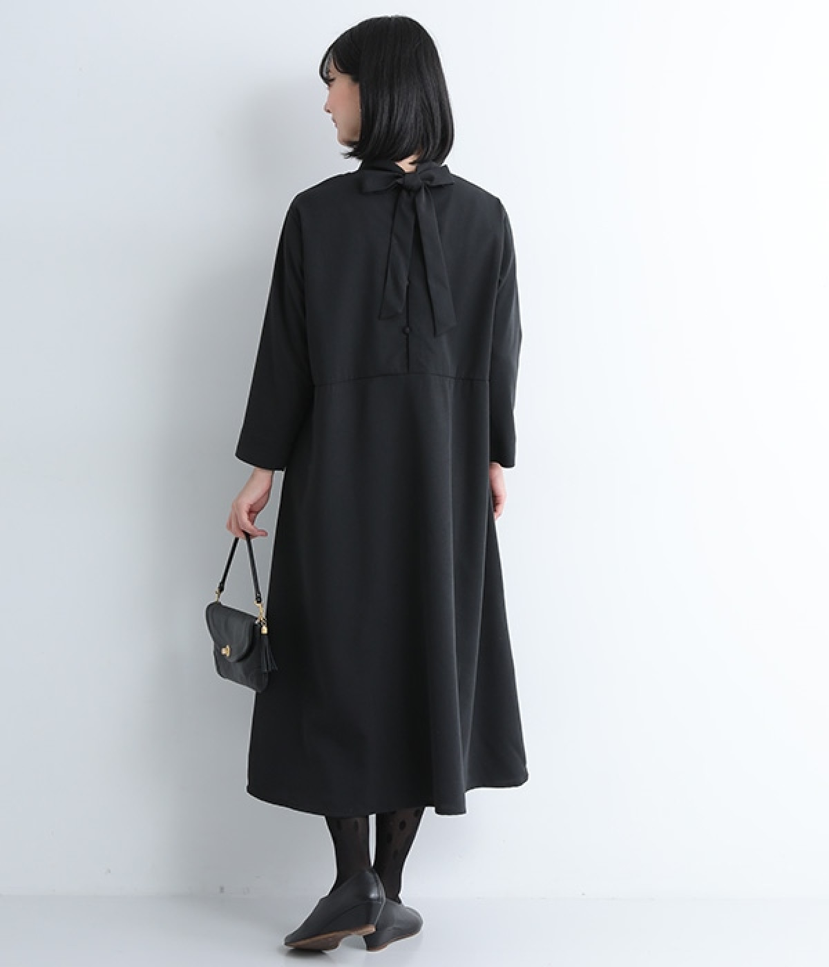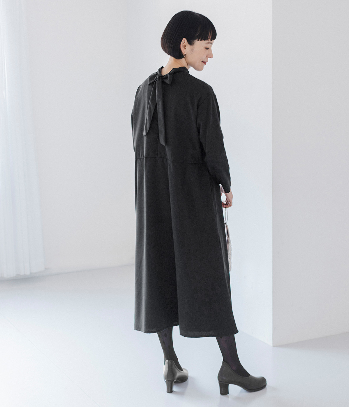 ハイネック&バックリボンの首もとで装いをクラシカルに飾るワンピース。するりとした落ち感と光沢、しなやかさを持つ上品なサージ生地を使用しました。ウエスト切り替えを高めにすることで自然にゆったりと広がりが生まれ、きれいめな印象の中に女性らしさをプラス。後ろのボタンは同生地を使用したくるみボタンで統一感を出しています。身頃から袖までの総裏付きです。