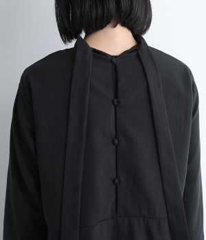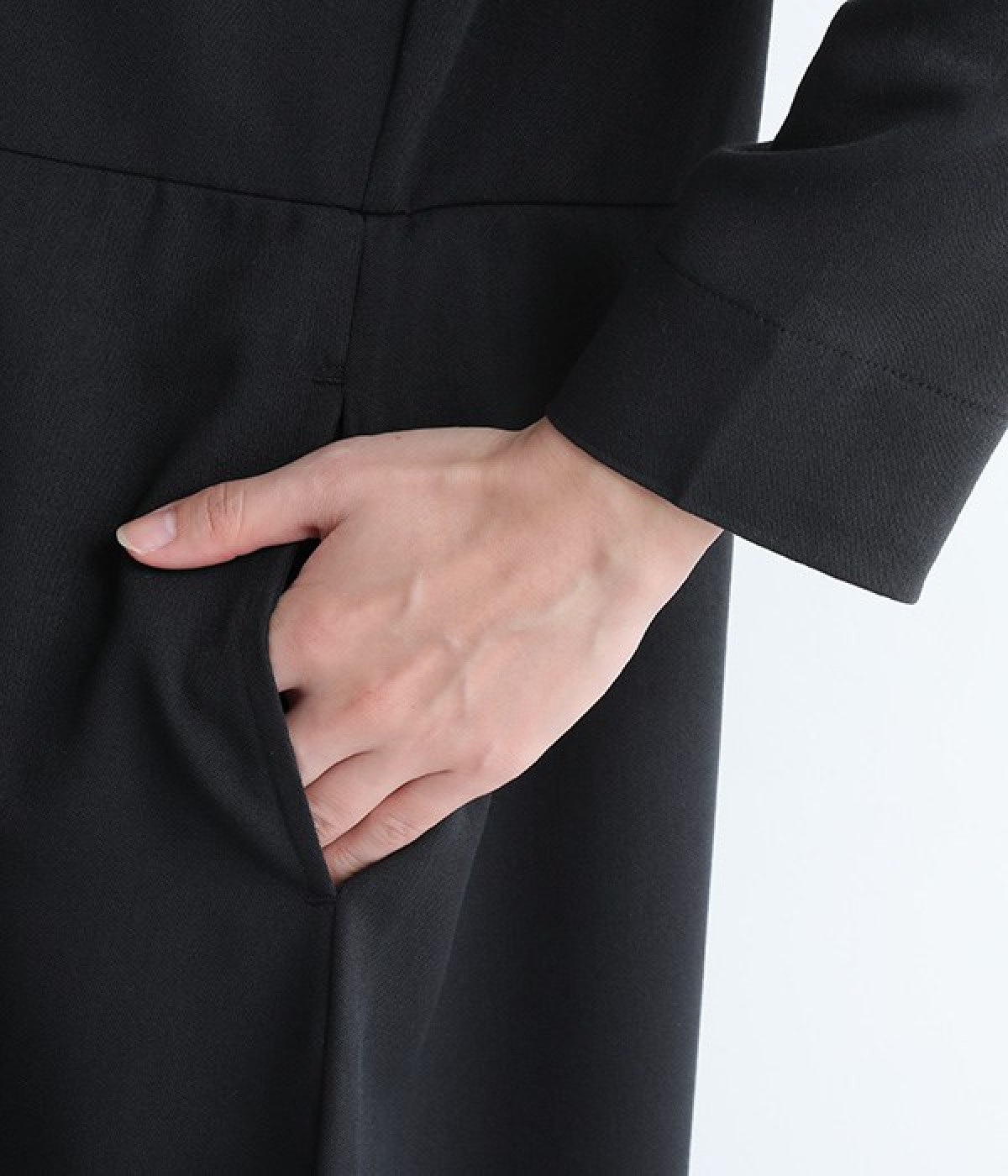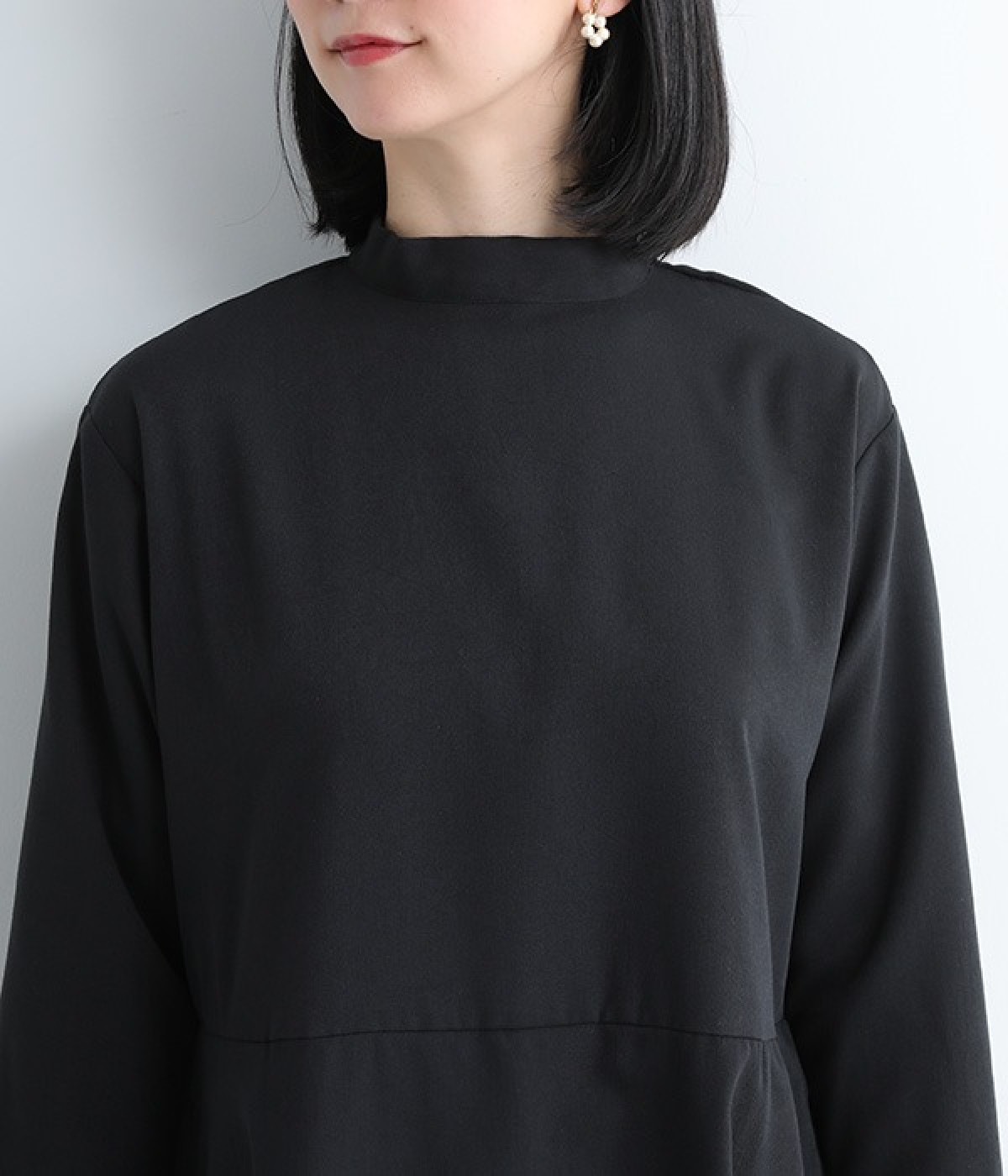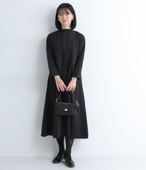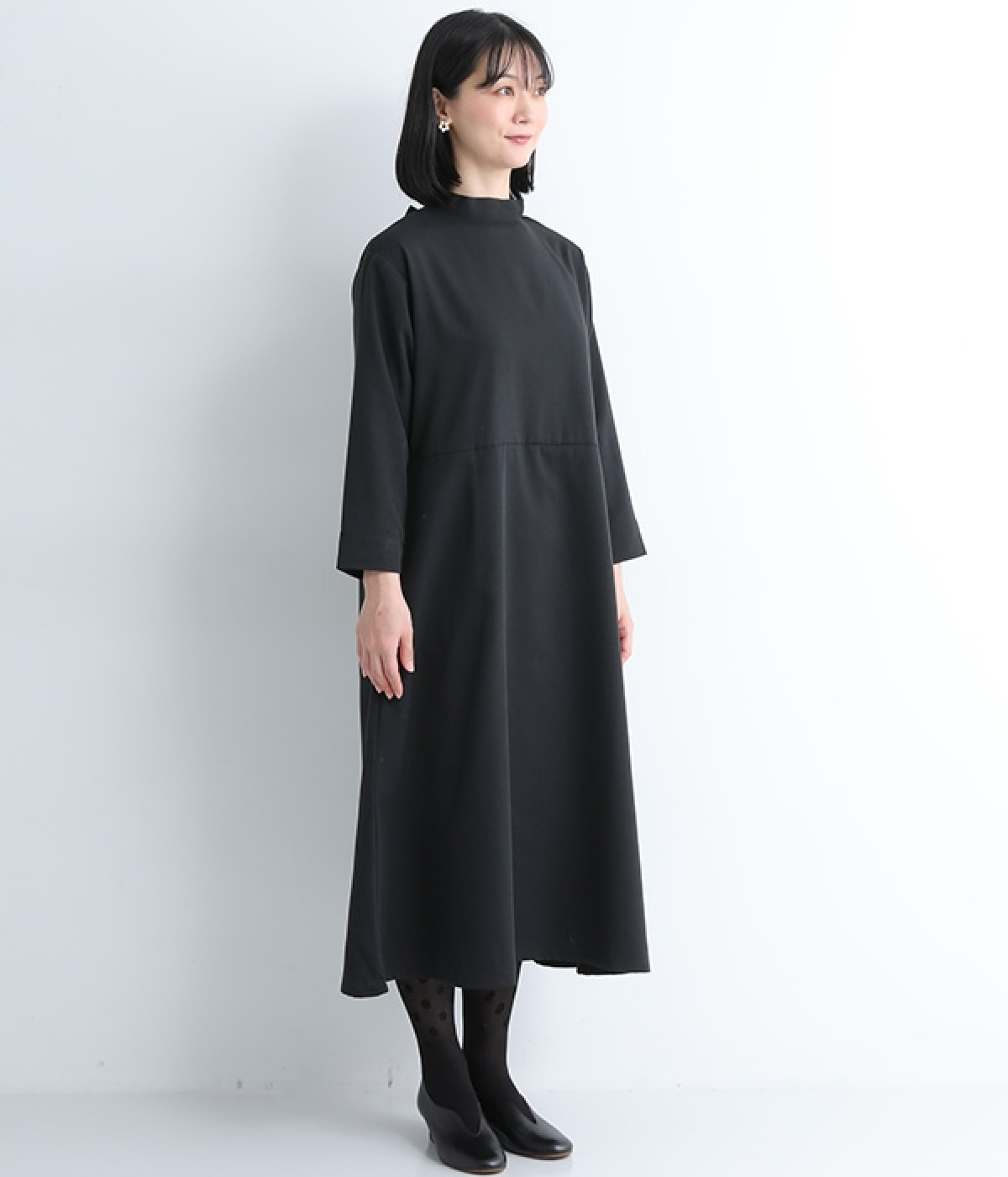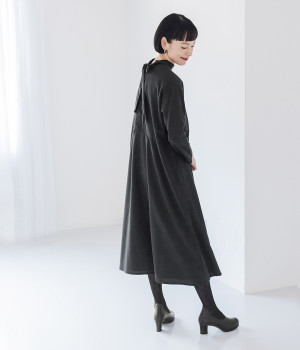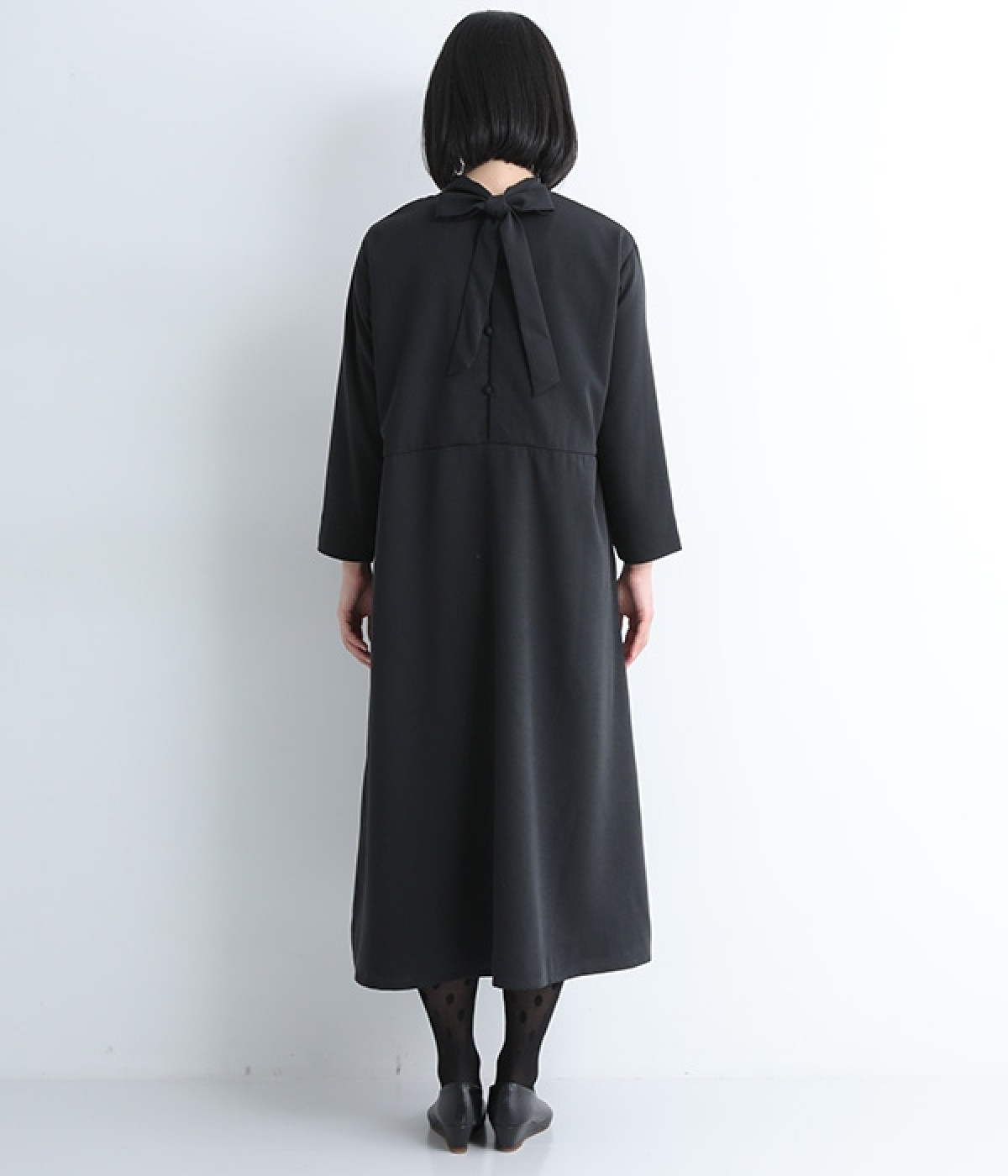 ハイネック&バックリボンの首もとで装いをクラシカルに飾るワンピース。するりとした落ち感と光沢、しなやかさを持つ上品なサージ生地を使用しました。ウエスト切り替えを高めにすることで自然にゆったりと広がりが生まれ、きれいめな印象の中に女性らしさをプラス。後ろのボタンは同生地を使用したくるみボタンで統一感を出しています。身頃から袖までの総裏付きです。