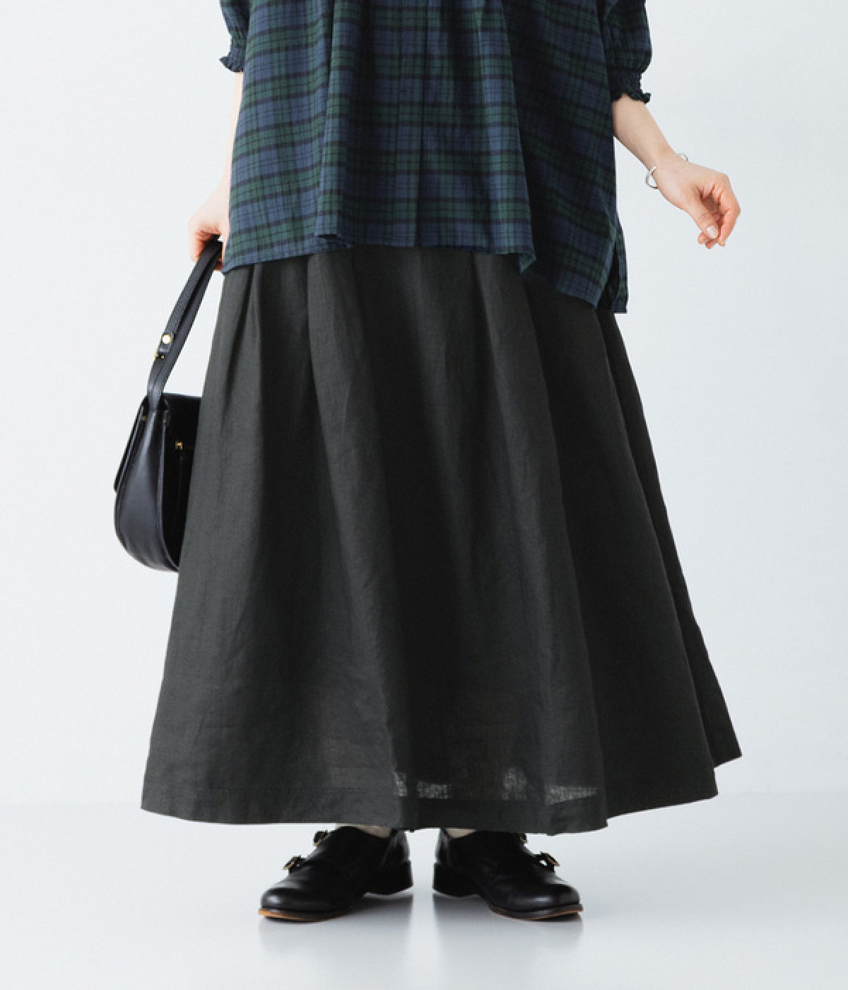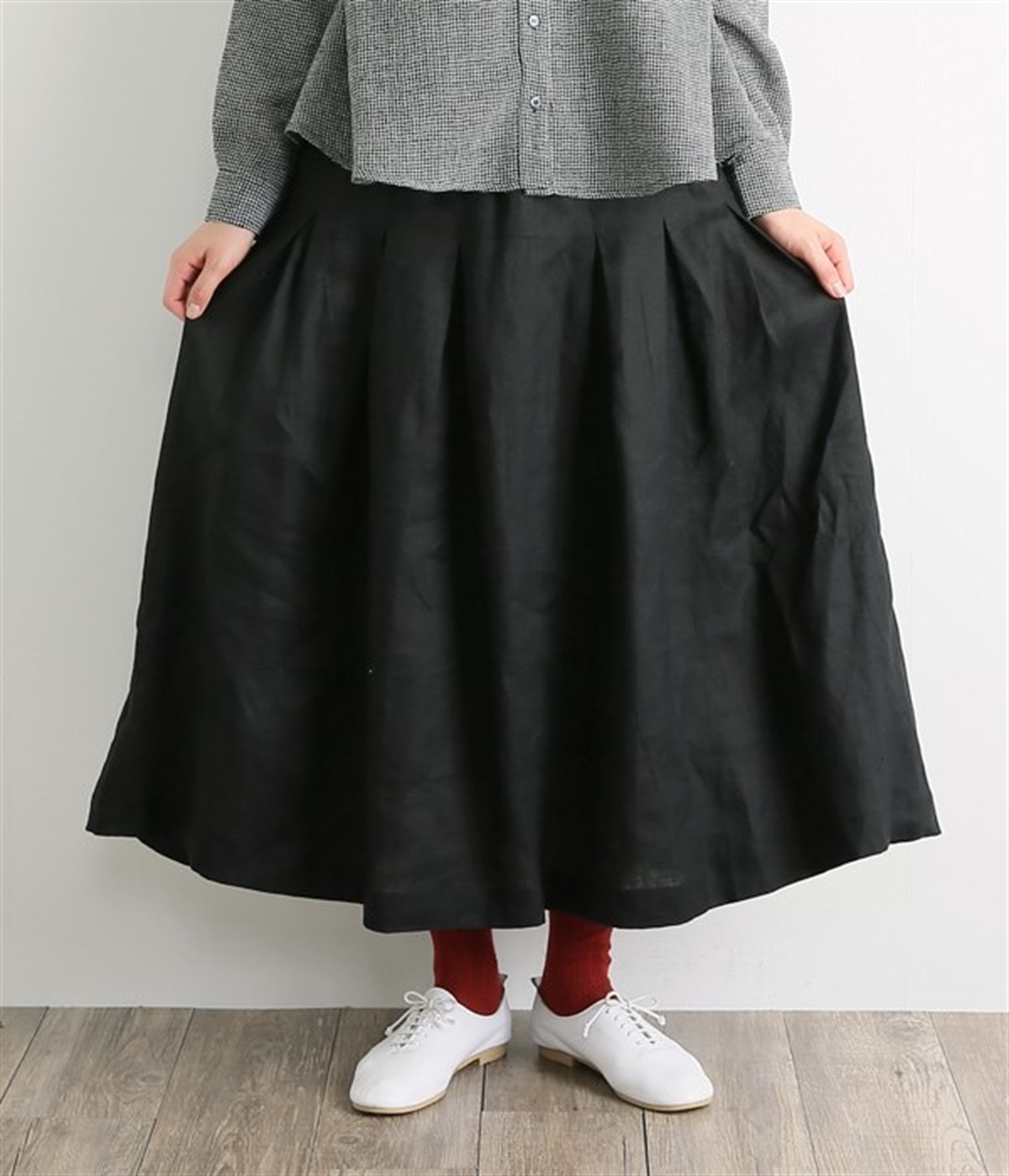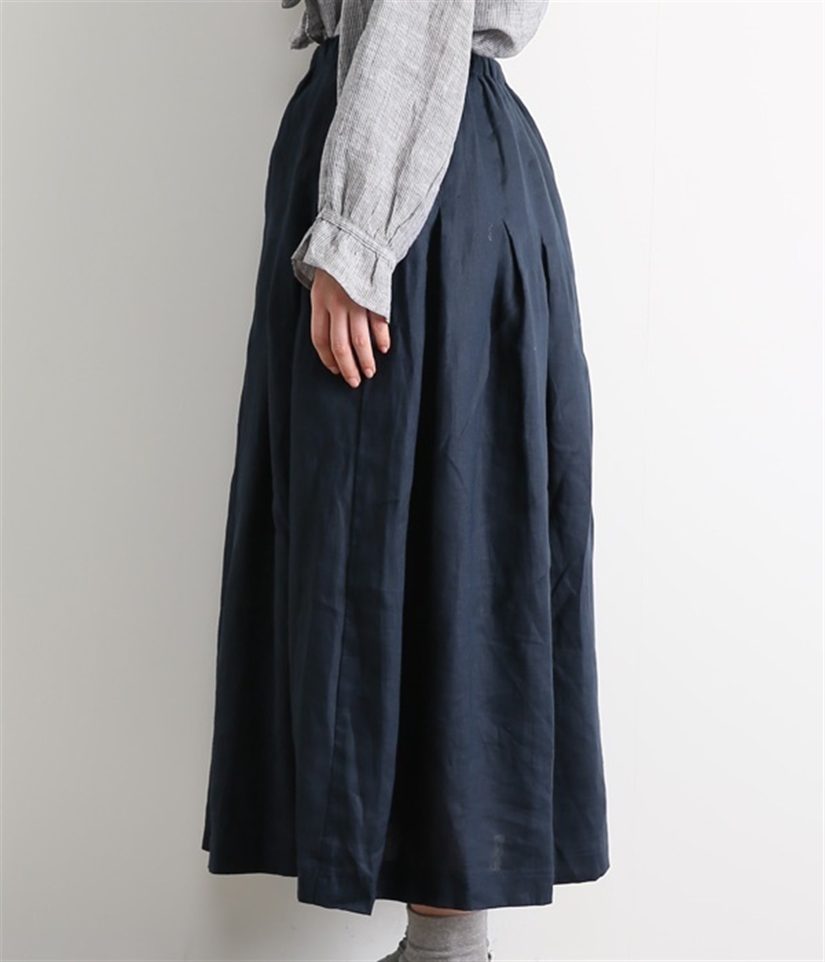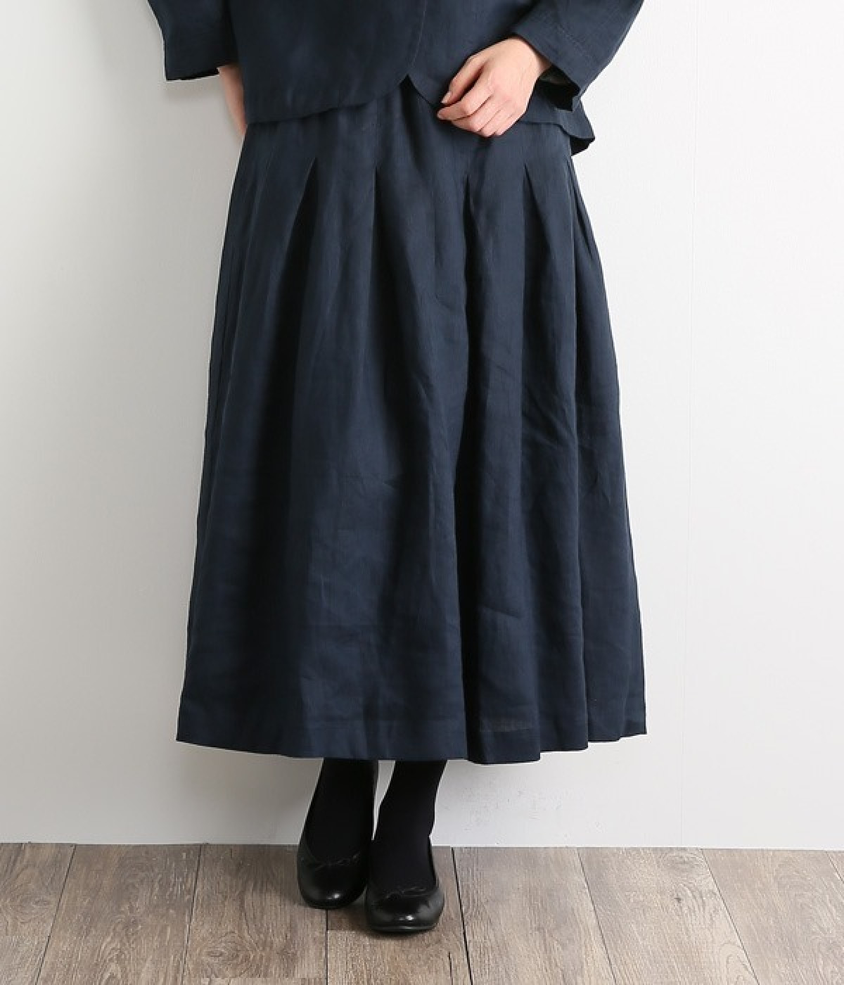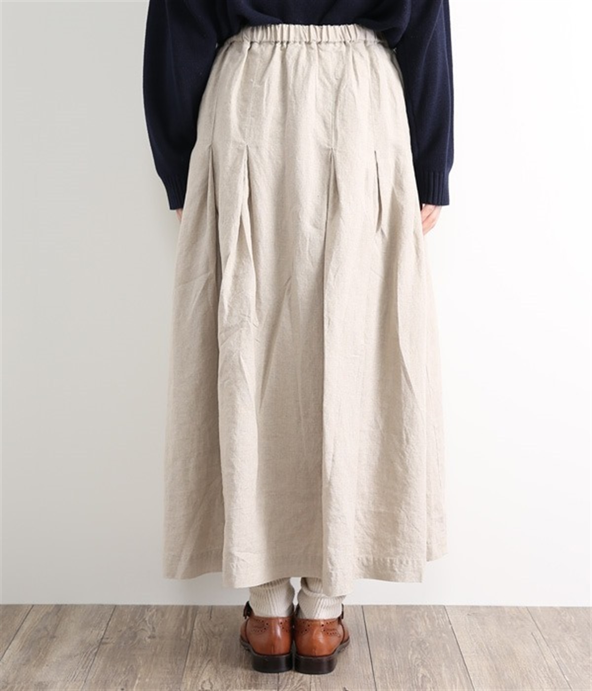 上品な光沢と、目の詰まったハリ感のあるリネンオックス生地で仕立てたミモレ丈スカートです。ウエスト下にタックを施したボリュームシルエットが魅力的。シンプルなのでトップスやシューズによって、カジュアルにもキレイめにも合わせられるシーズンレスな1枚です。ウエストは総ゴムで内側の紐によって調節も可能です。同素材のジャケットと合わせてセットアップで着用するのもおすすめです。両サイドにはポケット付きです。