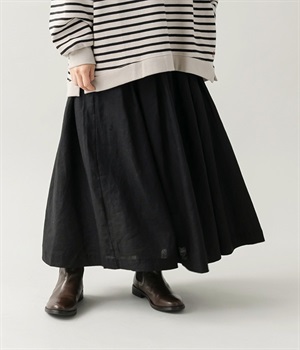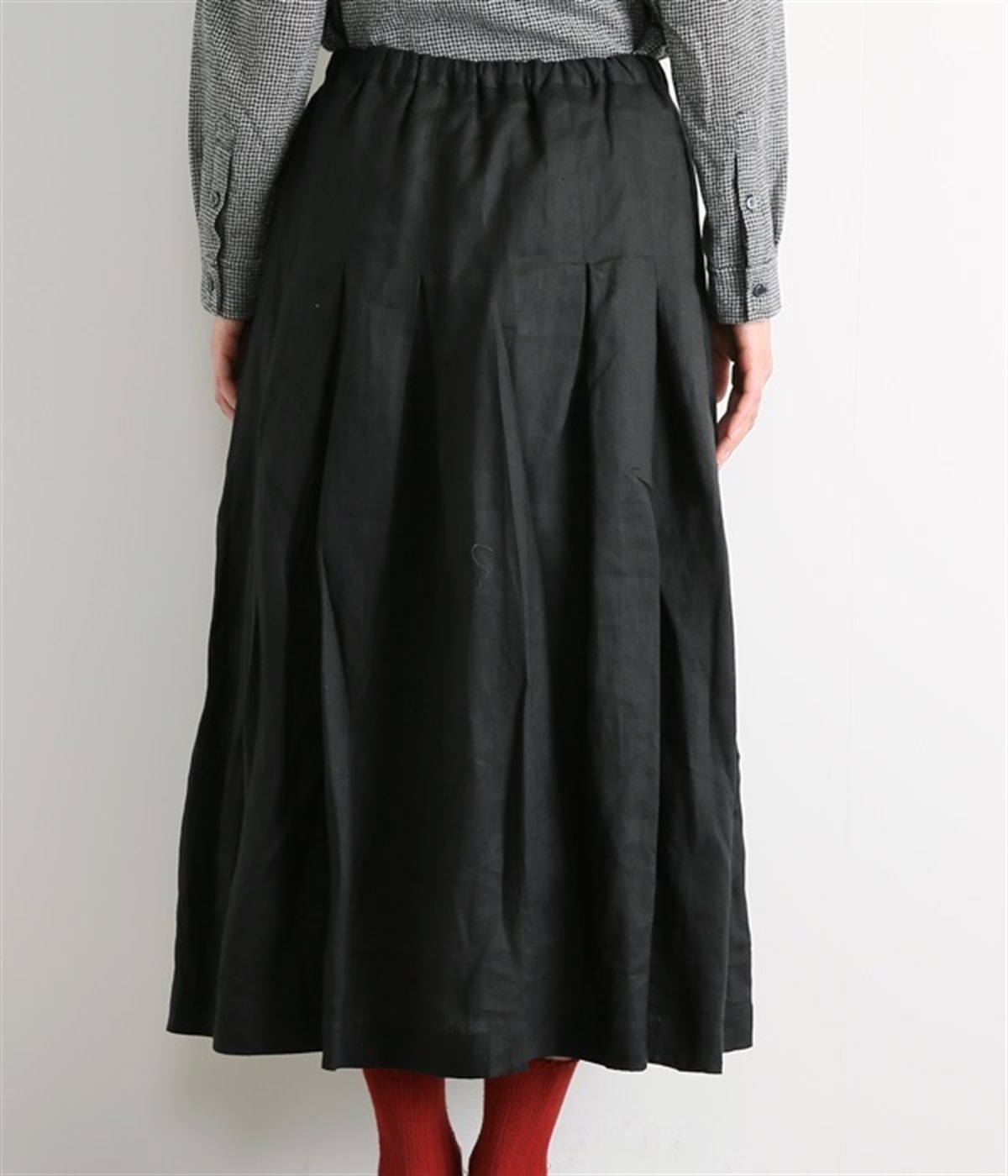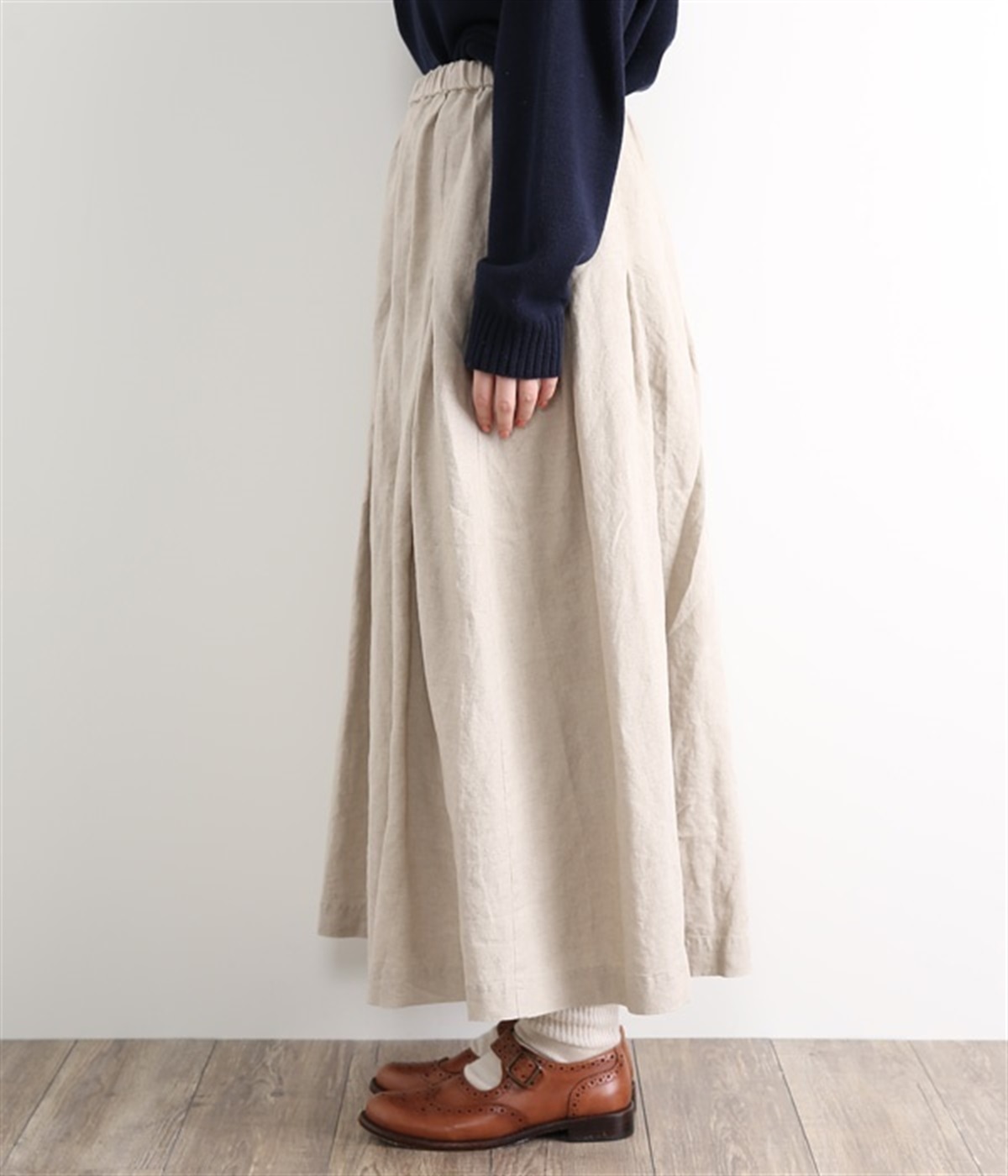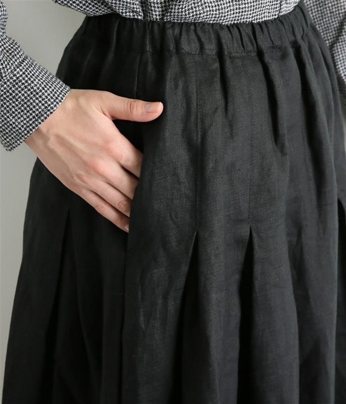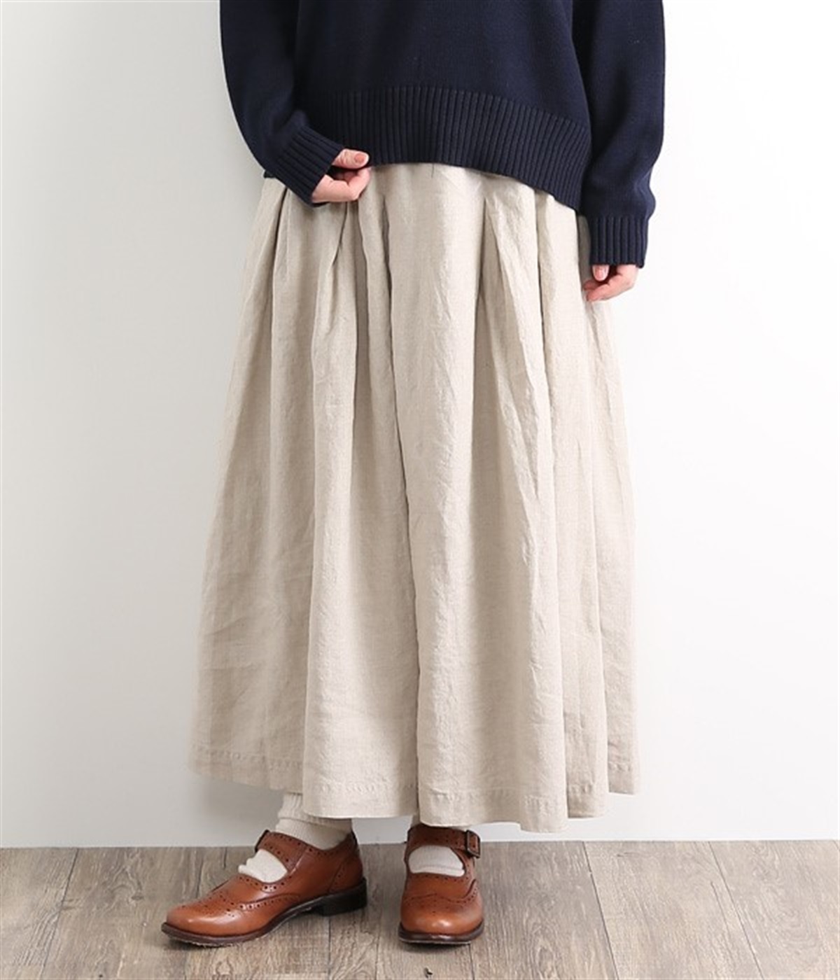 上品な光沢と、目の詰まったハリ感のあるリネンオックス生地で仕立てたミモレ丈スカートです。ウエスト下にタックを施したボリュームシルエットが魅力的。シンプルなのでトップスやシューズによって、カジュアルにもキレイめにも合わせられるシーズンレスな1枚です。ウエストは総ゴムで内側の紐によって調節も可能です。同素材のジャケットと合わせてセットアップで着用するのもおすすめです。両サイドにはポケット付きです。