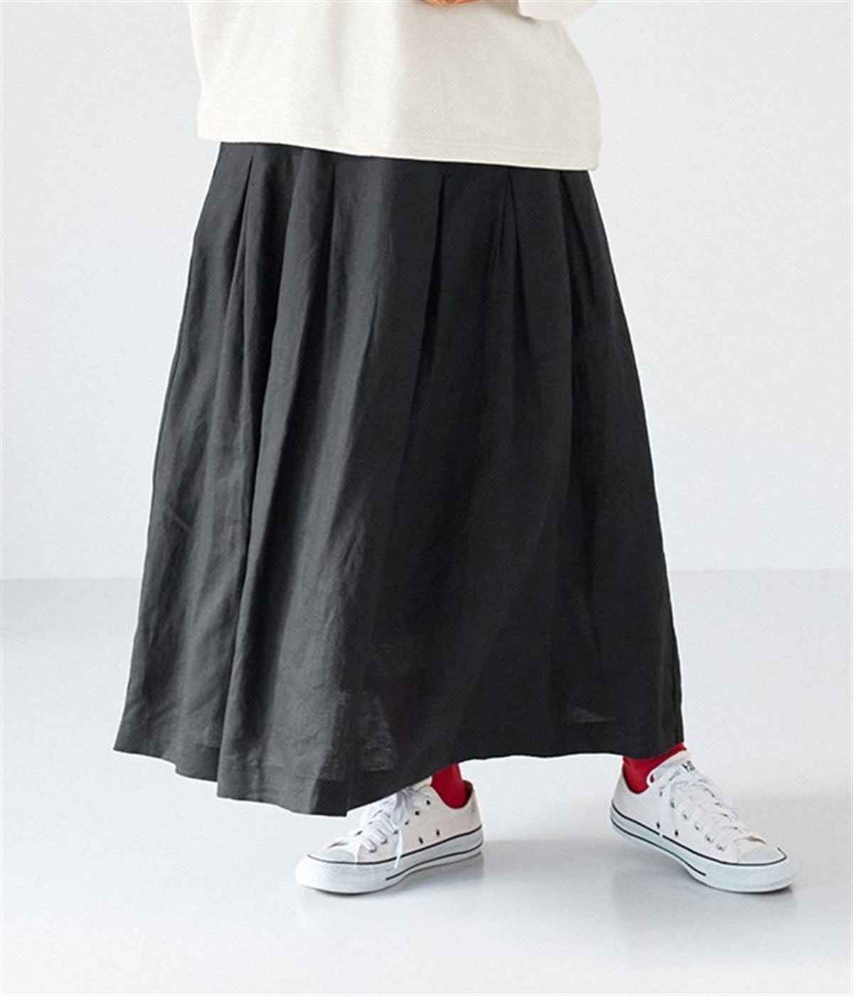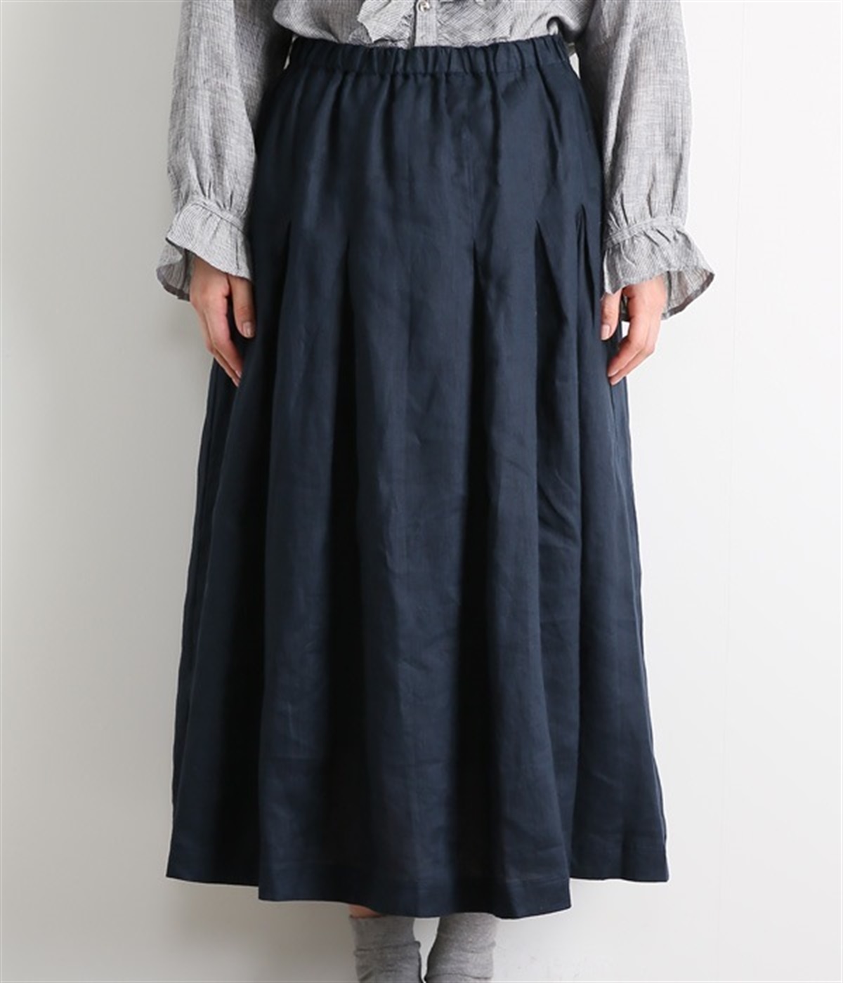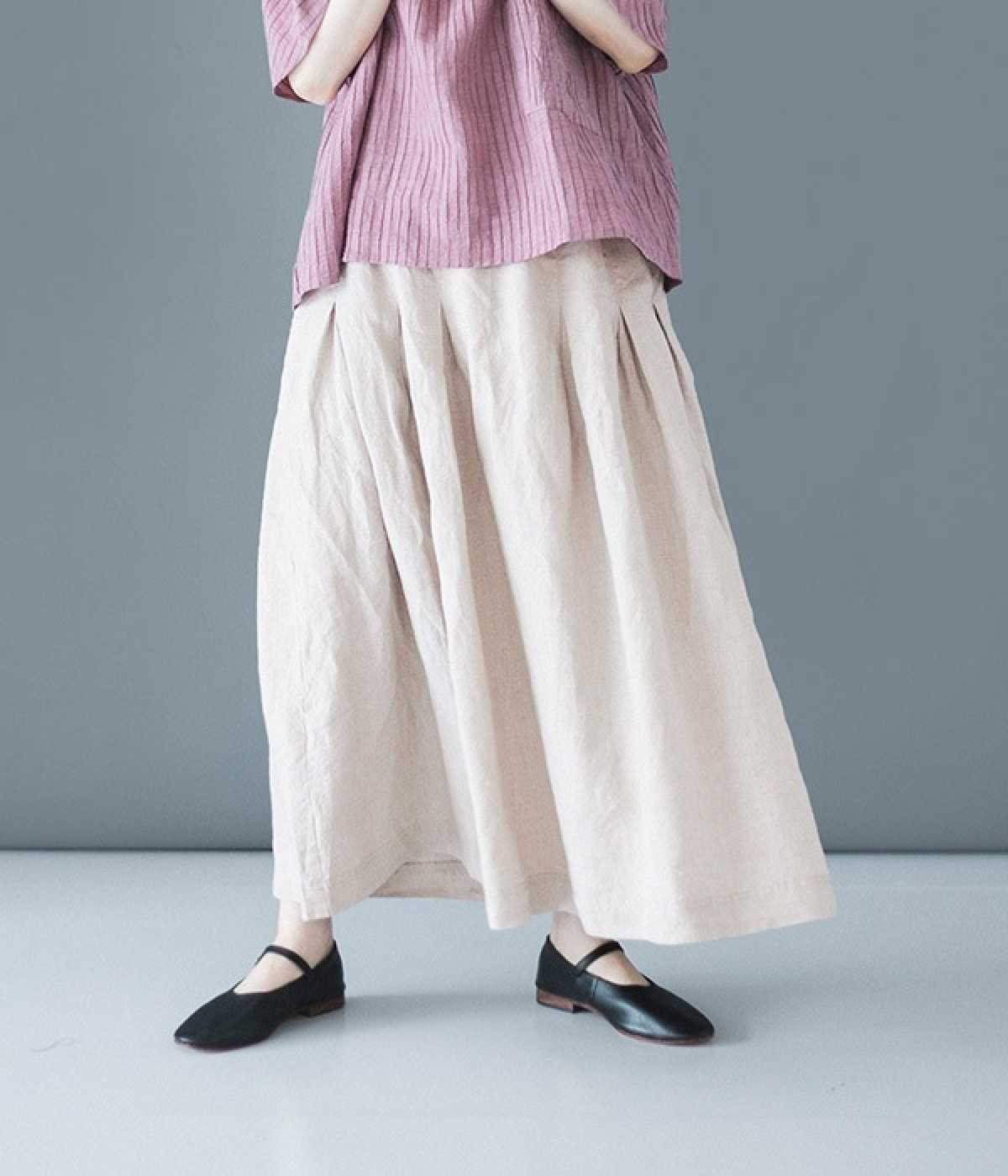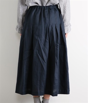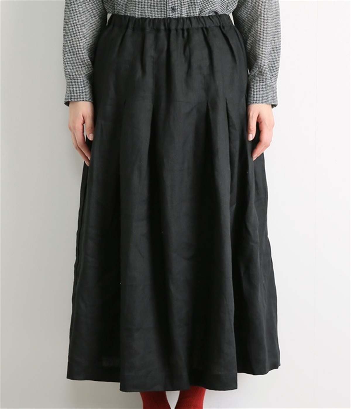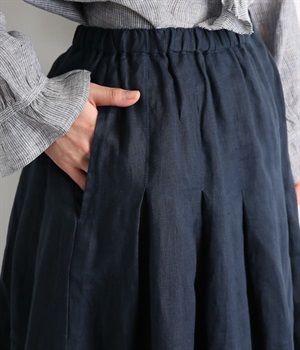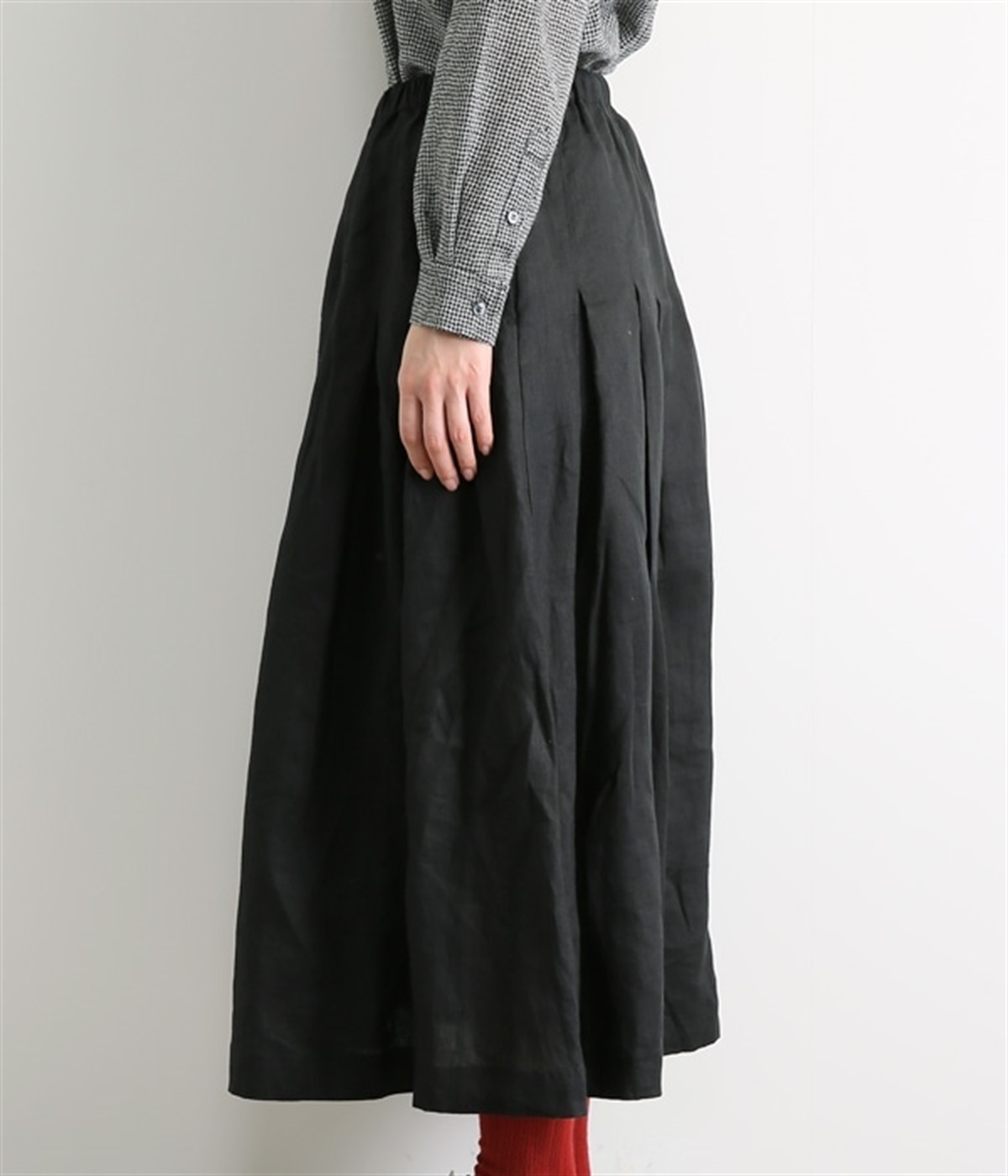 上品な光沢と、目の詰まったハリ感のあるリネンオックス生地で仕立てたミモレ丈スカートです。ウエスト下にタックを施したボリュームシルエットが魅力的。シンプルなのでトップスやシューズによって、カジュアルにもキレイめにも合わせられるシーズンレスな1枚です。ウエストは総ゴムで内側の紐によって調節も可能です。同素材のジャケットと合わせてセットアップで着用するのもおすすめです。両サイドにはポケット付きです。